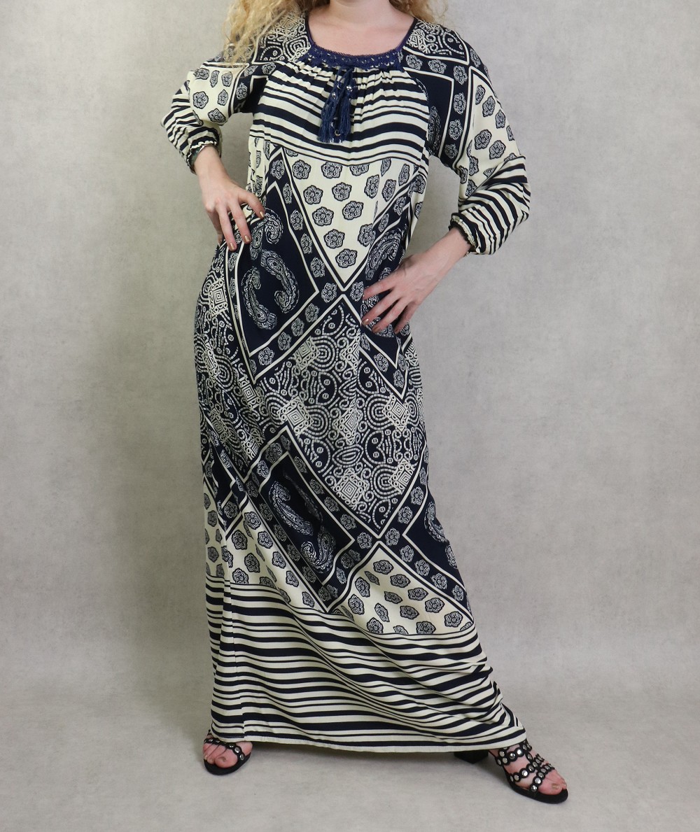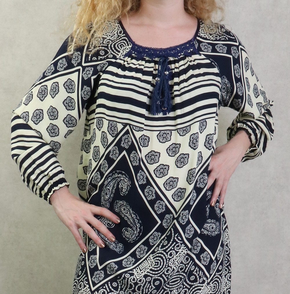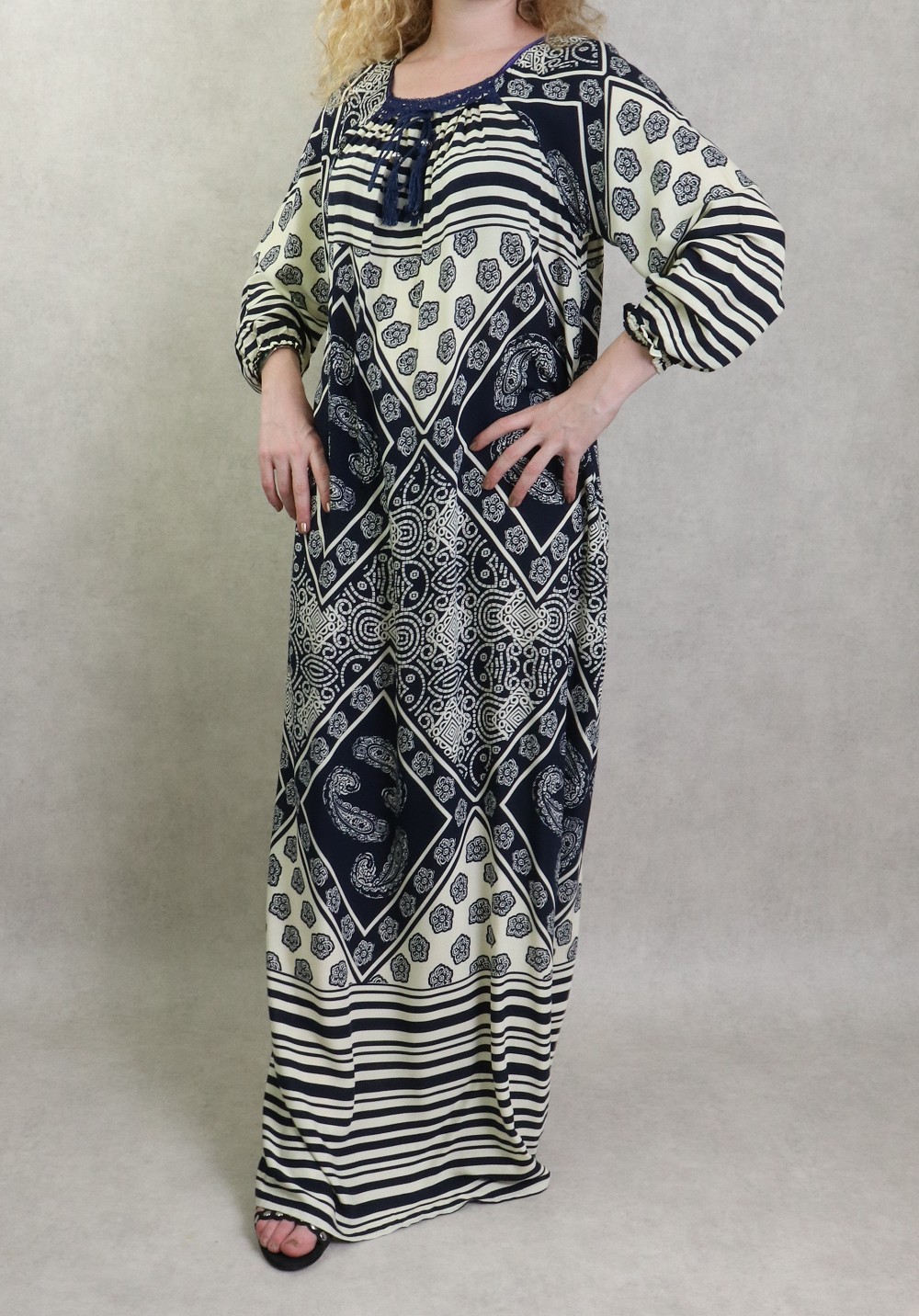 Robe d’intérieur avec motifs sur un fond crème. Col dégagé avec broderie et pompon, manches longues finition élastiques aux poignets, elle est douce et agréable à porter.