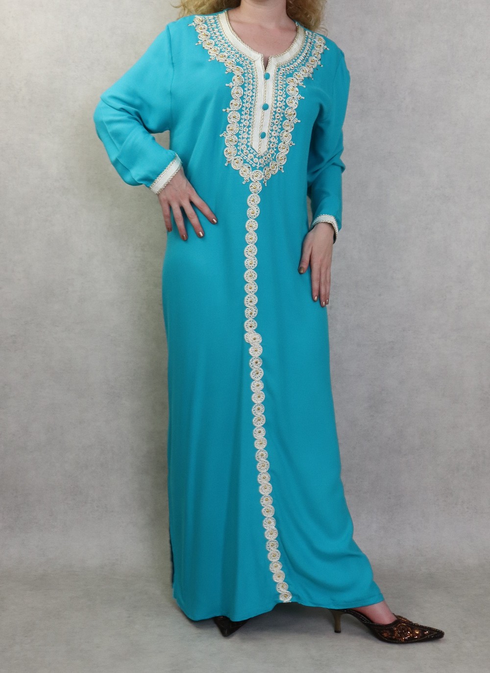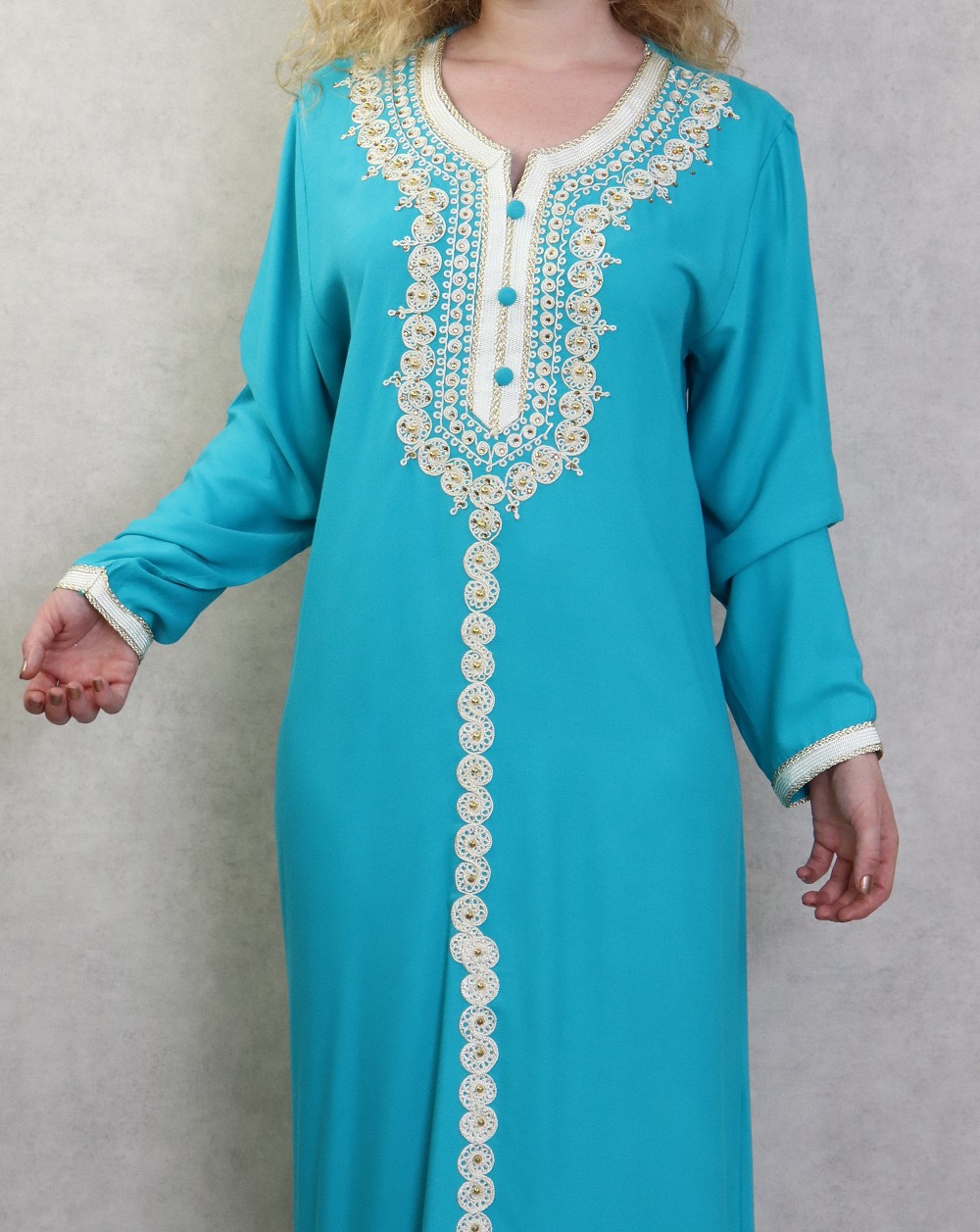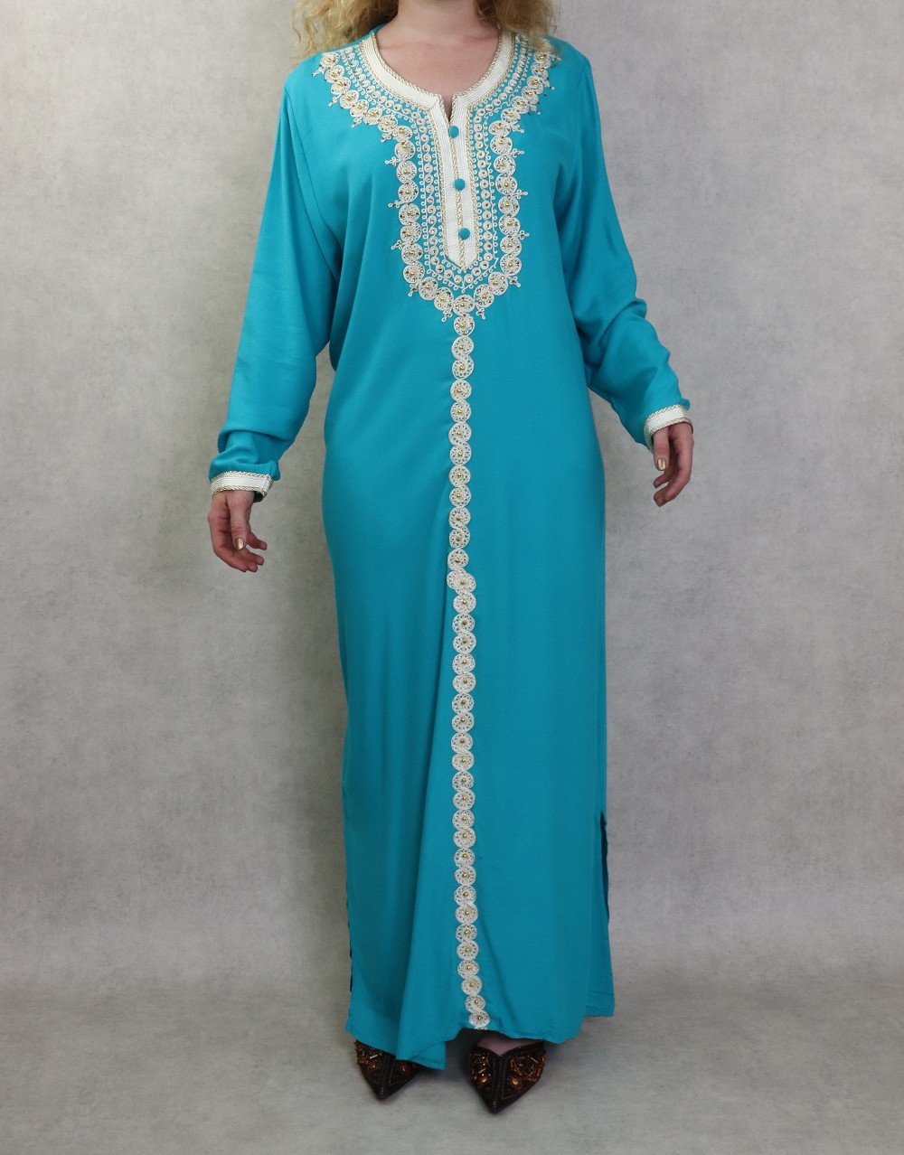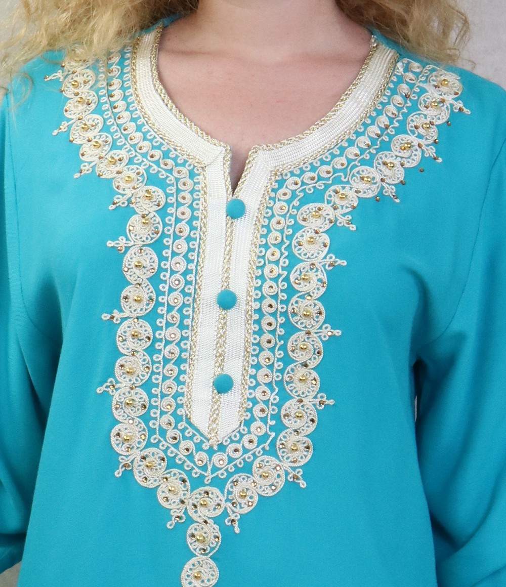 Robe longue avec broderies et strass style caftan marocaine pour femme - Couleur Bleu turquoise Vetement & Accessoire