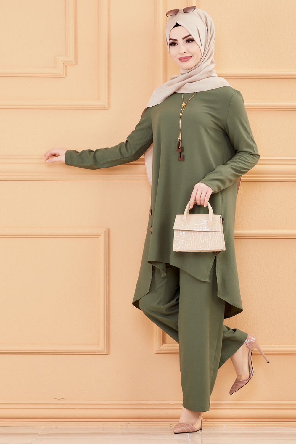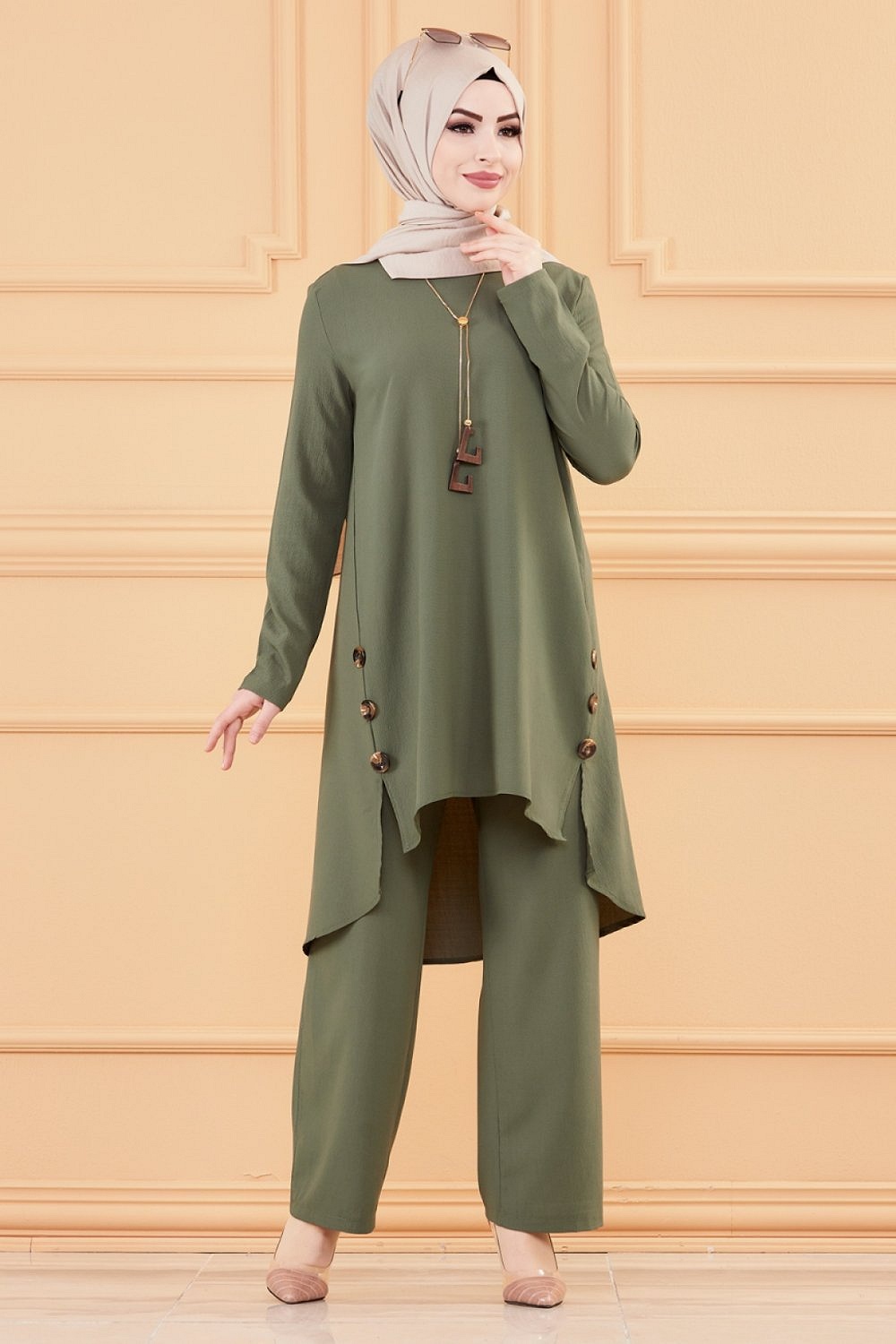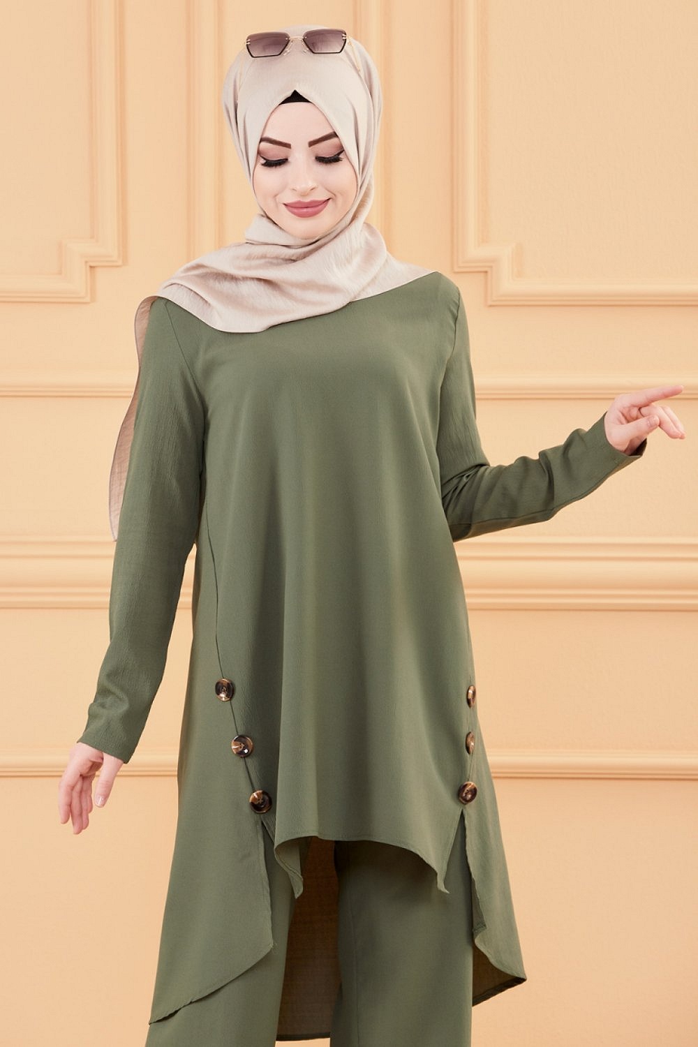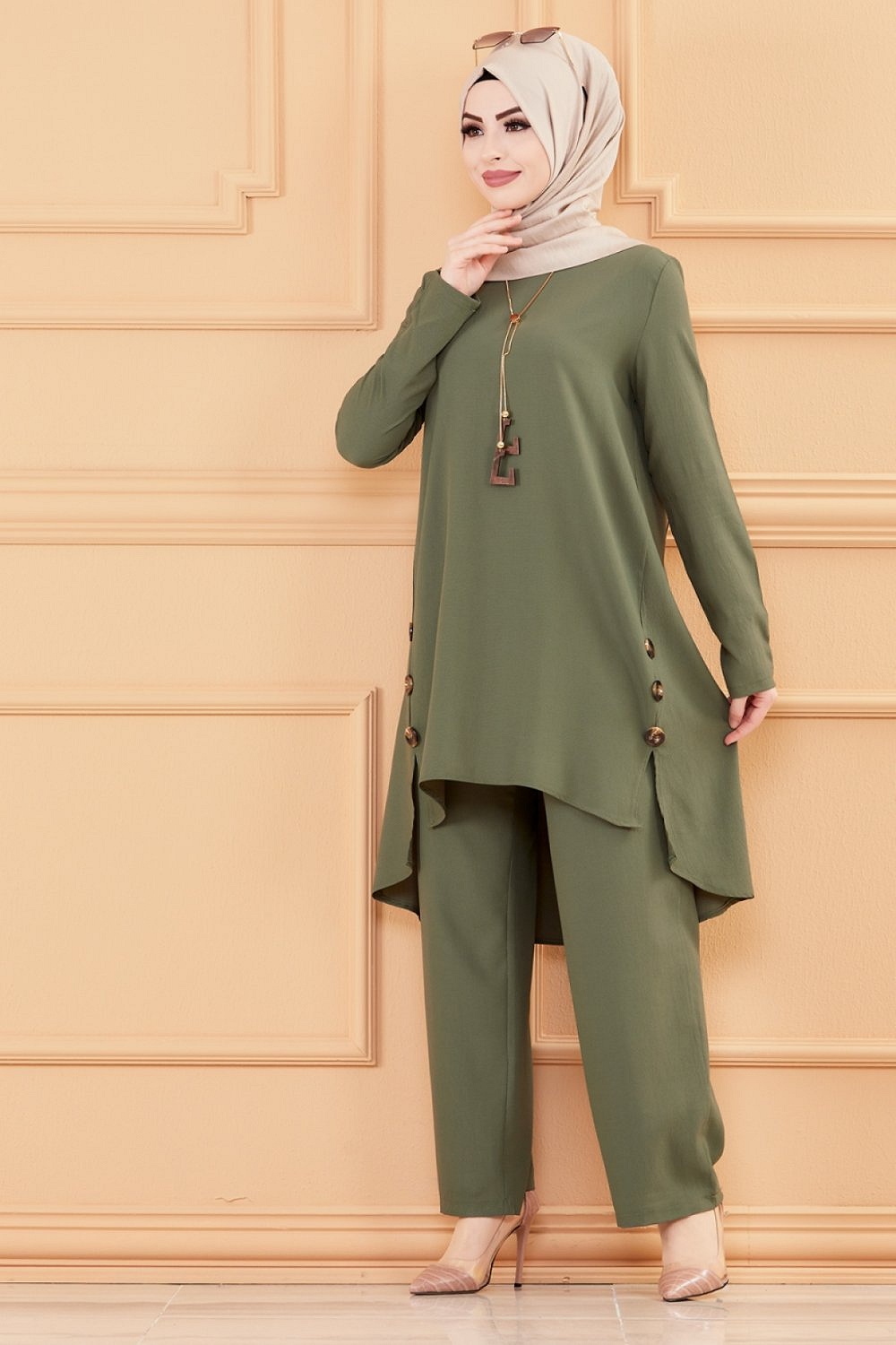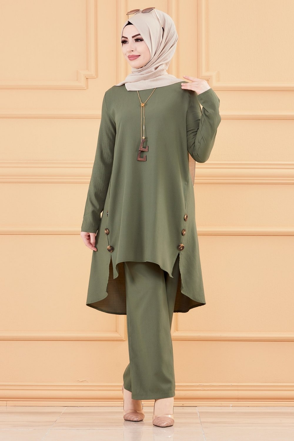 Ensemble femme deux pièces : Tunique évasée et Pantalon assorti (Tenue habillée pour hijab) - Couleur kaki Vetement & Accessoire