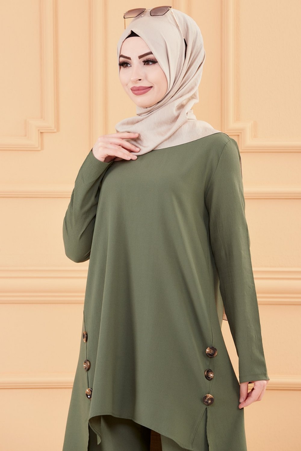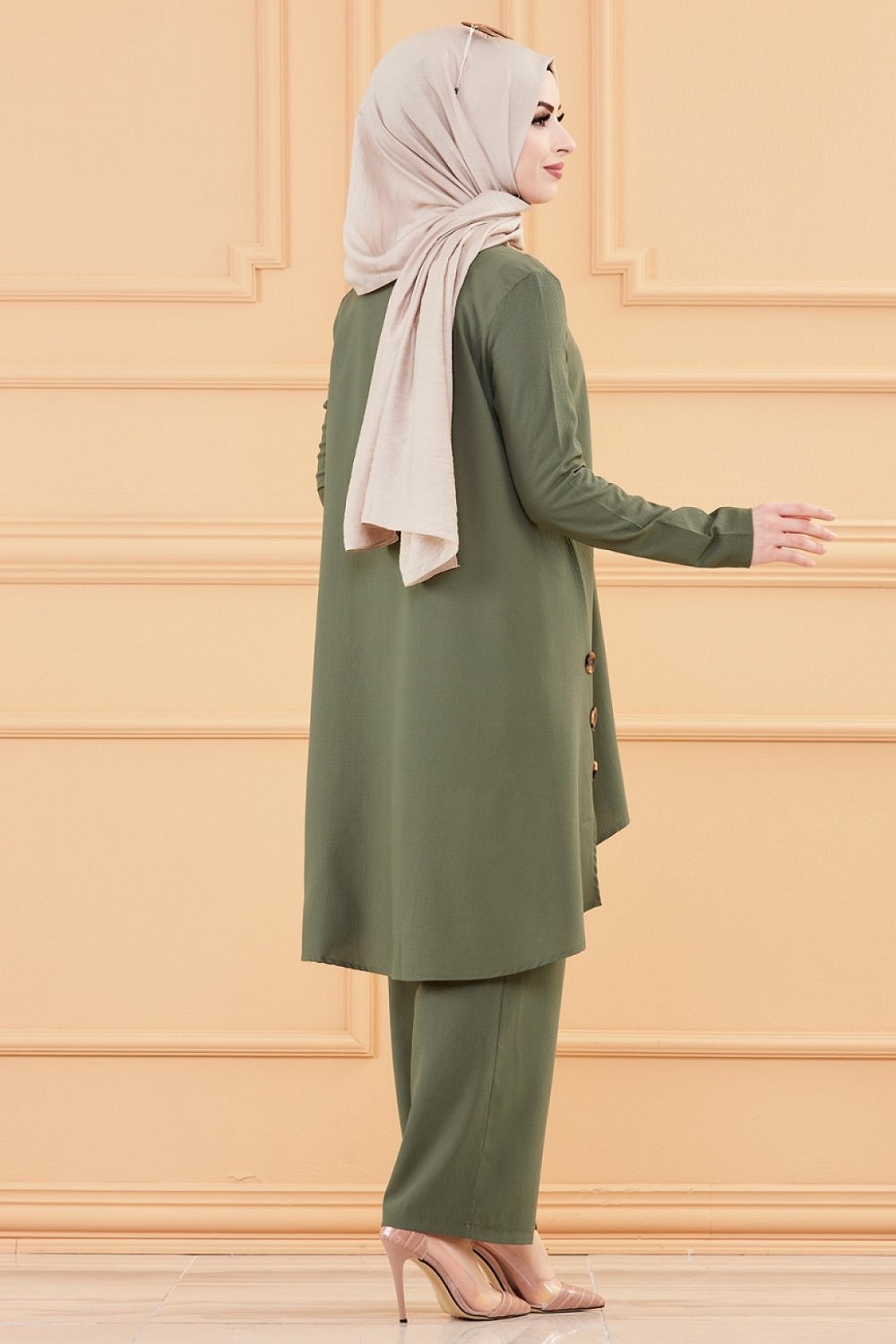 Ensemble femme deux pieces : Tunique evasee et Pantalon assorti (Tenue habillee pour hijab) - Couleur kaki