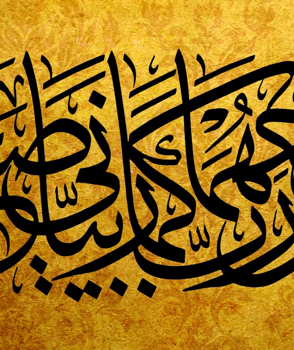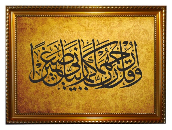 Tableau avec la calligraphie artistique du verset coranique qui ordonne la bienfaisance envers les parents (Bir al wâlidayn) : { et dis : "ô mon Seigneur, fais-leur; à tous deux; miséricorde comme ils m'ont élevé tout petit". } Sourate Al Isrâ' verset 24.