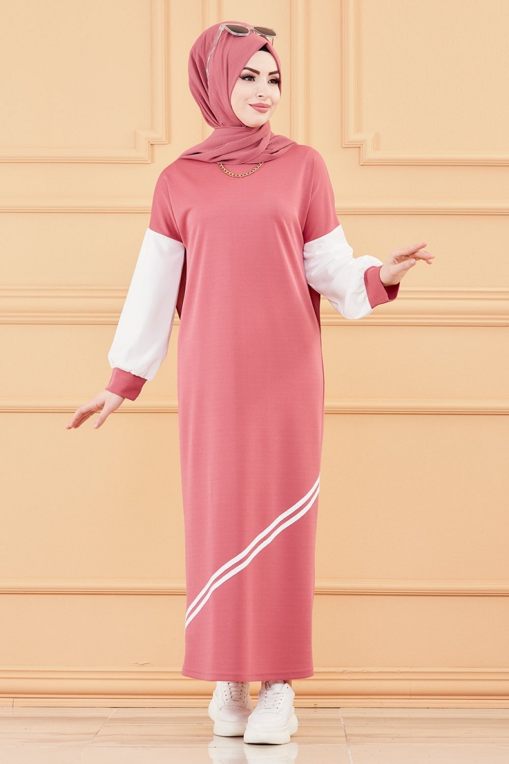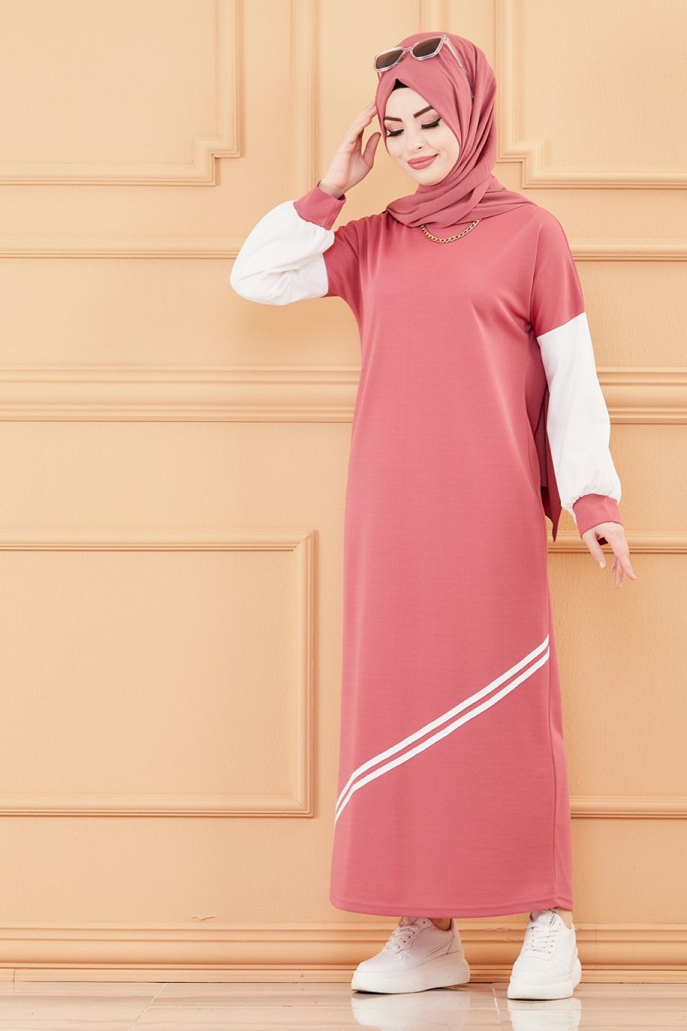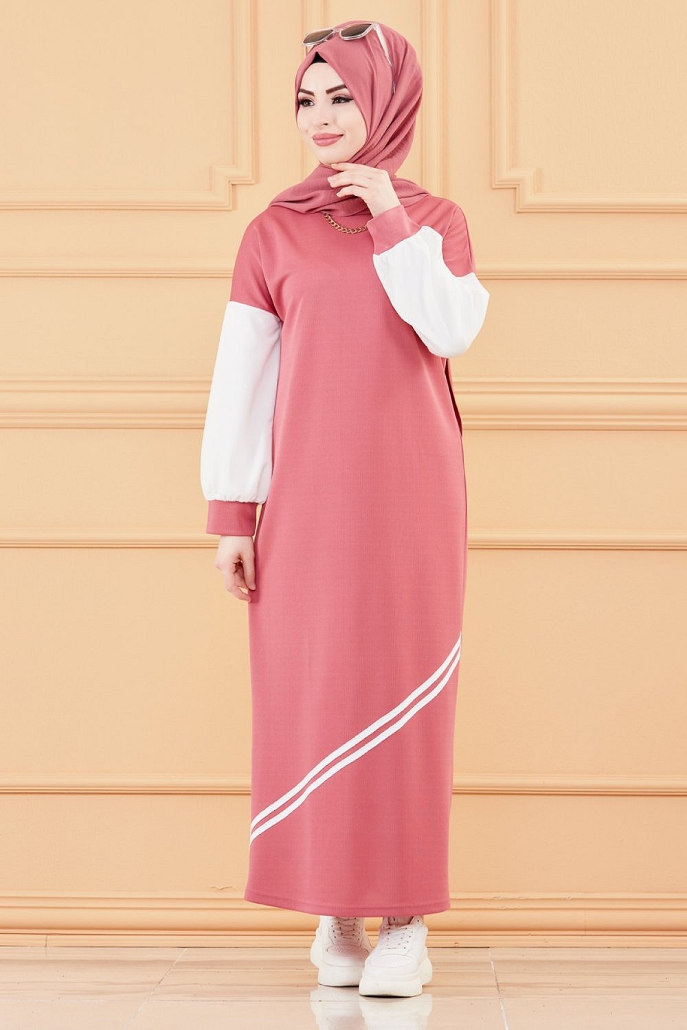 Robe moderne style decontracte (Vetements modernes pour femmes musulmanes) - Couleur rose et blanc