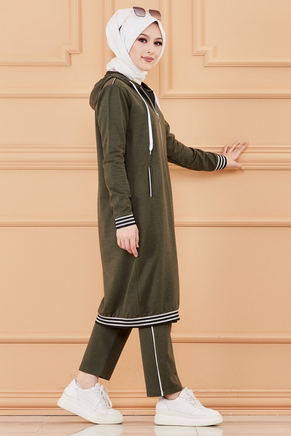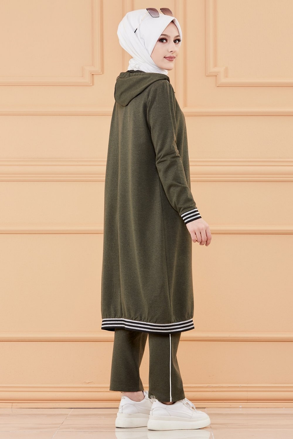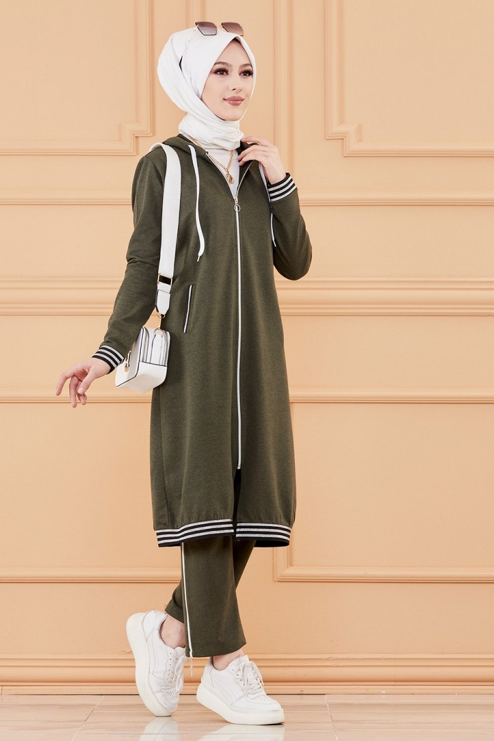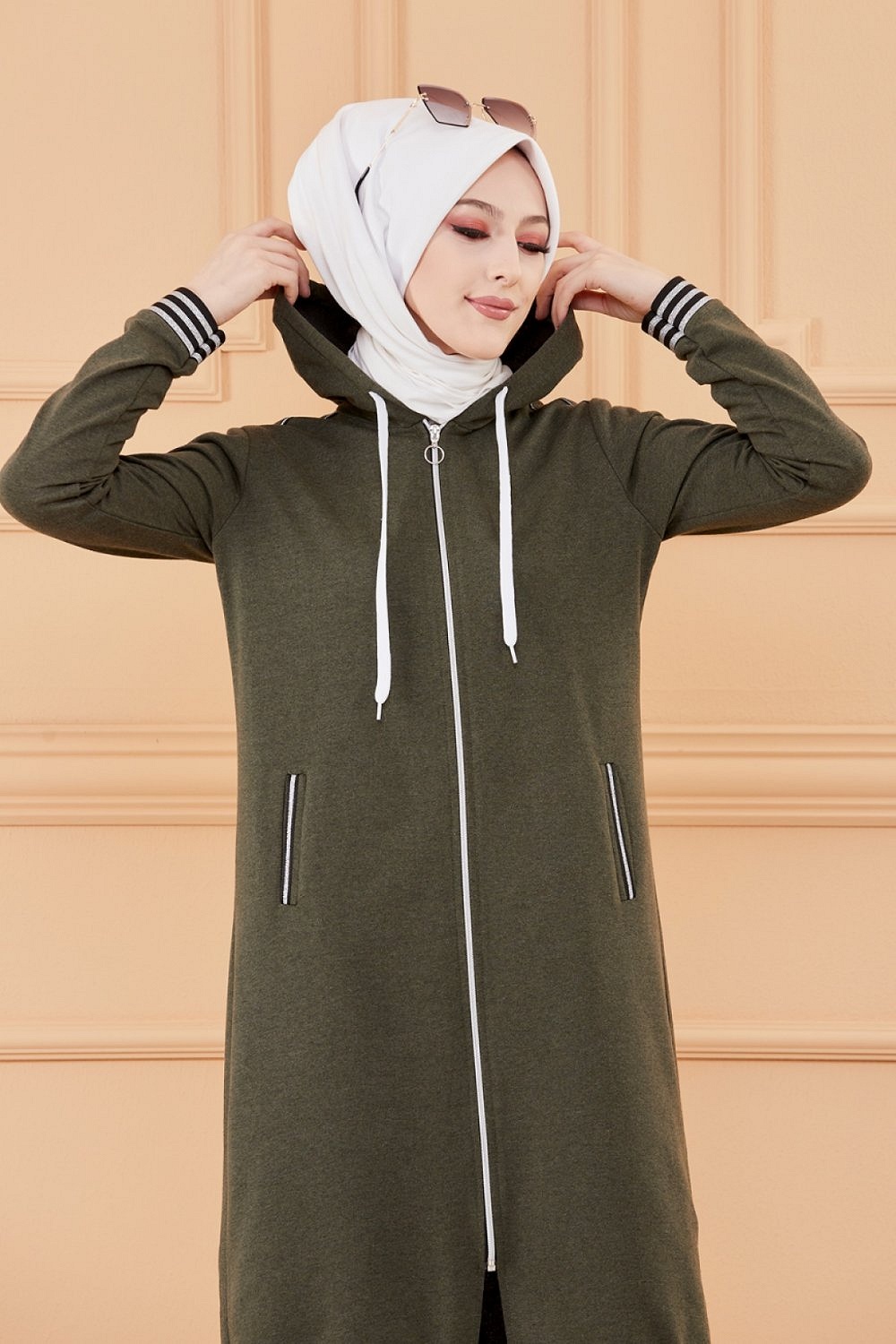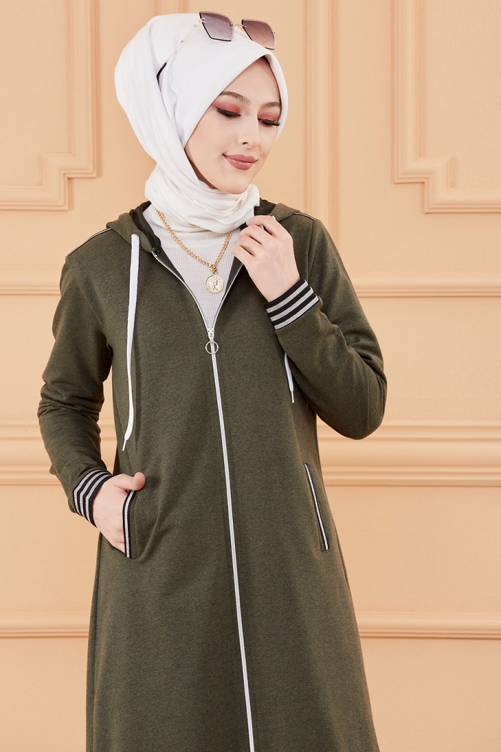 Bandes décoratives noires argentés... Veste longue zippée avec capuche.