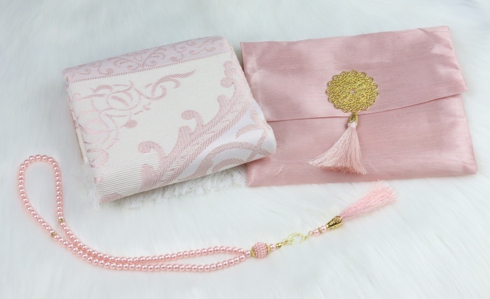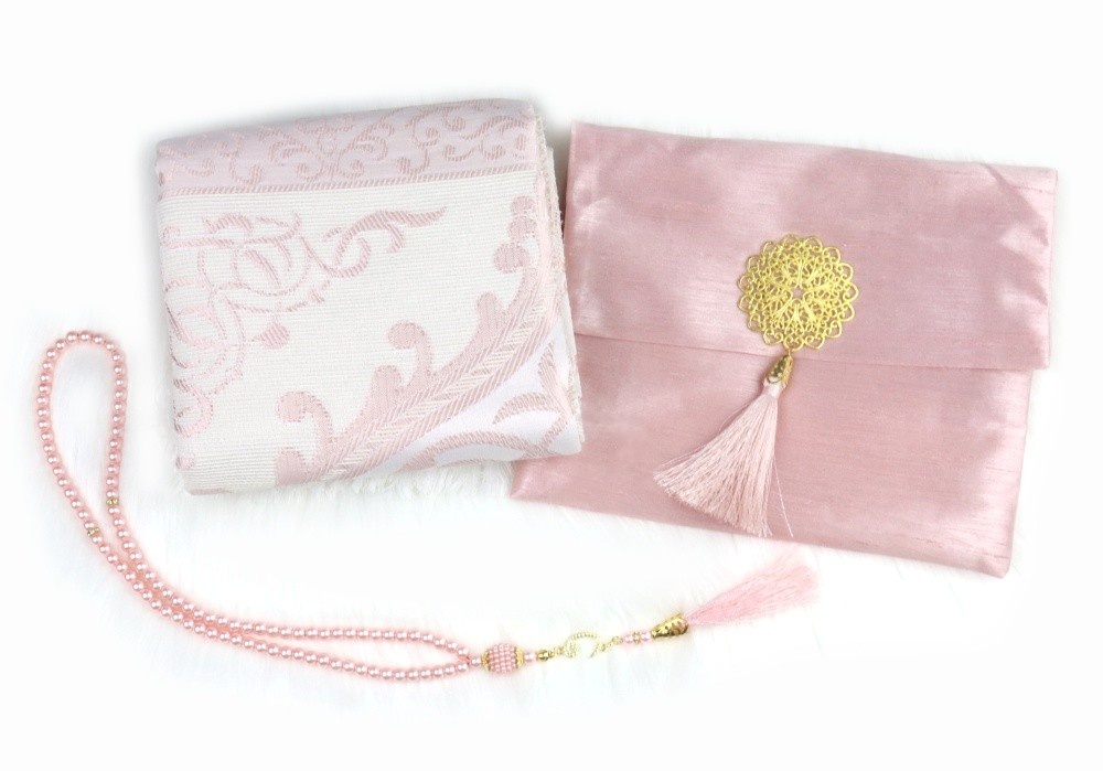 Belle sacoche cadeau en tissu brillant avec médaillon métallique doré et son pompon en sabra contenant un tapis brodé et un chapelet 99 perles (Sebha) assorti.