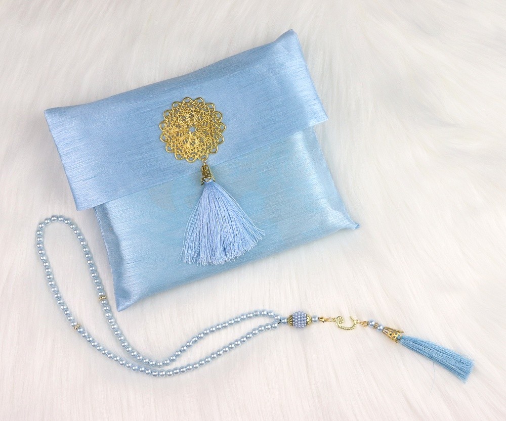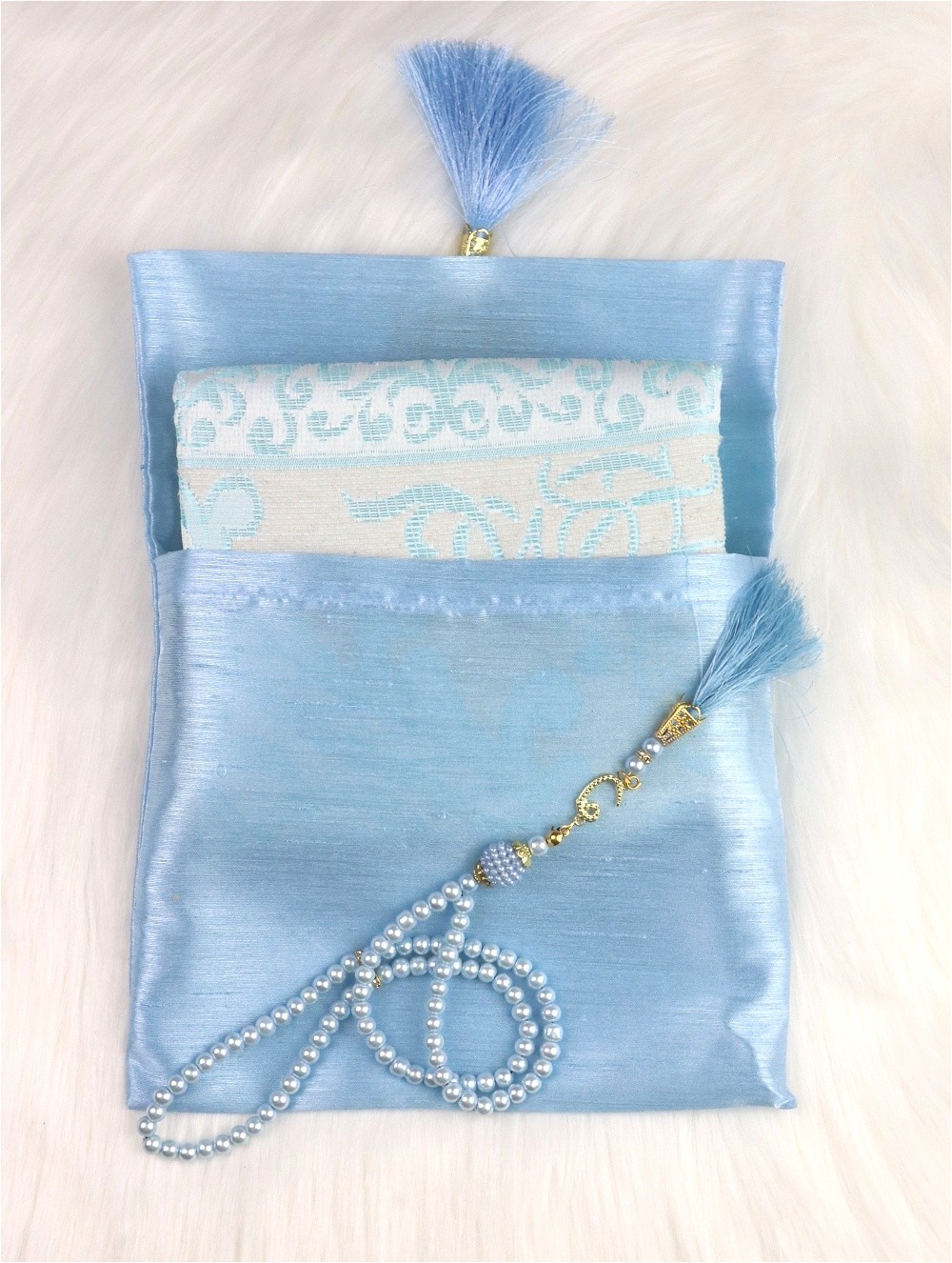 Sacoche cadeau : Pochette en tissu + Chapelet (Sebha) de luxe + Tapis de priere adulte - Couleur bleu ciel