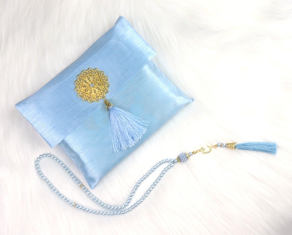 Sacoche cadeau : Pochette en tissu + Chapelet (Sebha) de luxe + Tapis de prière adulte - Couleur bleu ciel Deco & Cadeau
