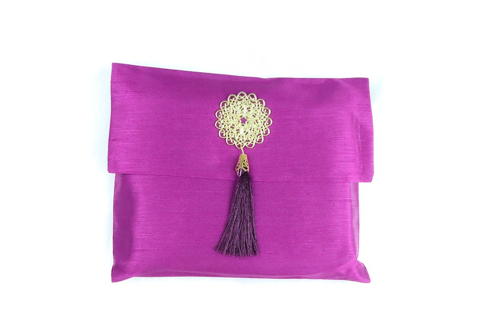 Belle sacoche cadeau en tissu brillant avec médaillon métallique doré et son pompon en sabra contenant un tapis brodé (taille adulte) et un chapelet (Sebha) de 99 perles assorties.
