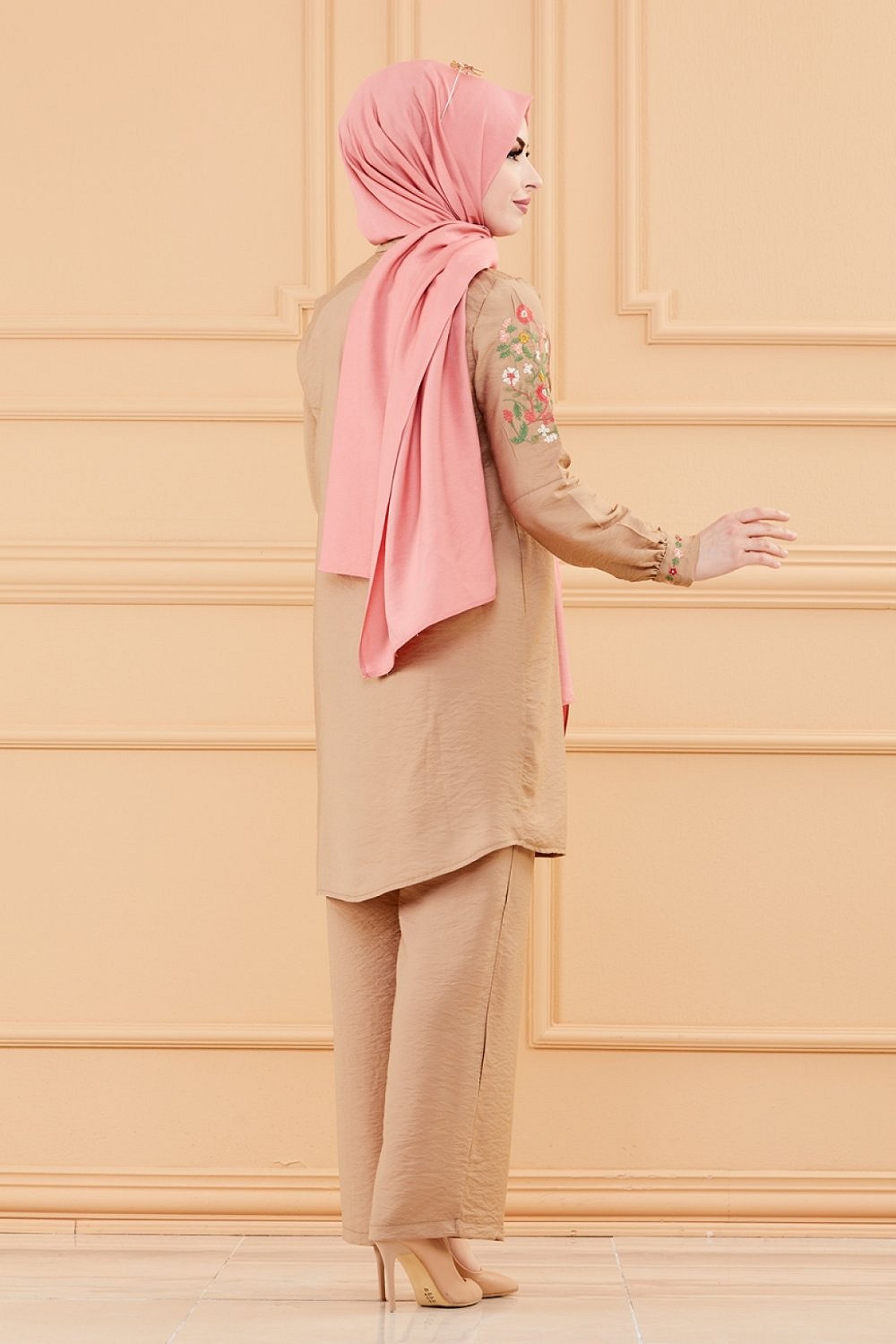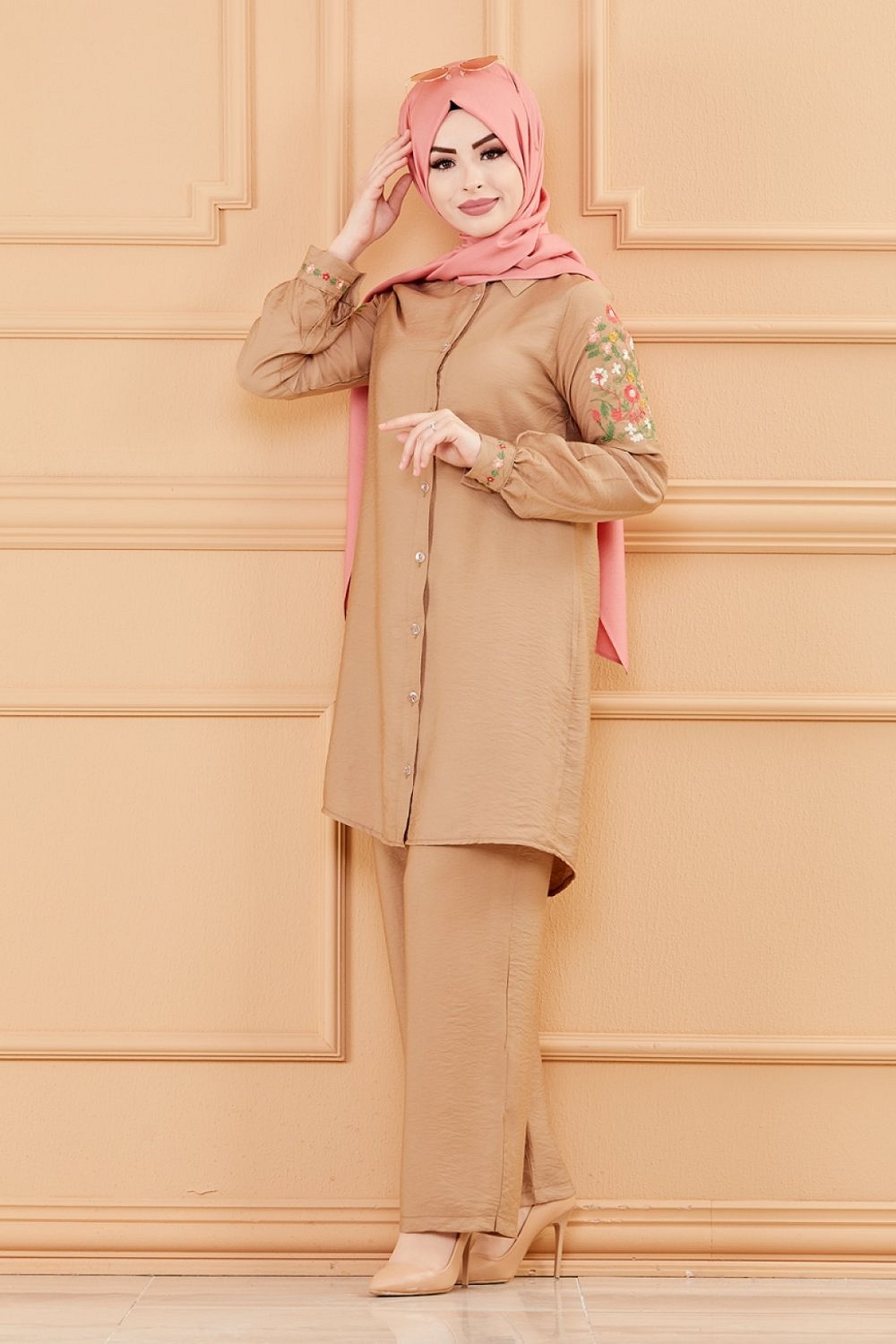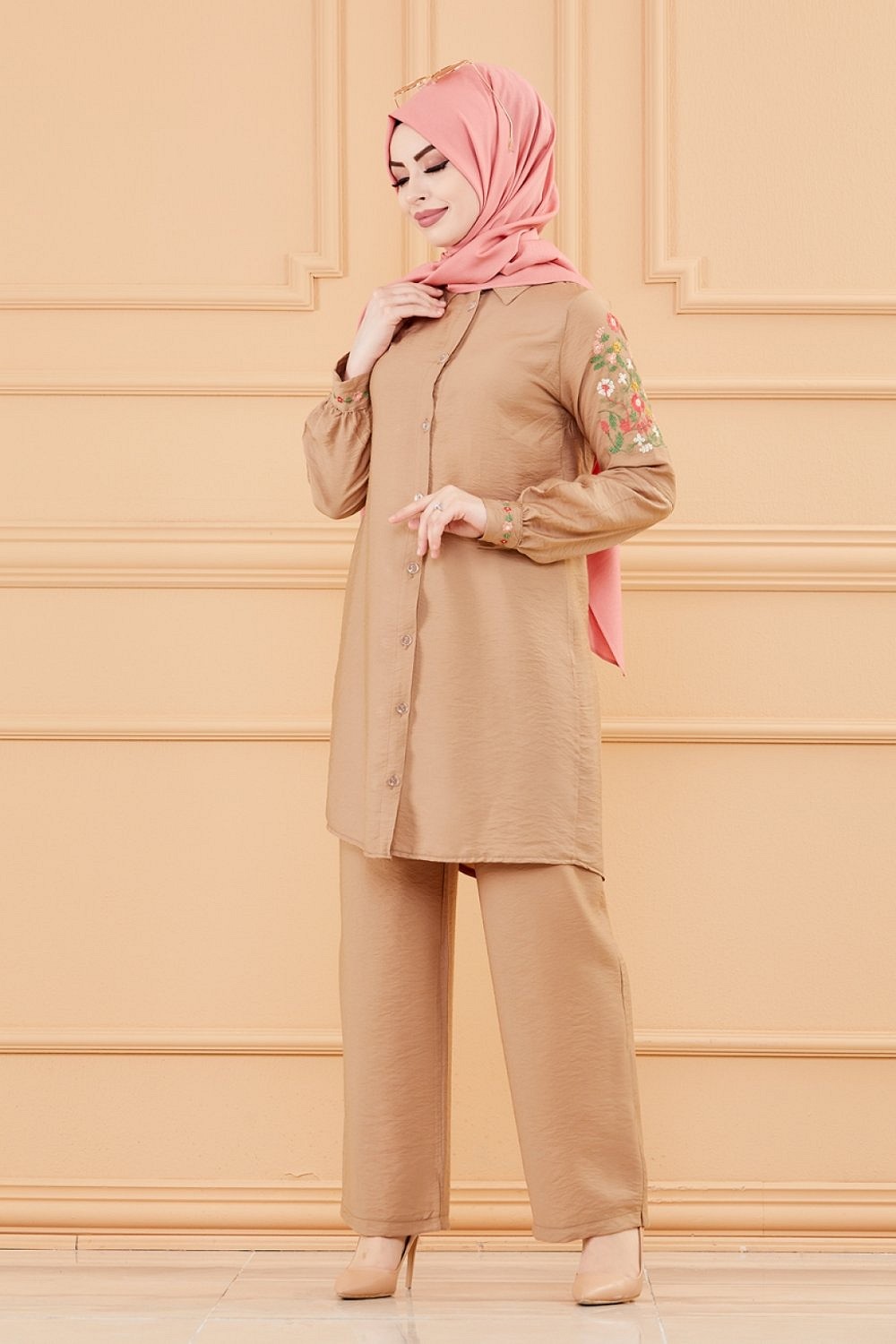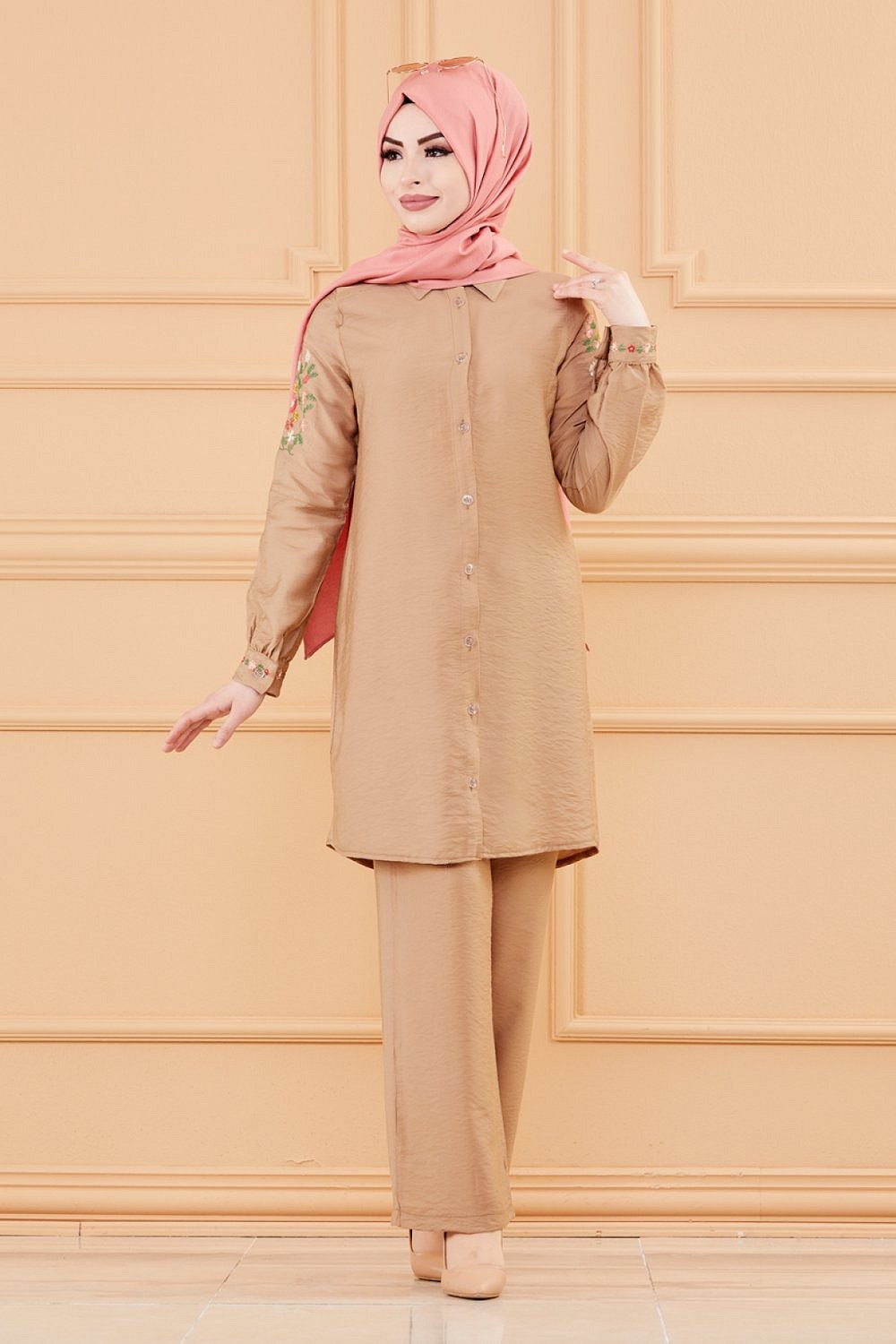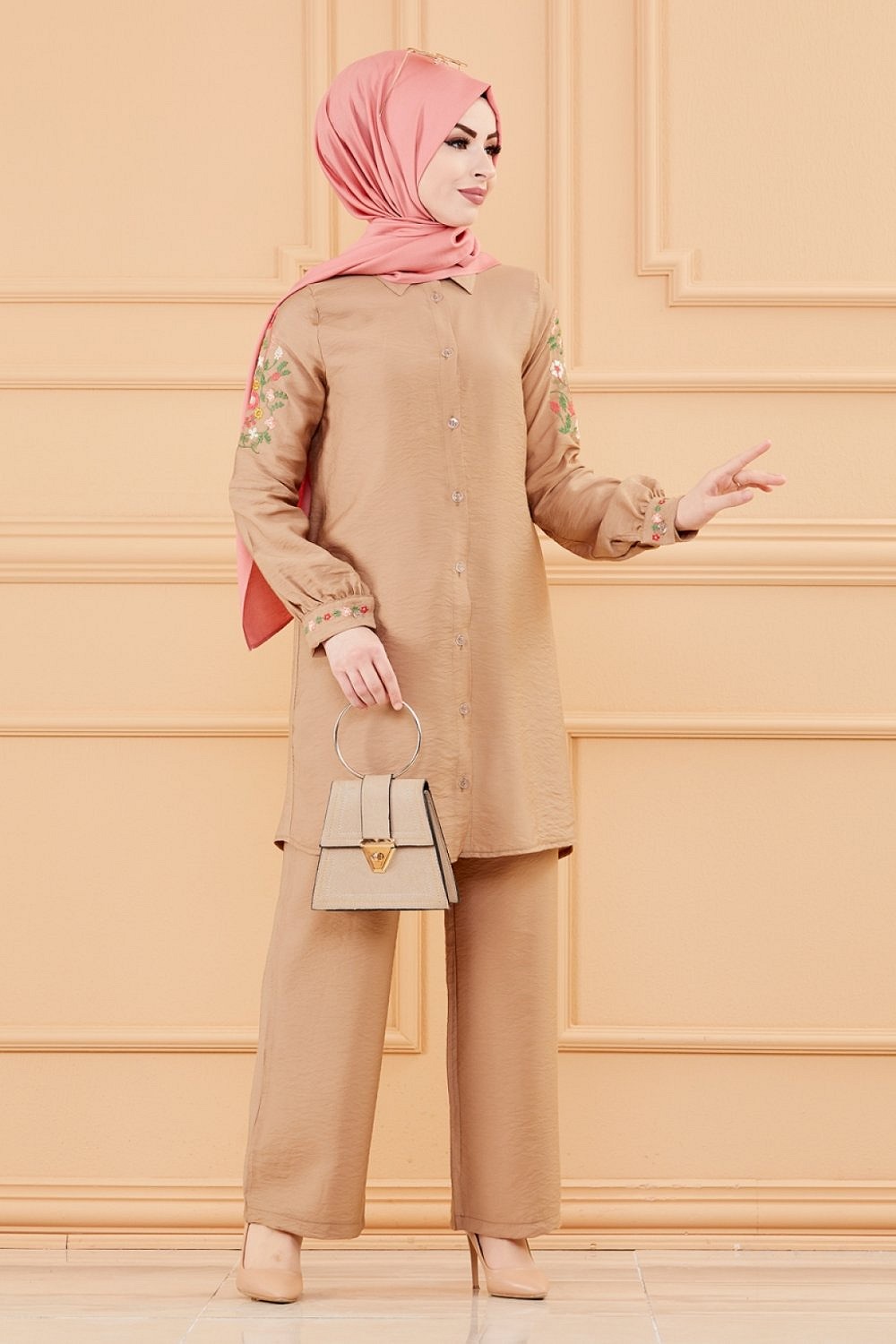 Ensemble style habille pour femme (tunique/chemise avec broderie et pantalon) - Couleur beige