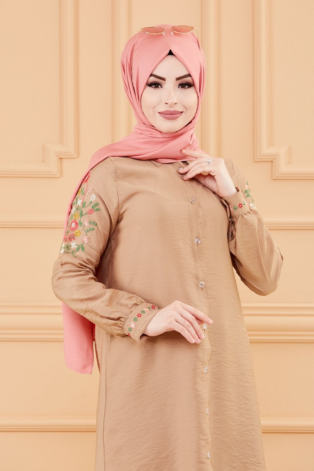 Chemise mi-longue fluide ample légèrement brillante (Chemises femme hijab mode musulmane) - Couleur Brique clair - REF. 34589 (26.90 €)