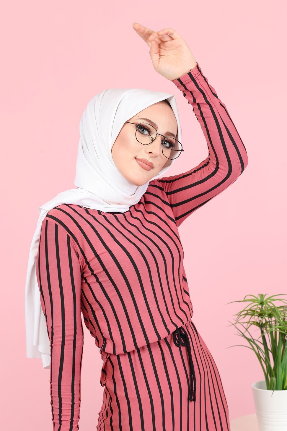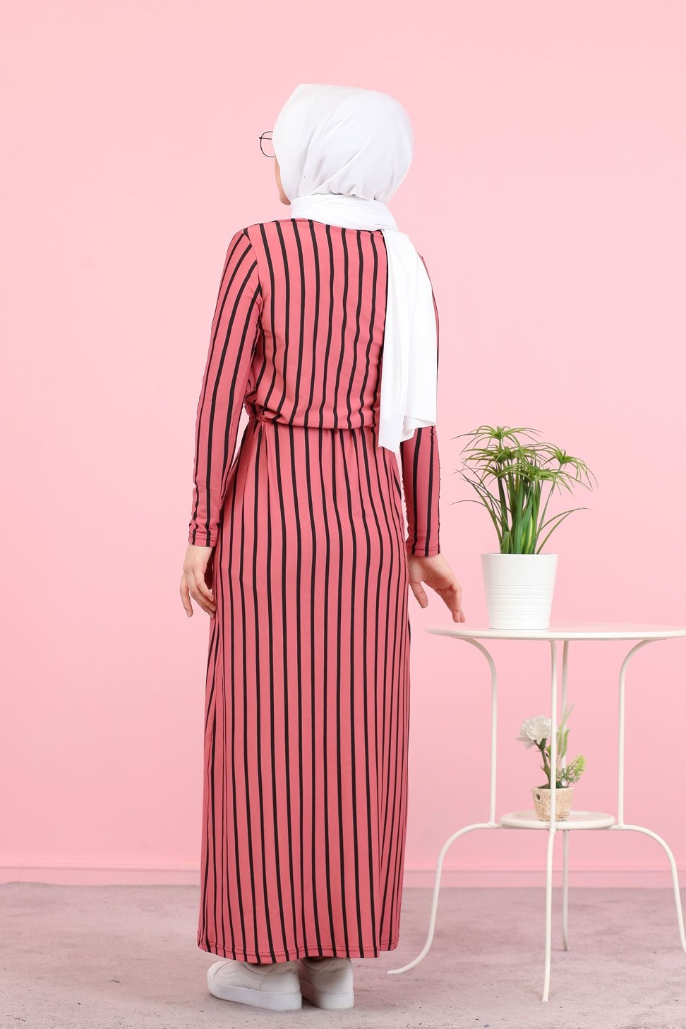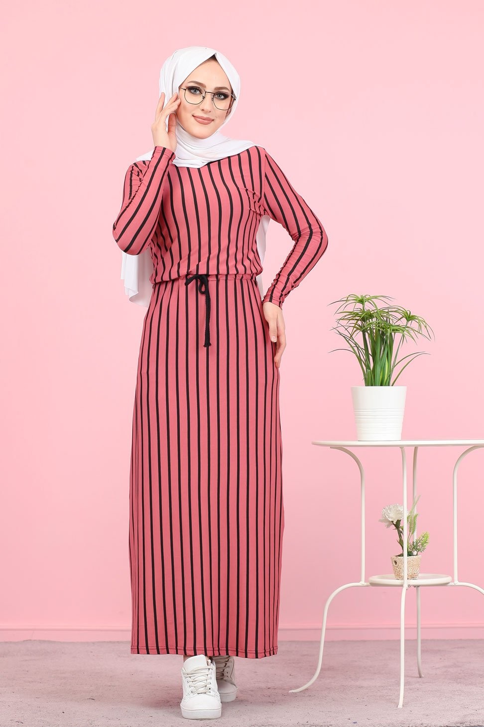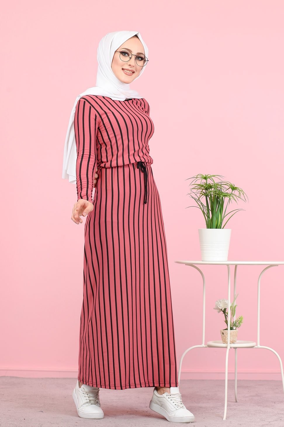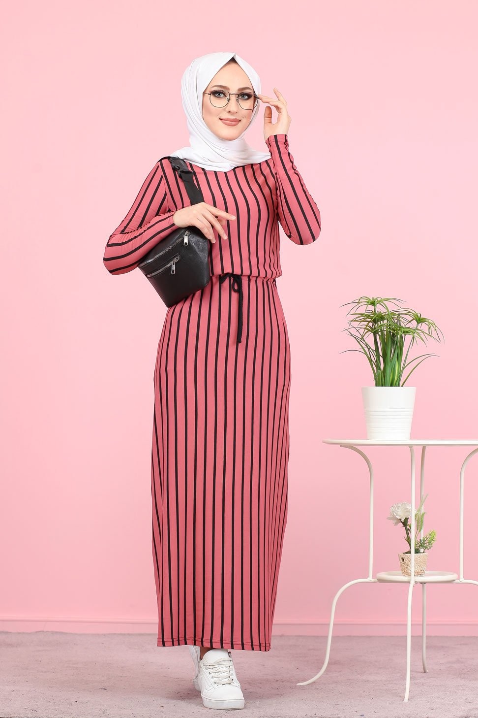 Robe maxi-longue à rayures noires mode décontracté ceinture intégrée - Couleur fuchsia Vetement & Accessoire