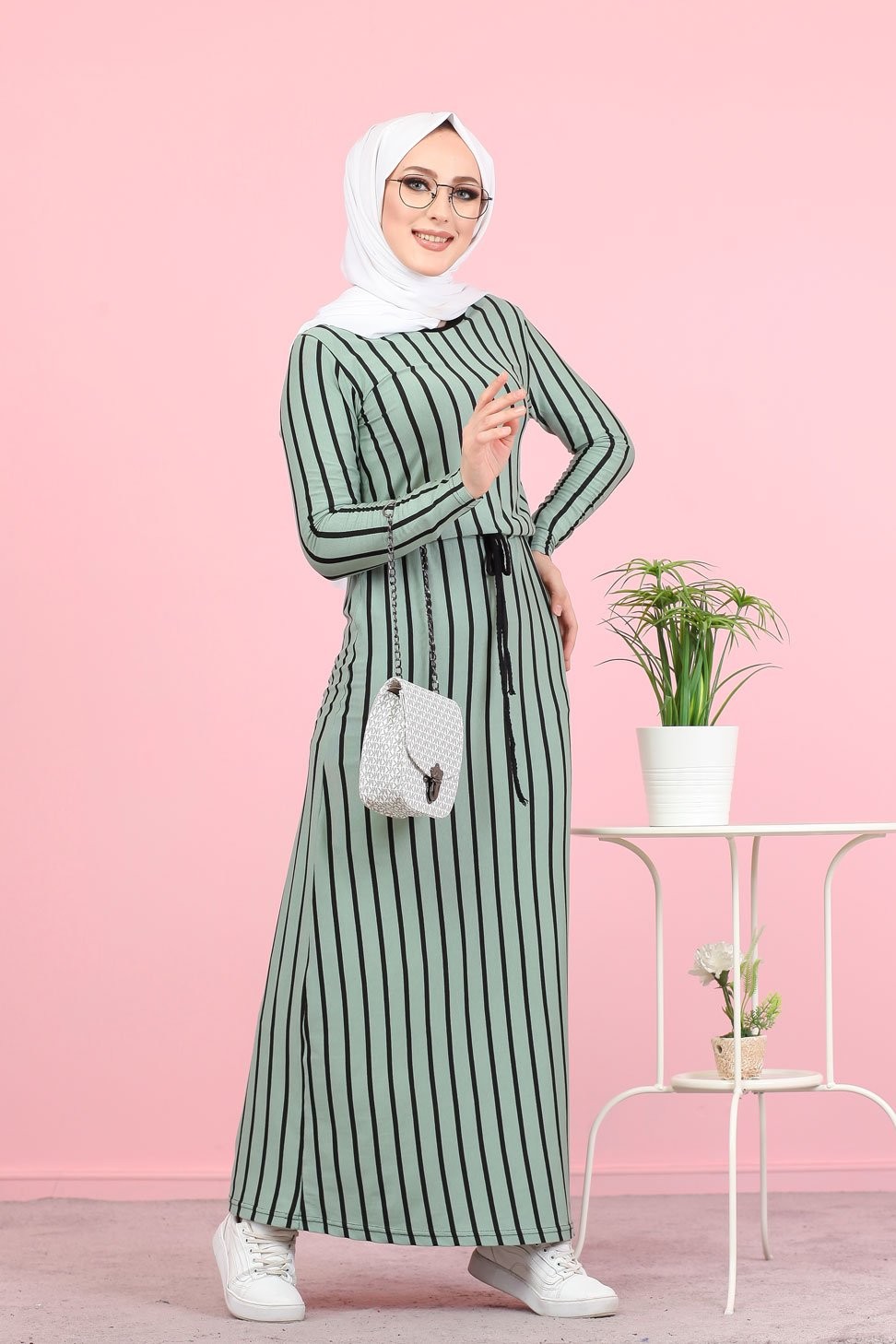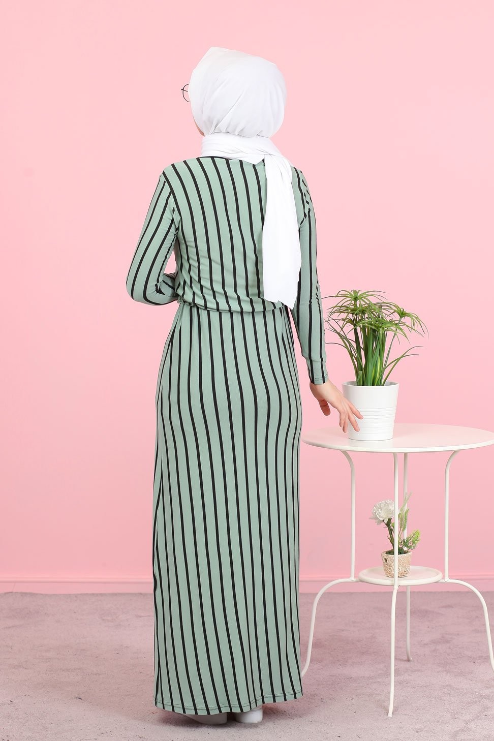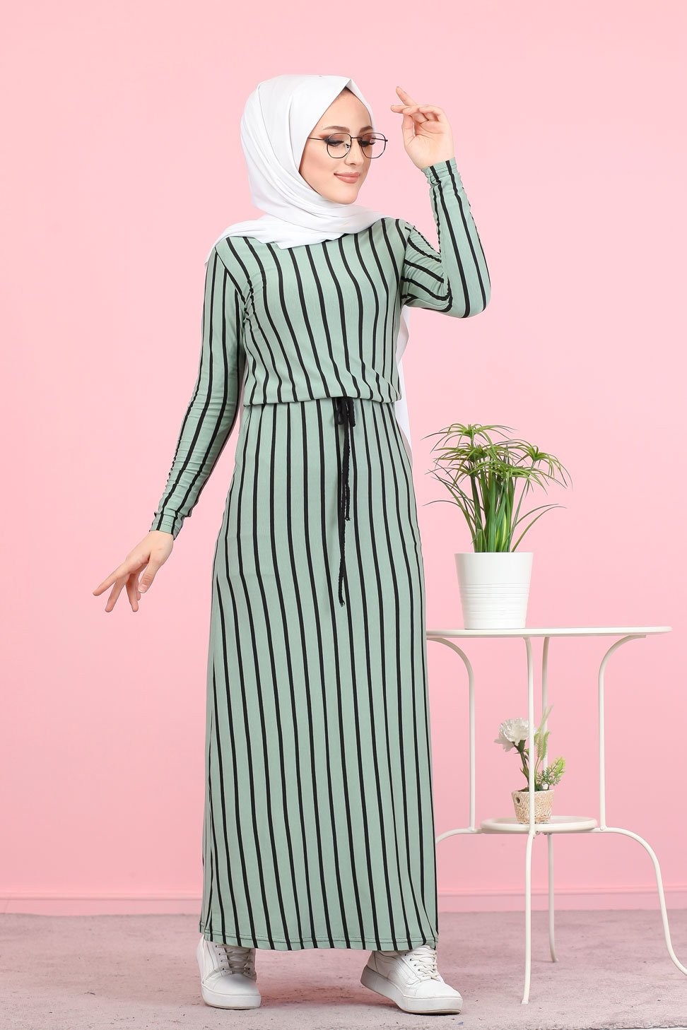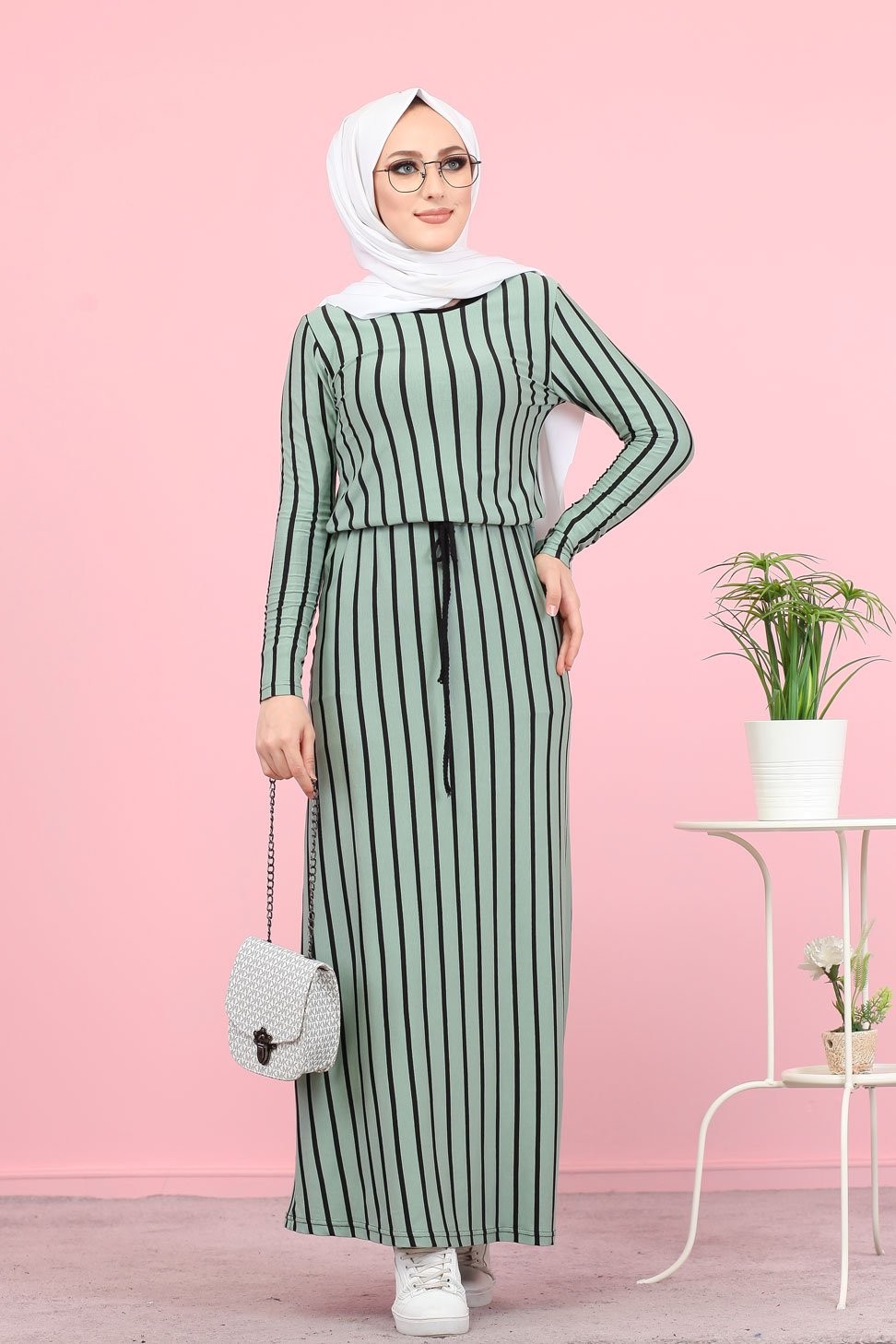 Robe longue col rond, lien de serrage à la taille, coupe droite.