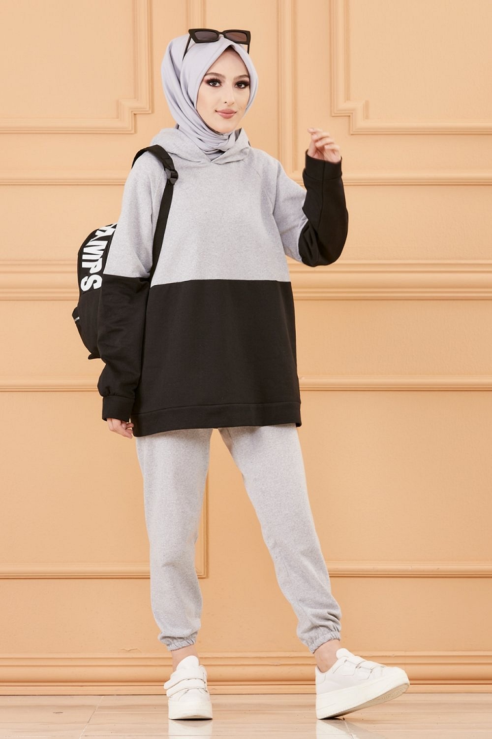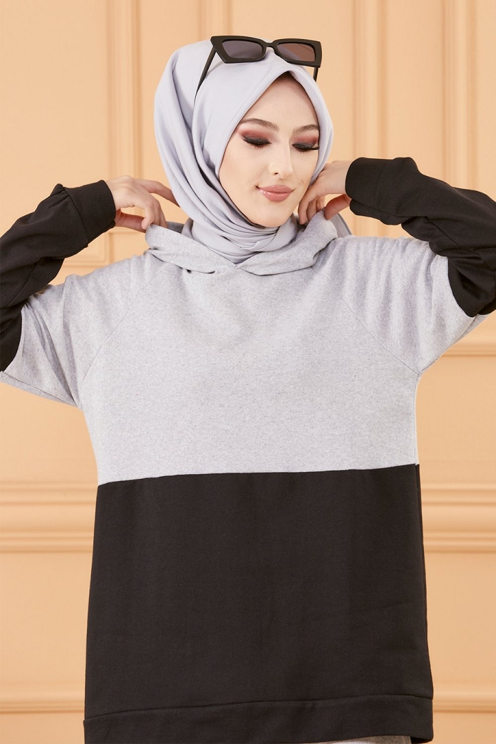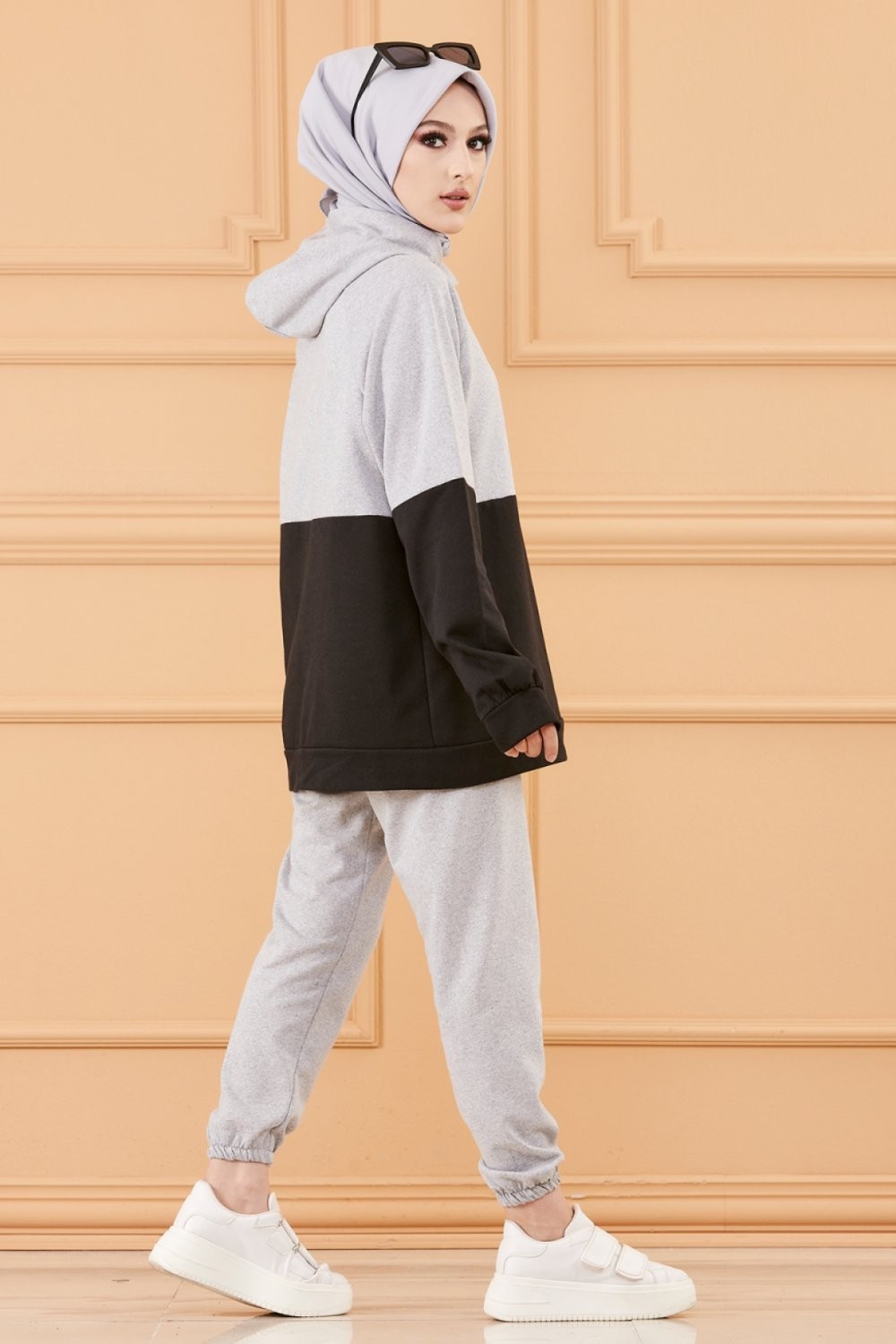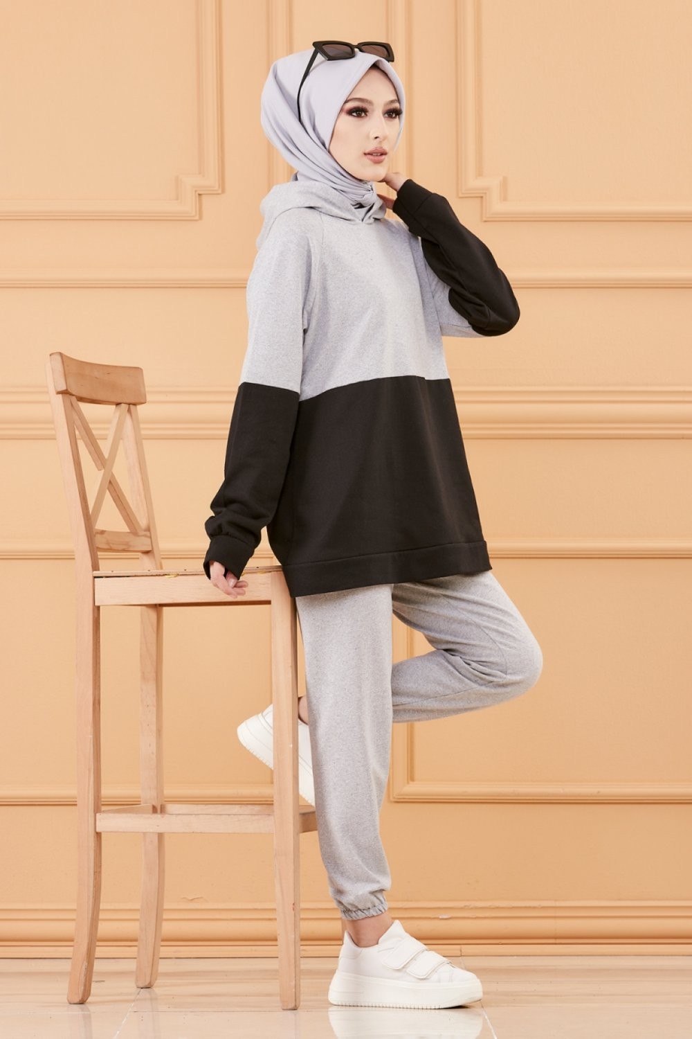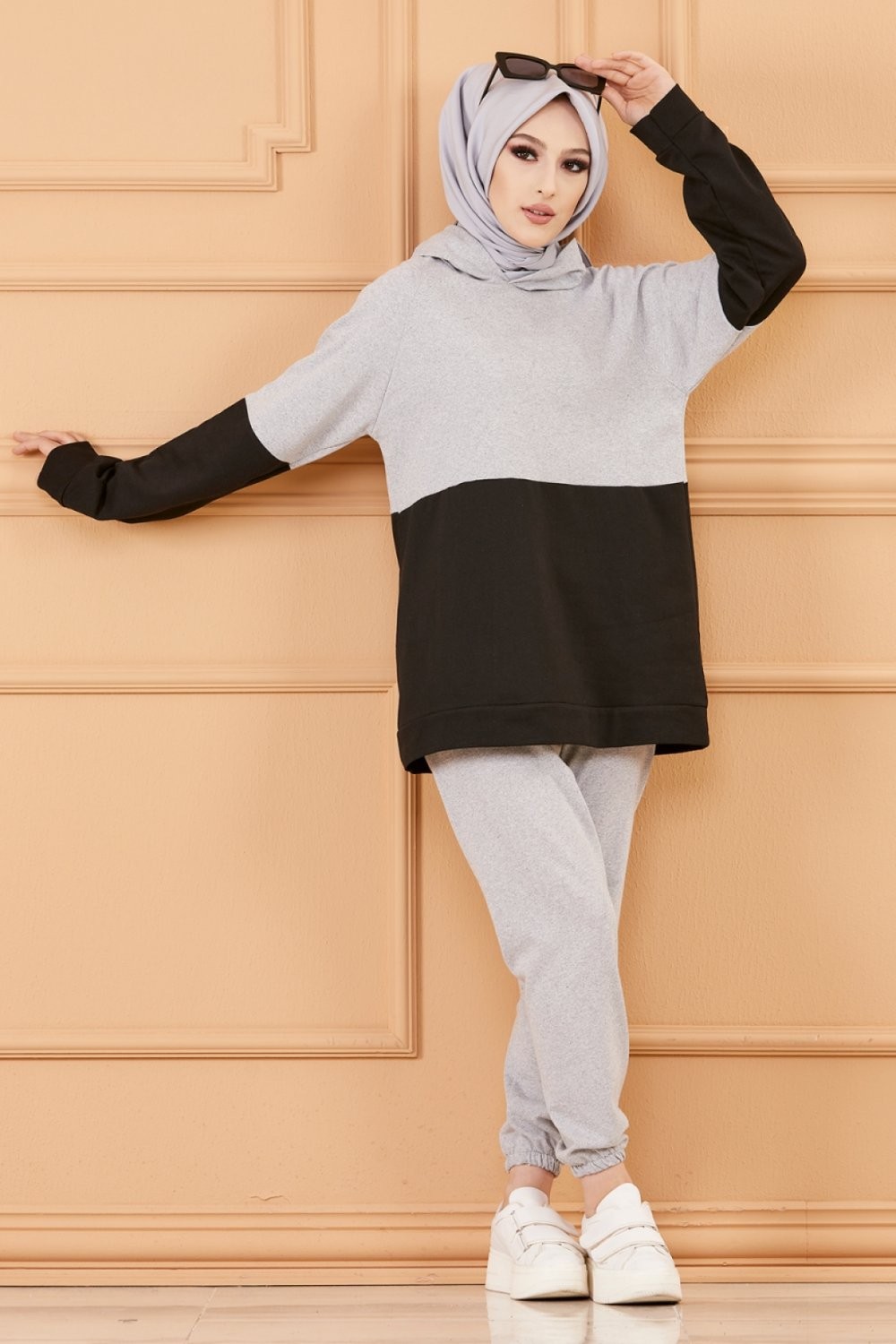 Ensemble bicolore pour femme : Tunique à capuche et pantalon assorti (Tenue décontractée et sport pour hijab) - Couleur gris et noir Vetement & Accessoire