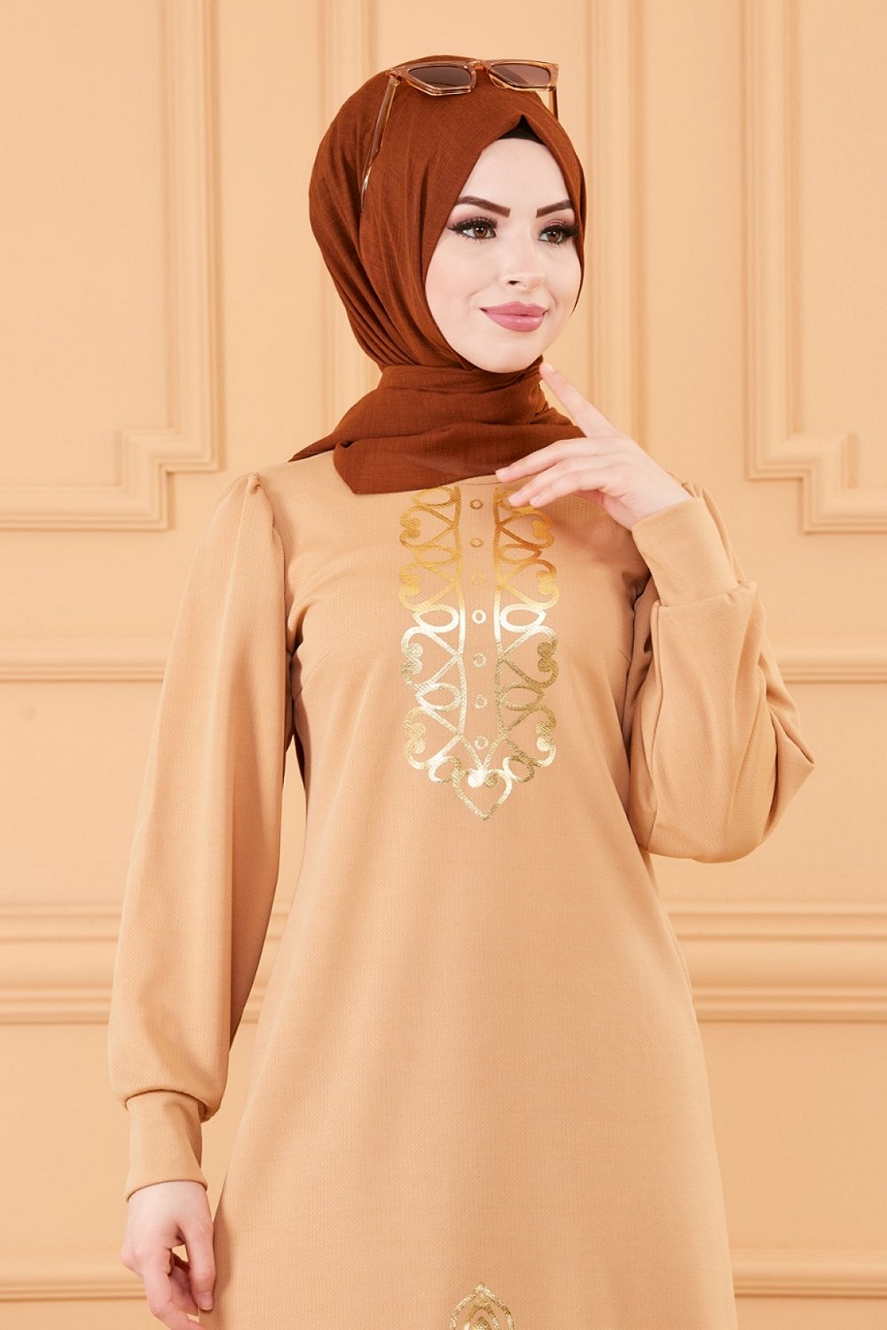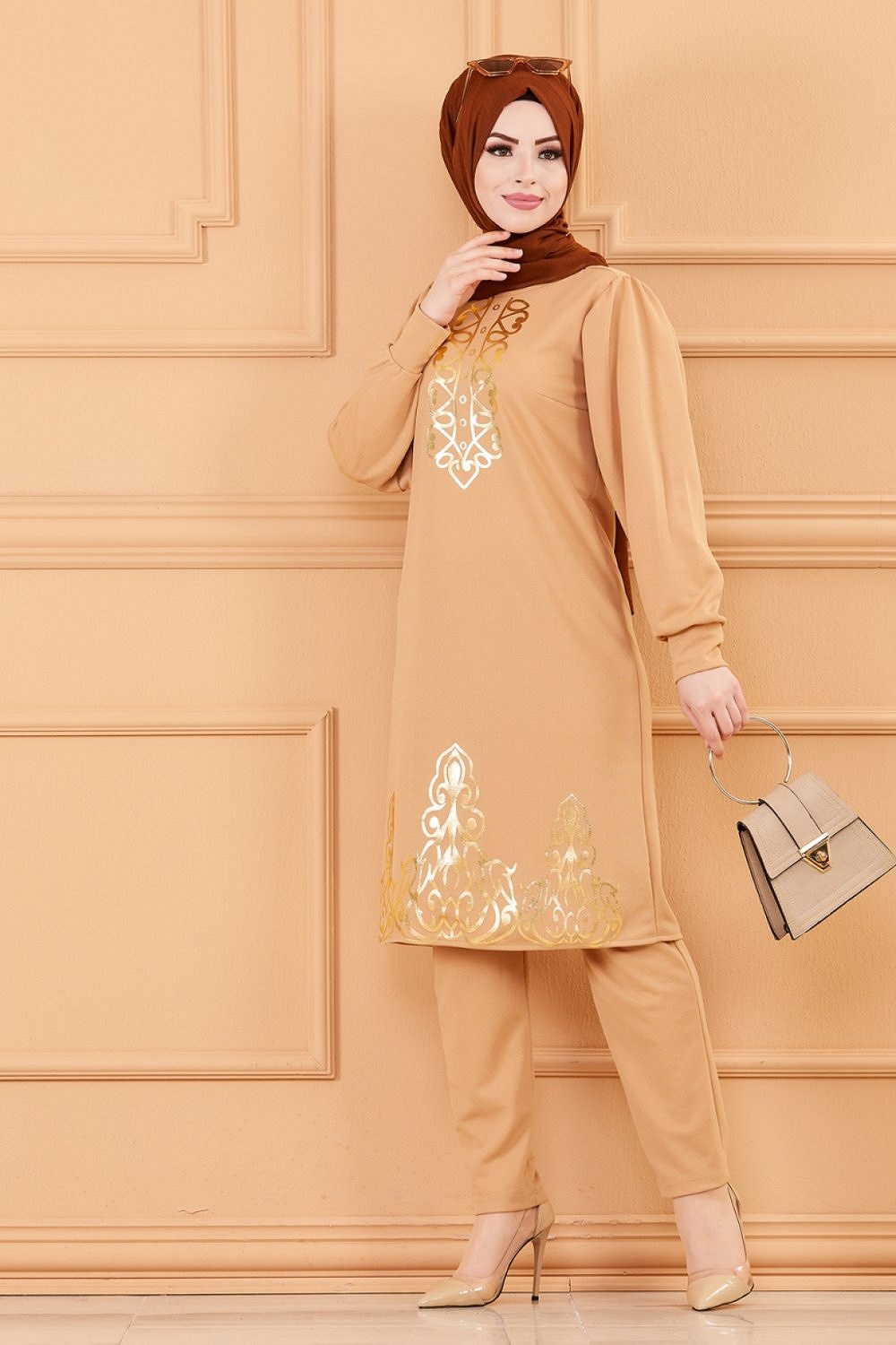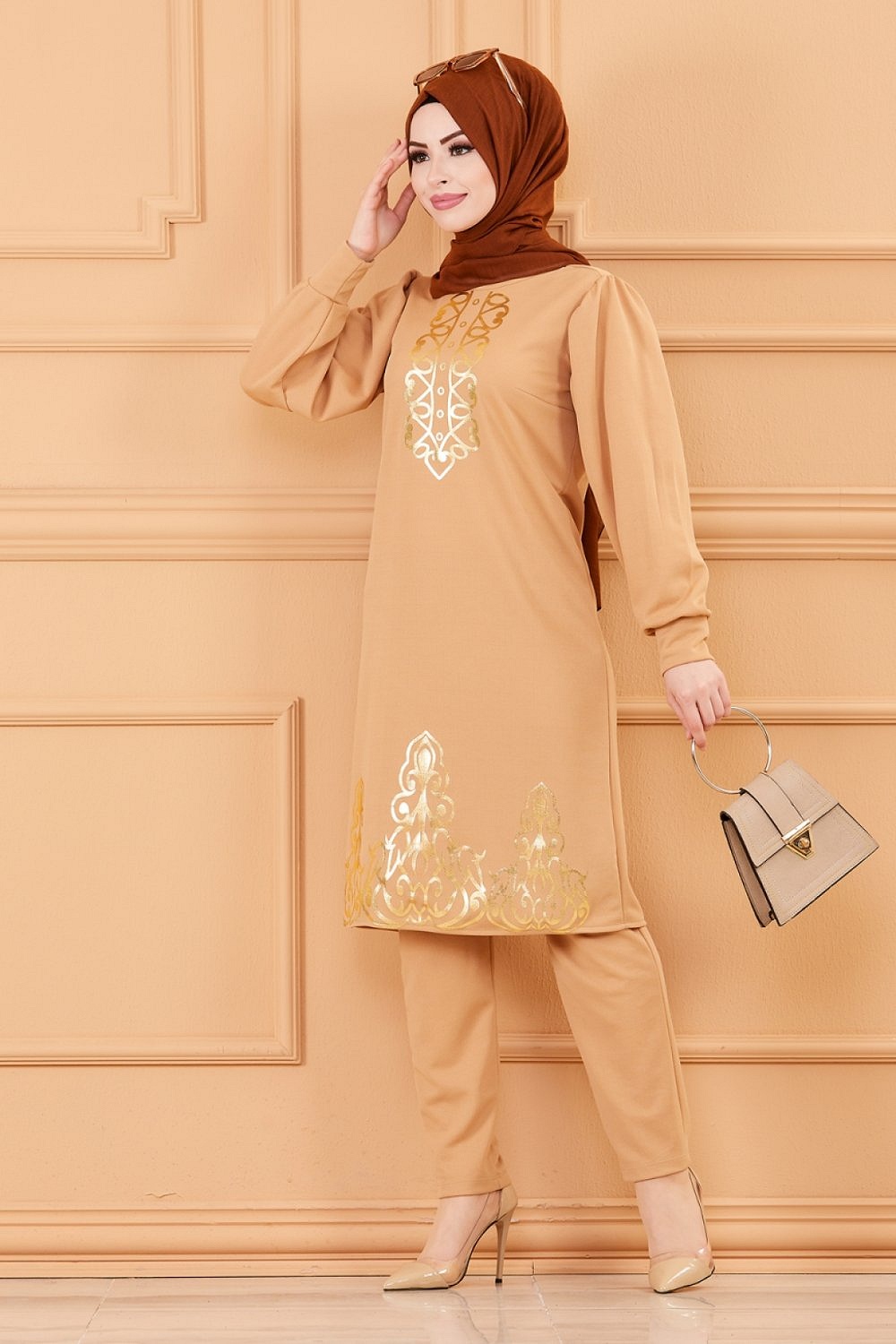Ensemble tunique motif dore et pantalon pour femme (Tenue Hijab Turquie) - Couleur beige