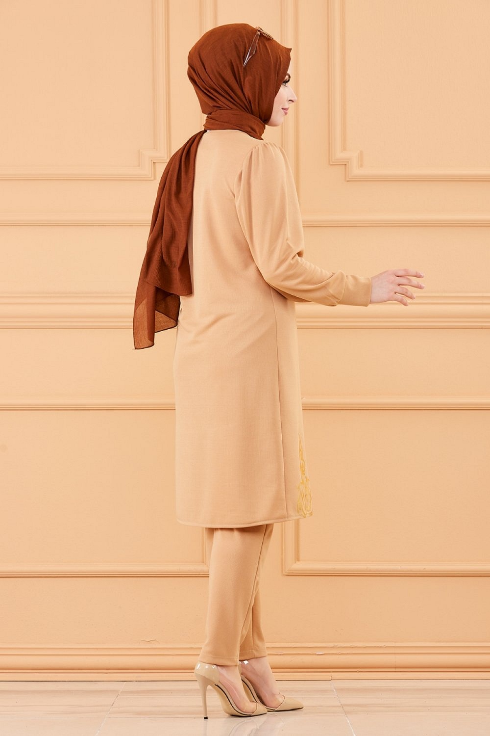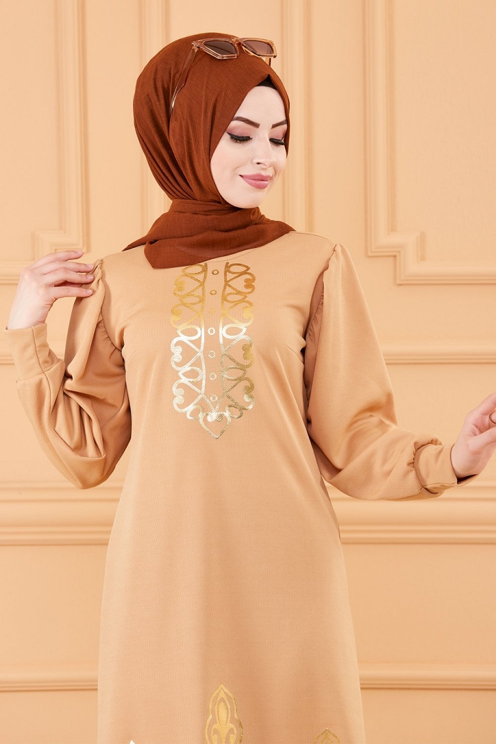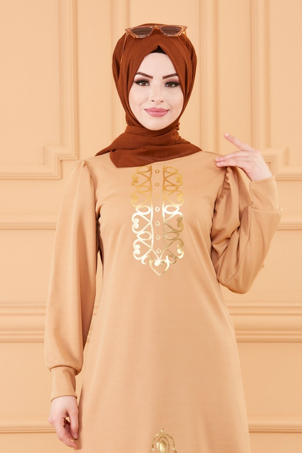 Ensemble tunique motif dore et pantalon pour femme (Tenue Hijab Turquie) - Couleur beige
