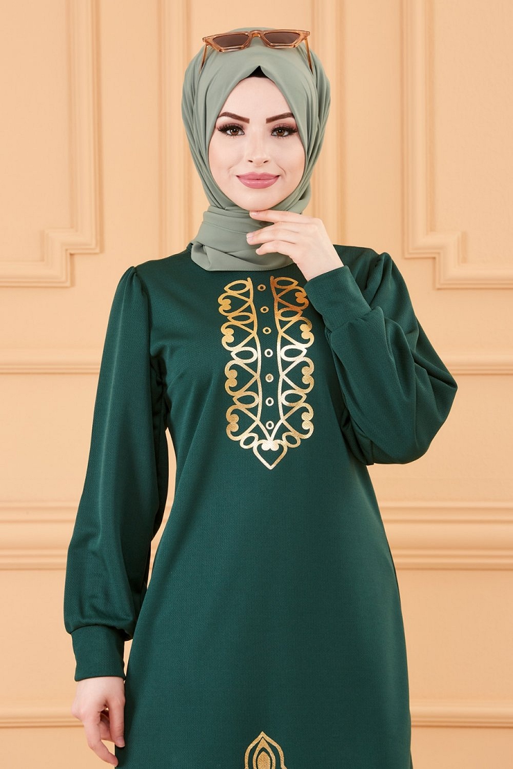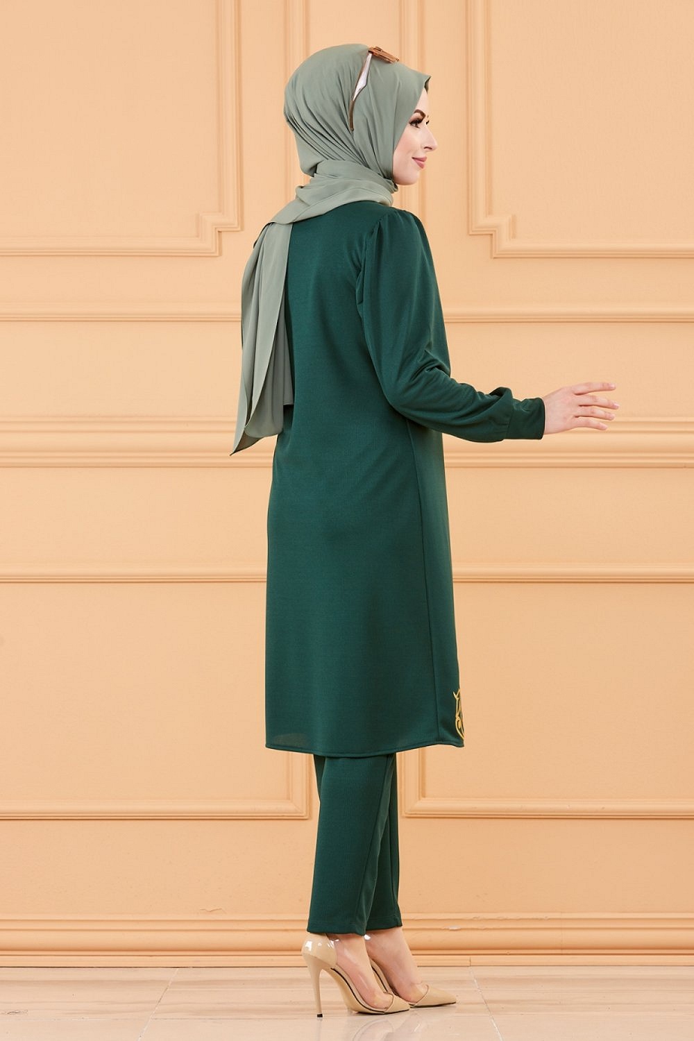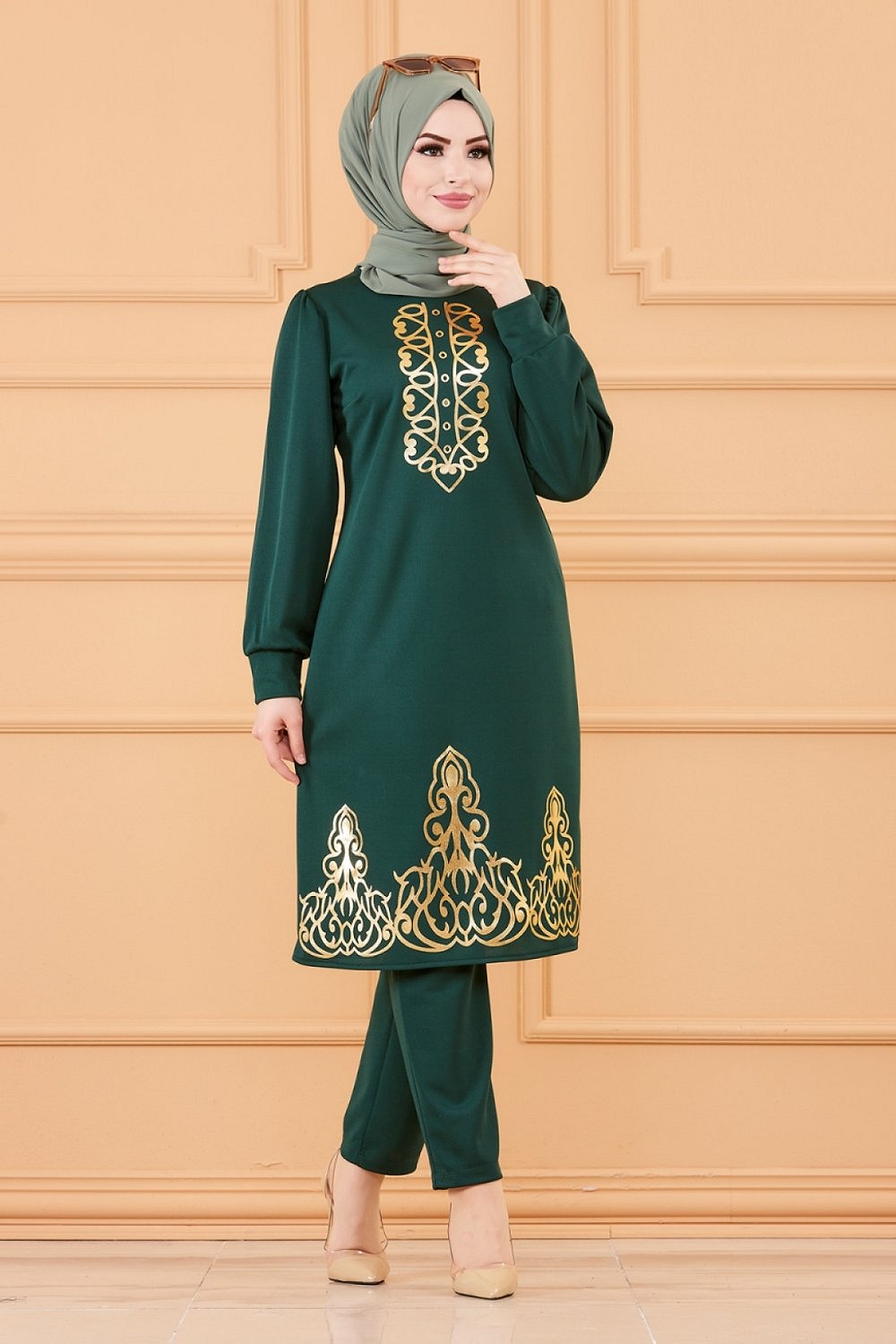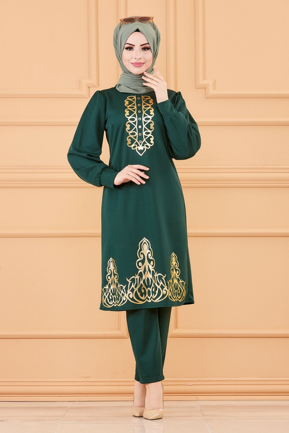 Ensemble oriental : tunique avec motifs dorés et pantalon (Tenue pour femme voilée) - Couleur vert émeraude Vetement & Accessoire