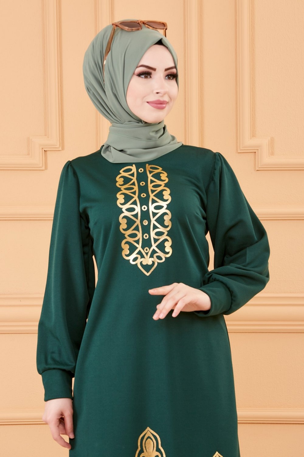 Ensemble oriental : tunique avec motifs dores et pantalon (Tenue pour femme voilee) - Couleur vert emeraude