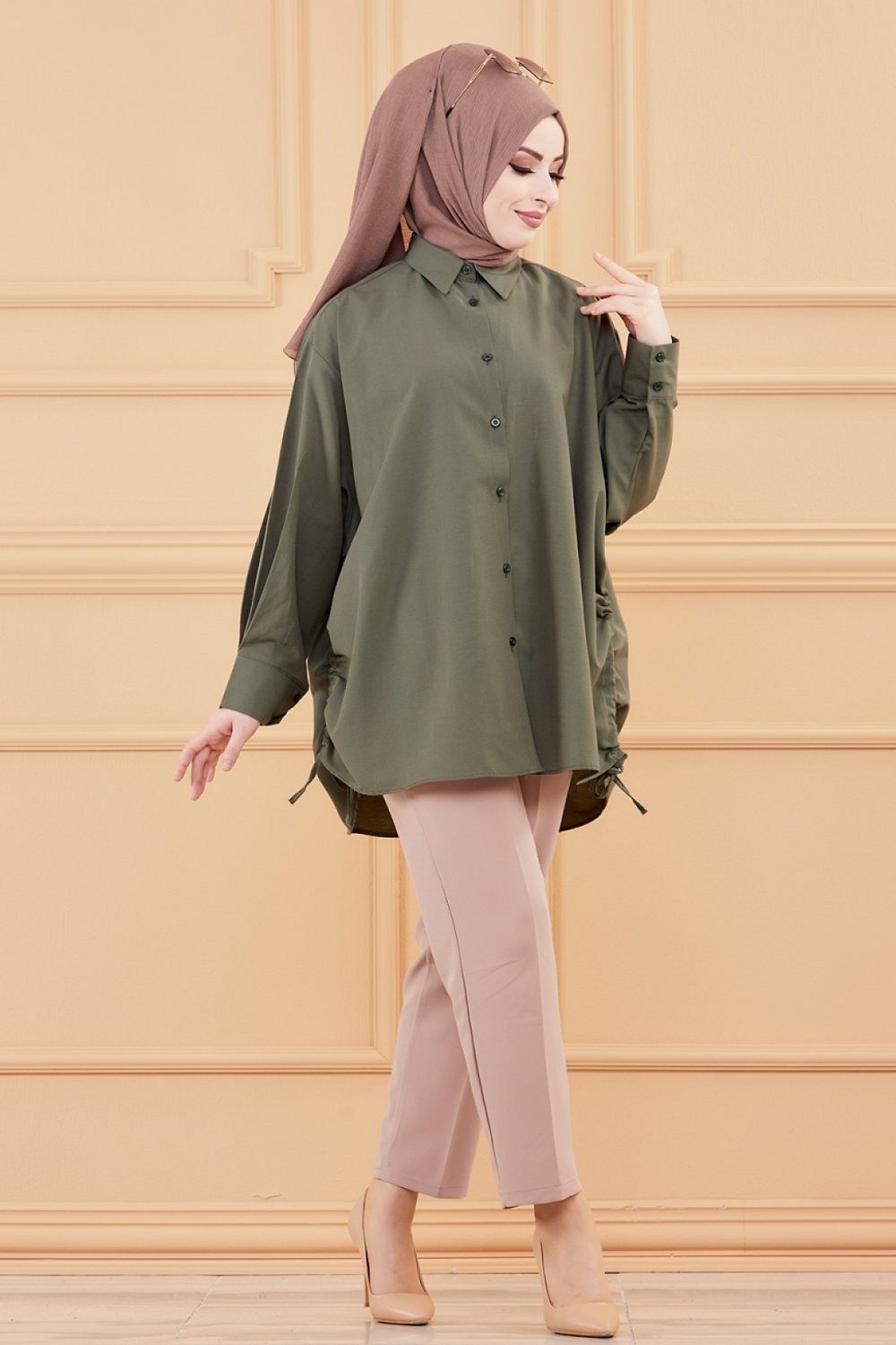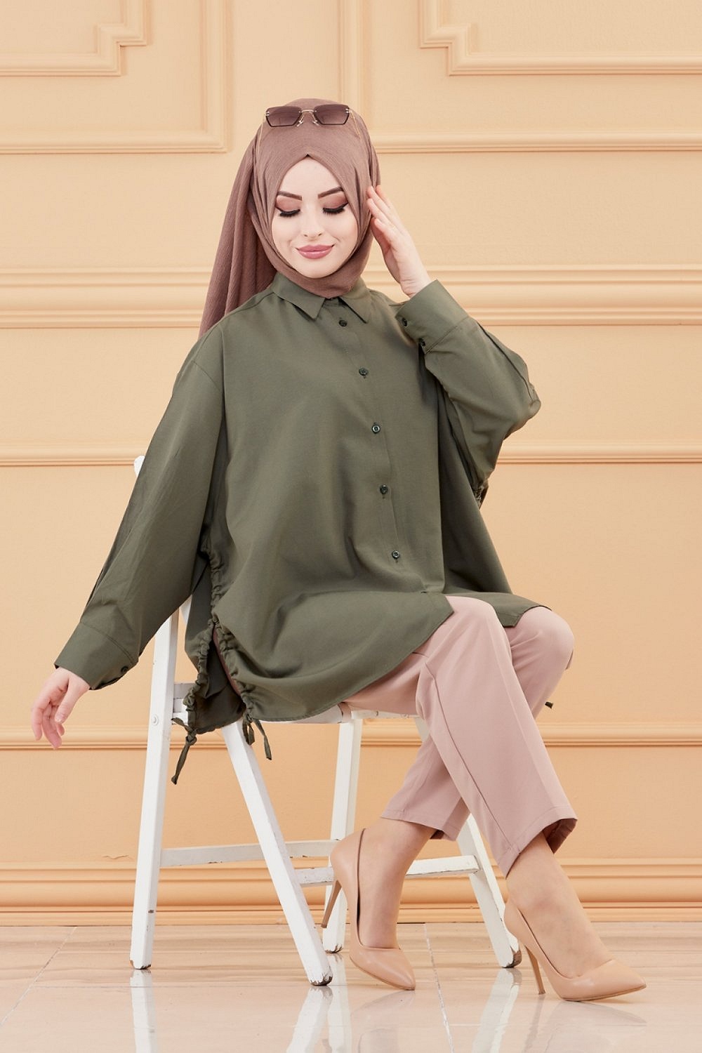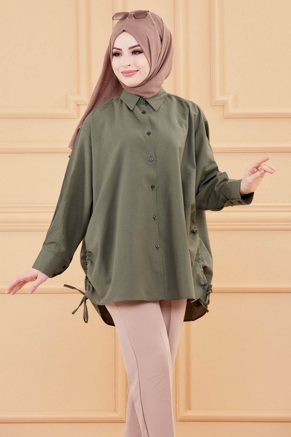 Chemise à gros boutons (Tunique style habillé pour femme voilée) - Couleur kaki - REF. 35906 (26.90 €)