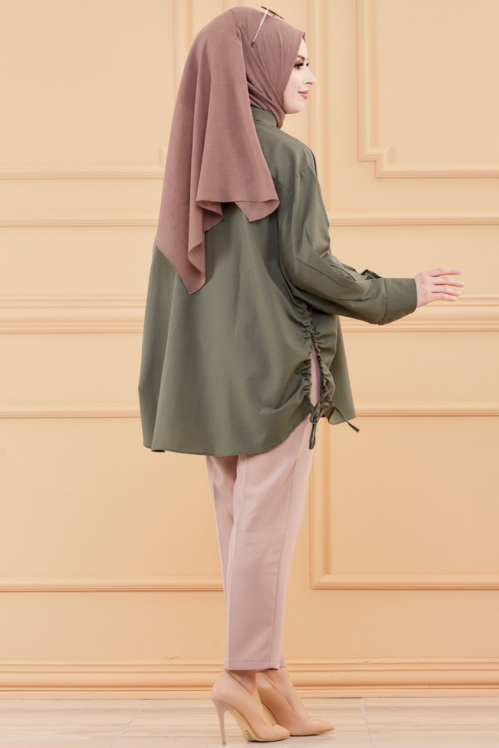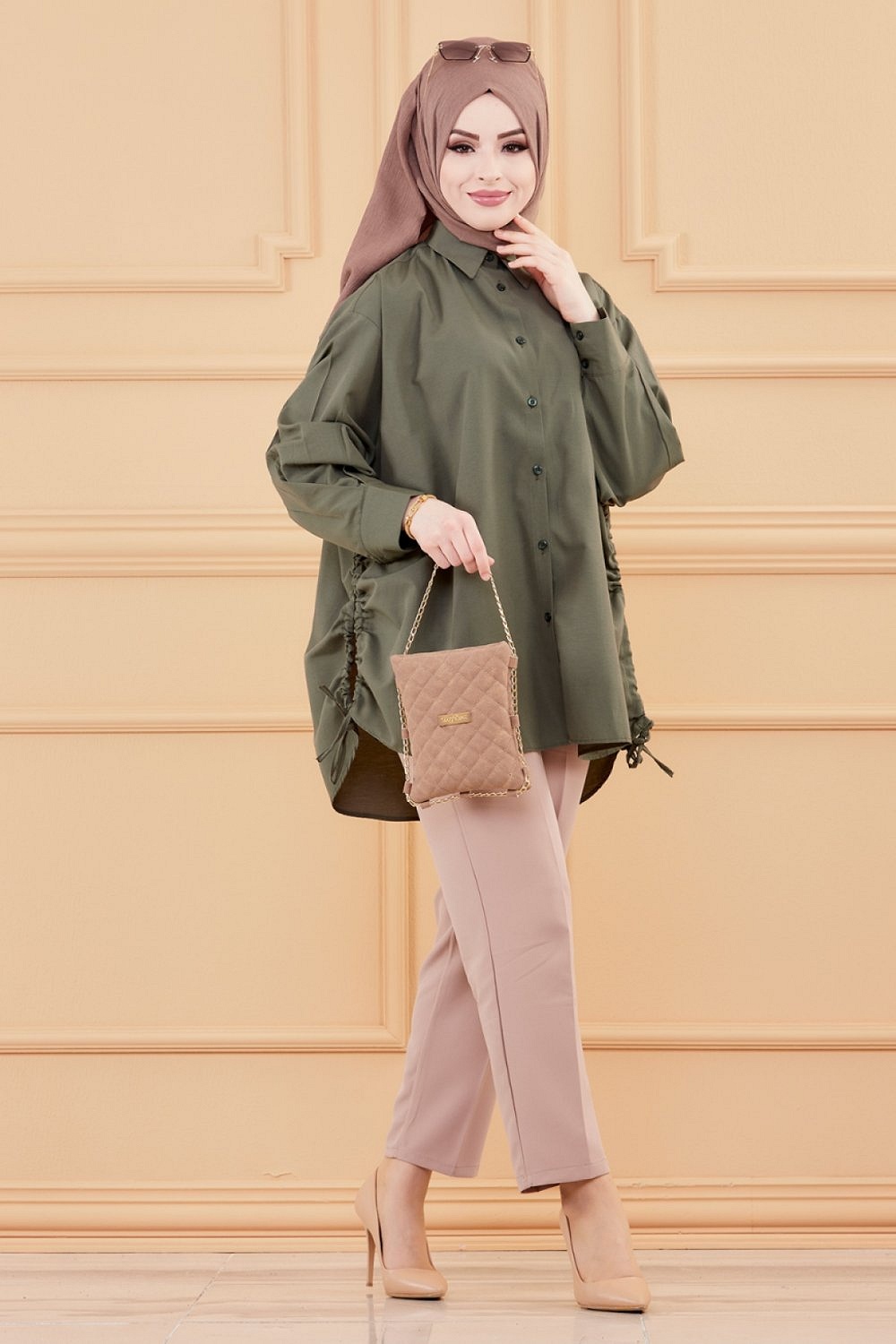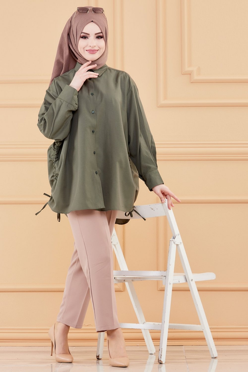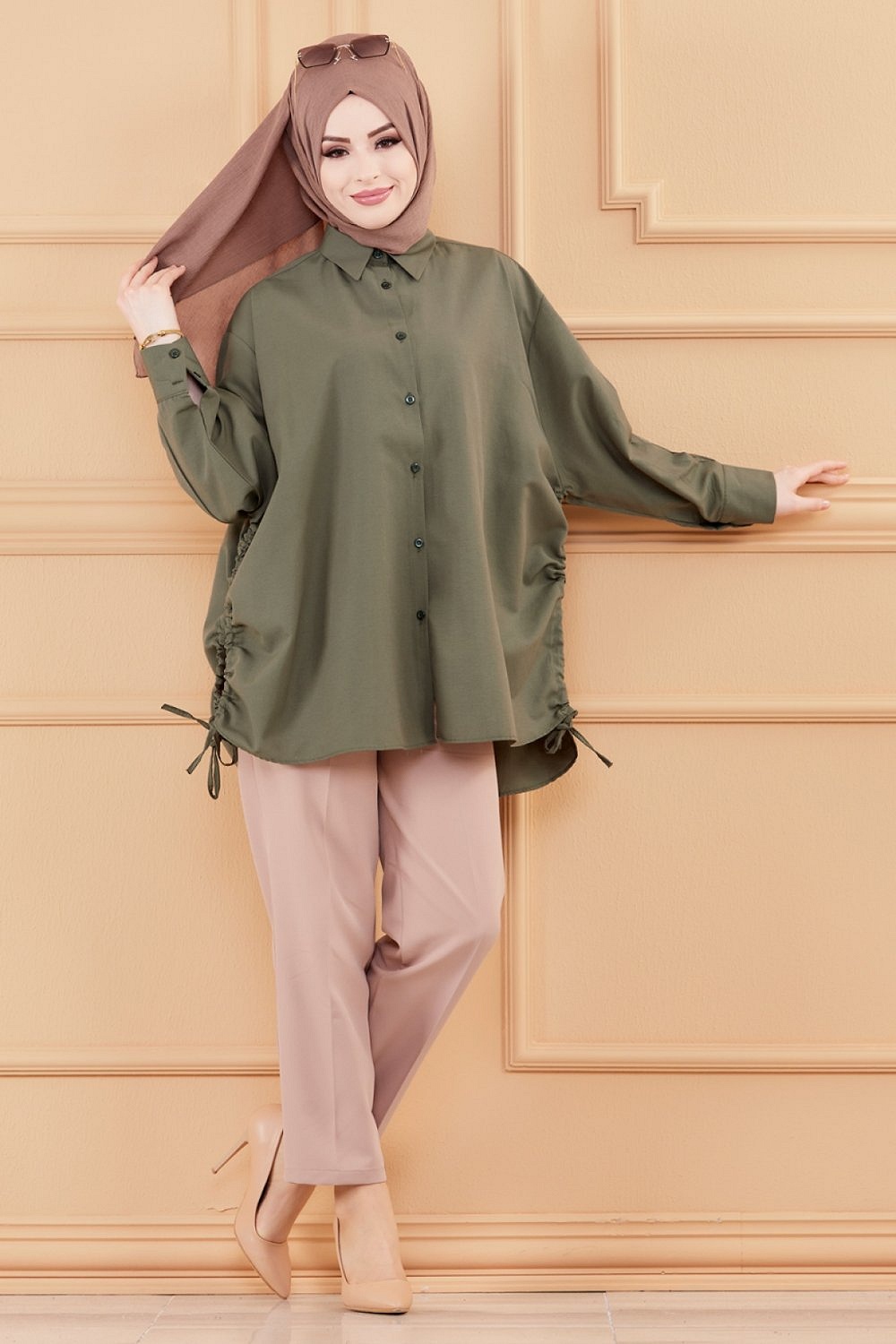 Chemise à gros boutons (Tunique style habillé pour femme voilée) - Couleur kaki - REF. 35906 (26.90 €)