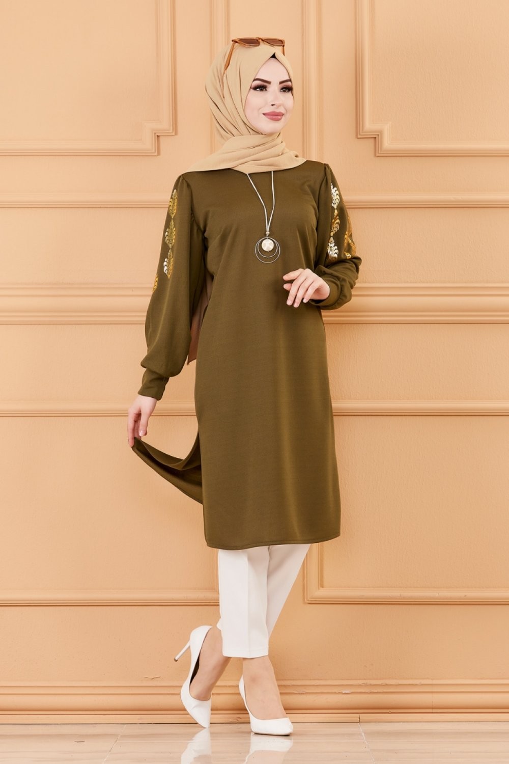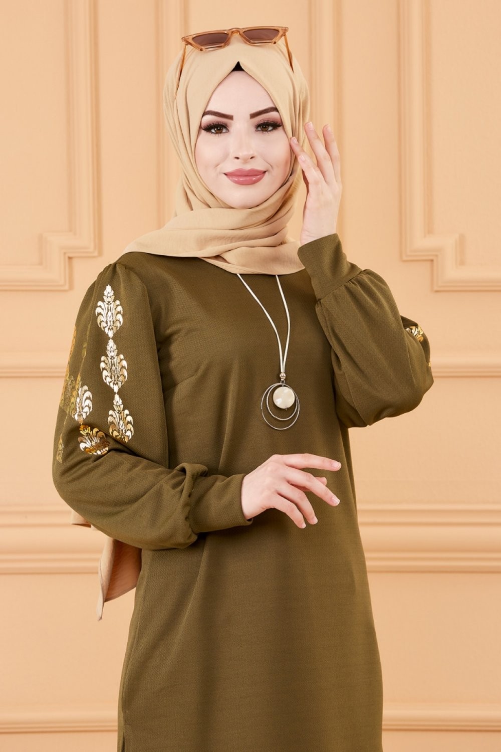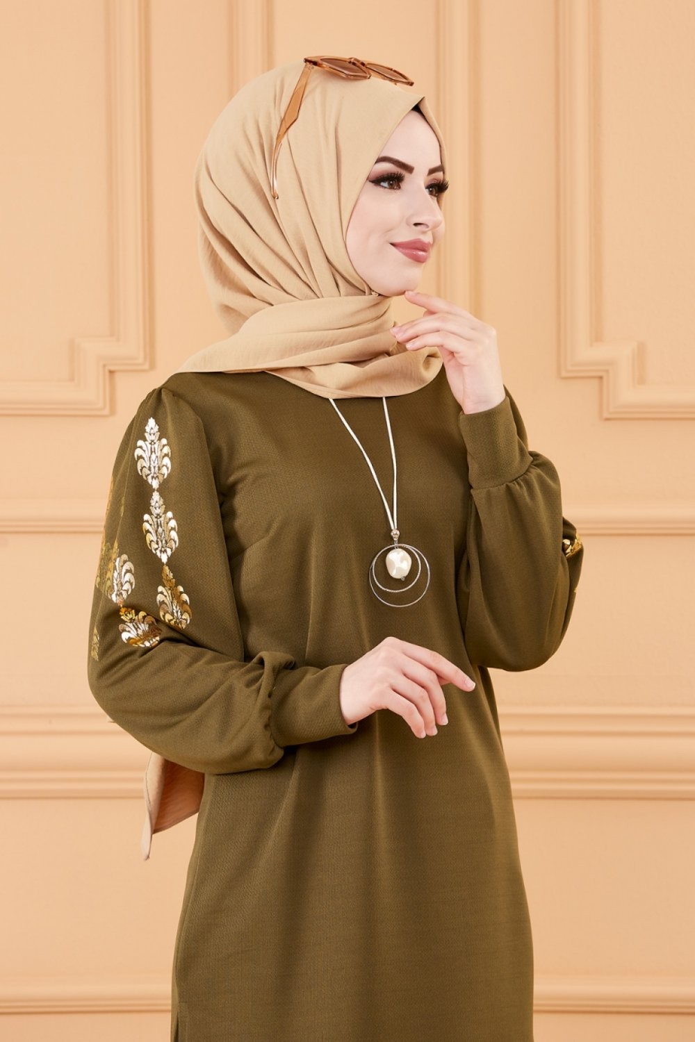 Tunique longue avec dorures (Vetement hijab turque en ligne) - Couleur kaki