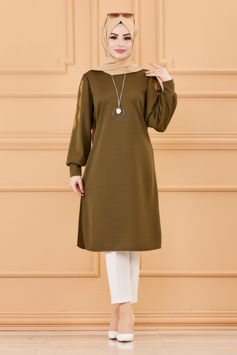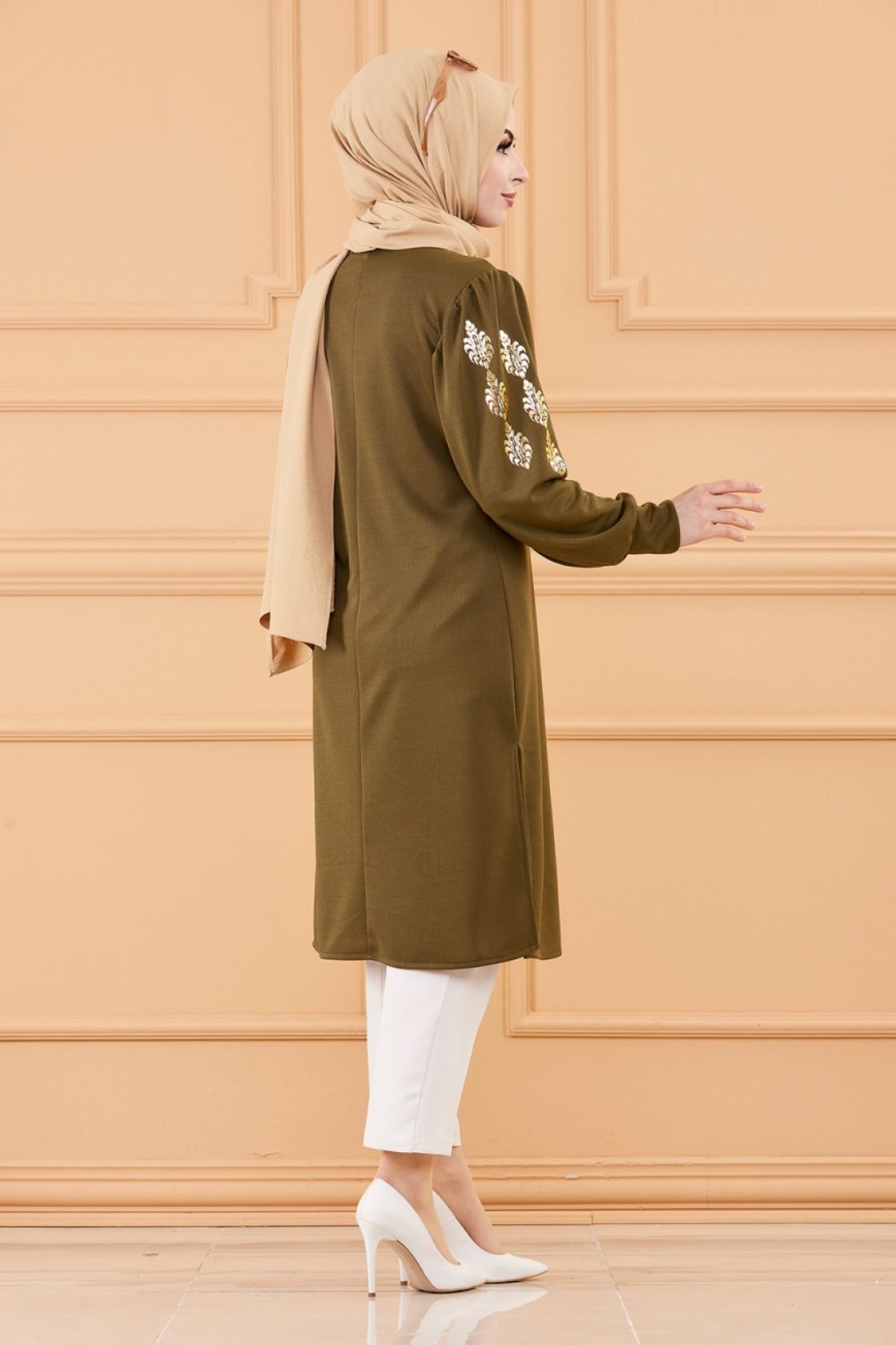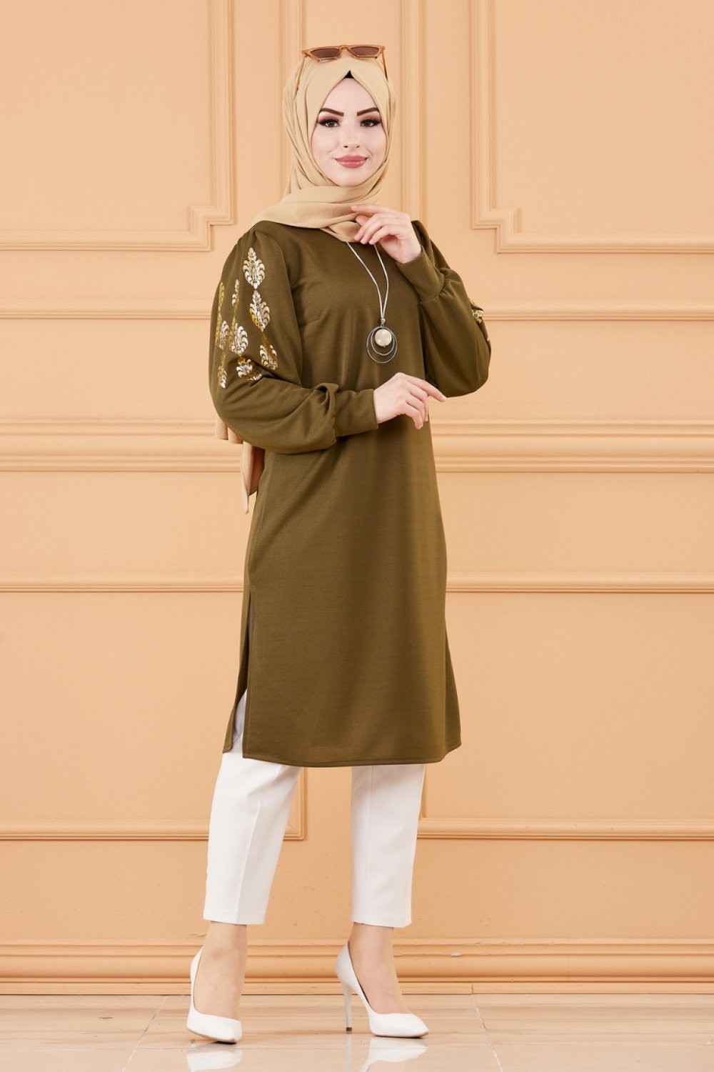 Tunique longue avec dorures (Vetement hijab turque en ligne) - Couleur kaki