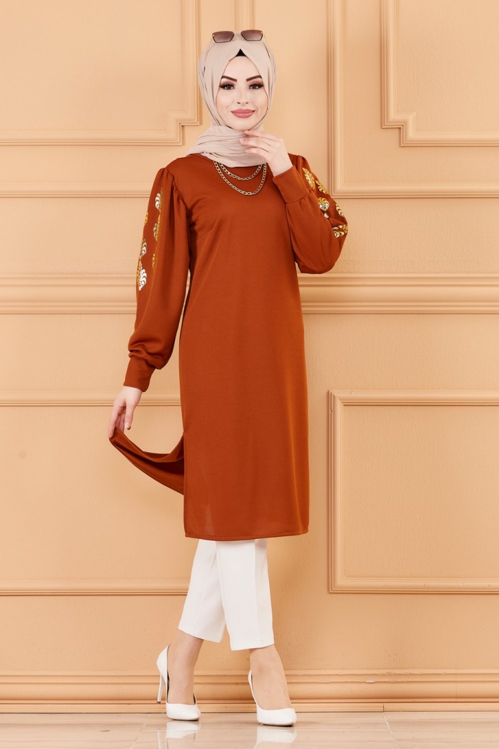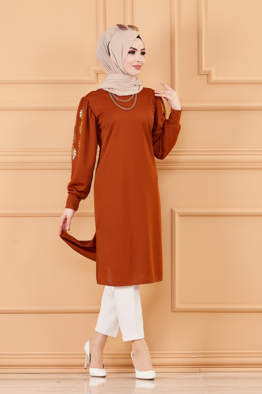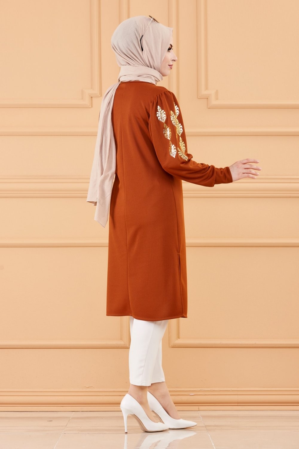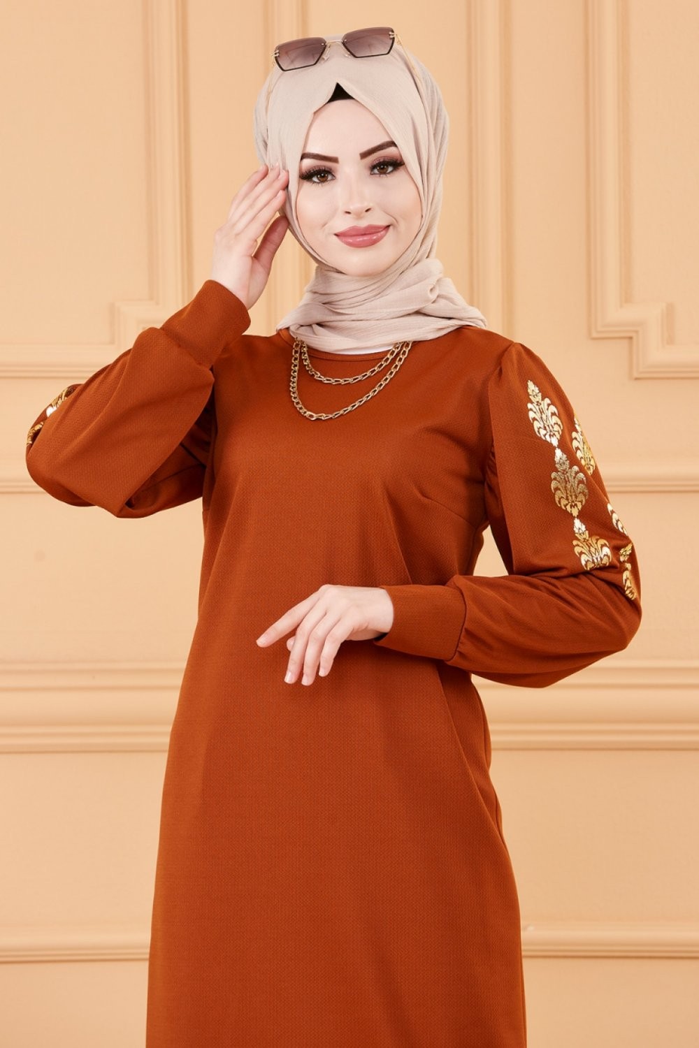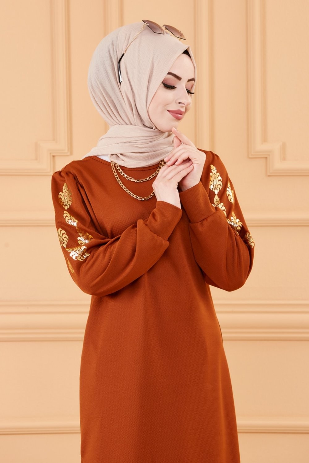Tunique longue avec dorures pour femme (Vetement pour Hijab, hidjab ou hijeb en ligne) - Couleur brique Vetement & Accessoire