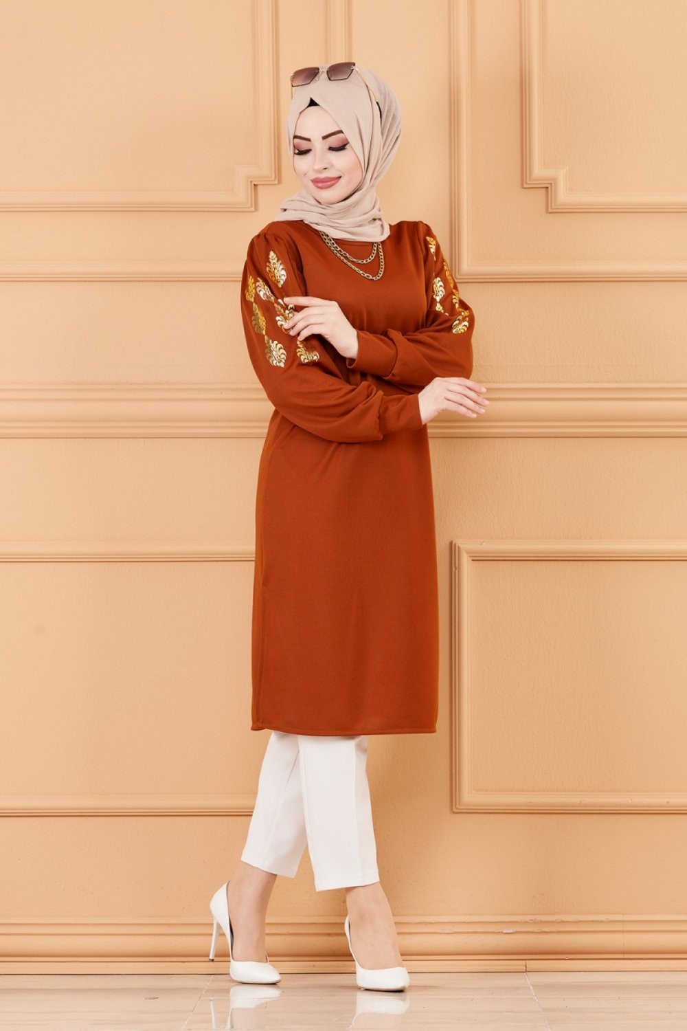 Tunique longue avec dorures pour femme (Vetement pour Hijab, hidjab ou hijeb en ligne) - Couleur brique