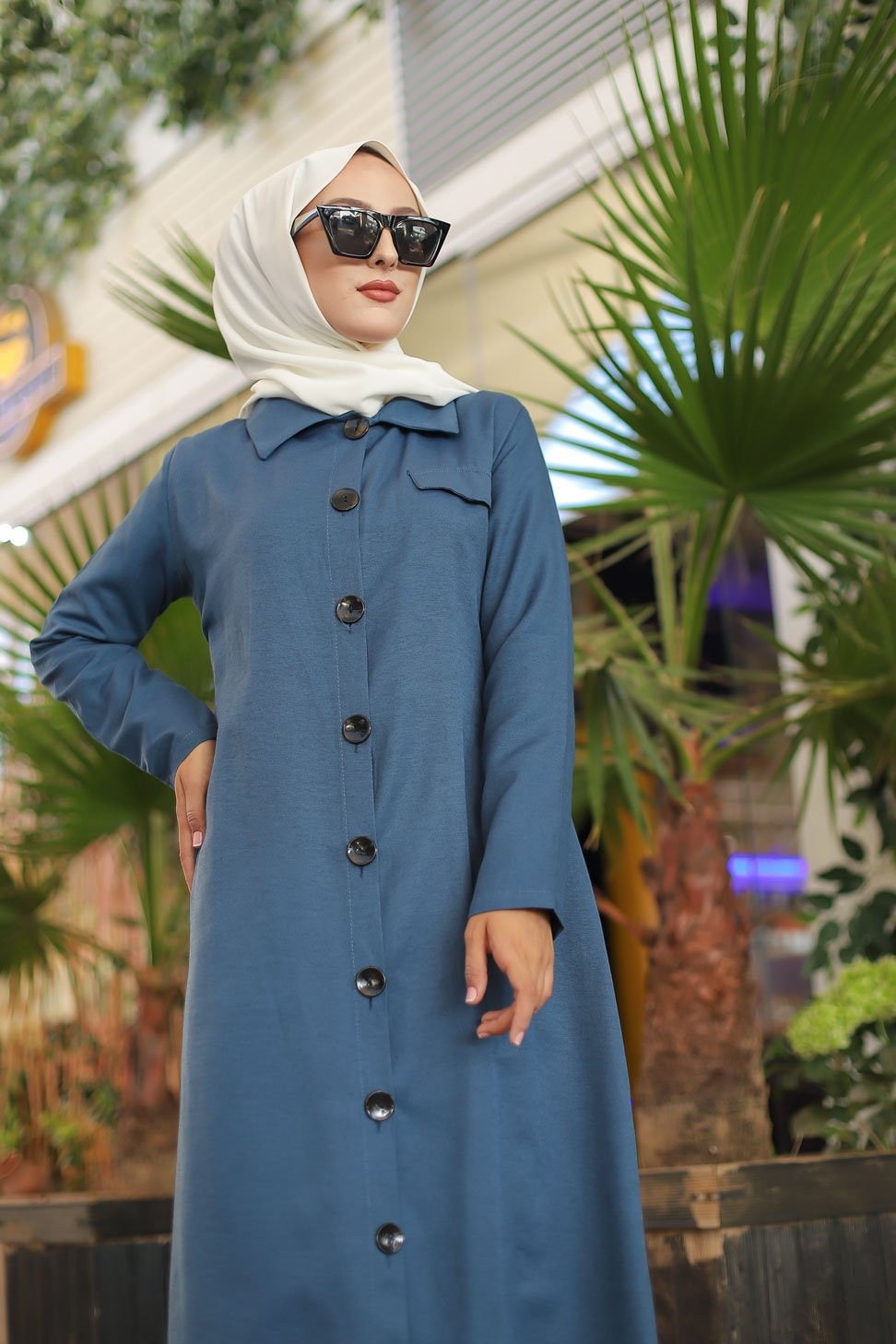 Trench-Coat Long pour femme (Boutique en ligne de Mode islamique Automne Hiver) - Couleur Bleu indigo - REF. 30821 (29.90 €)