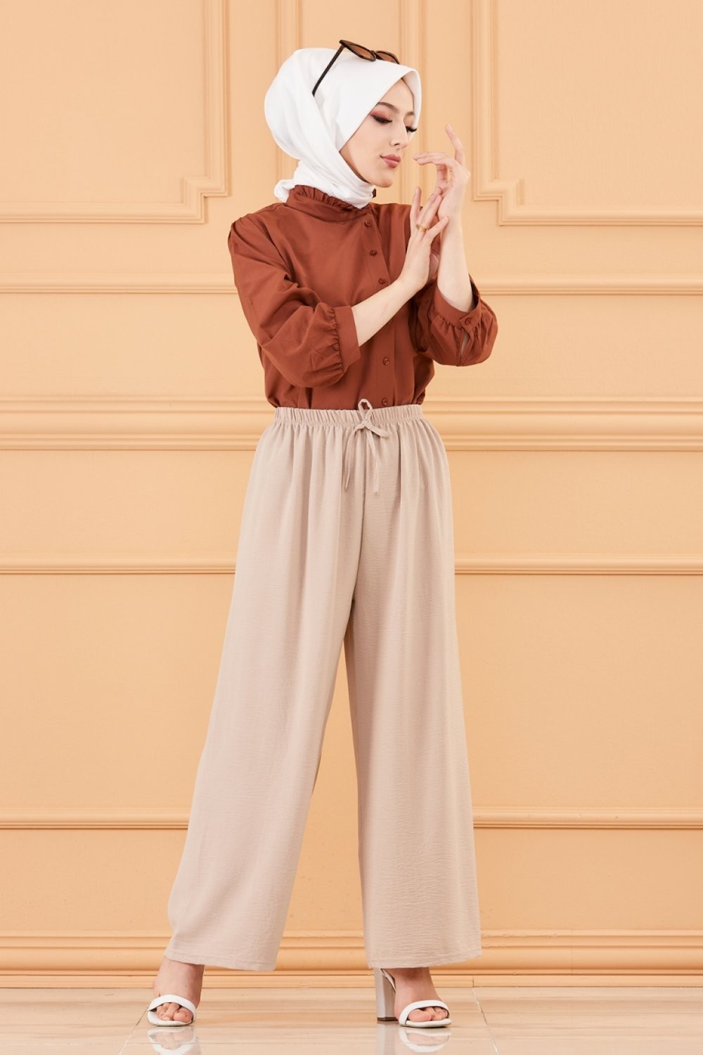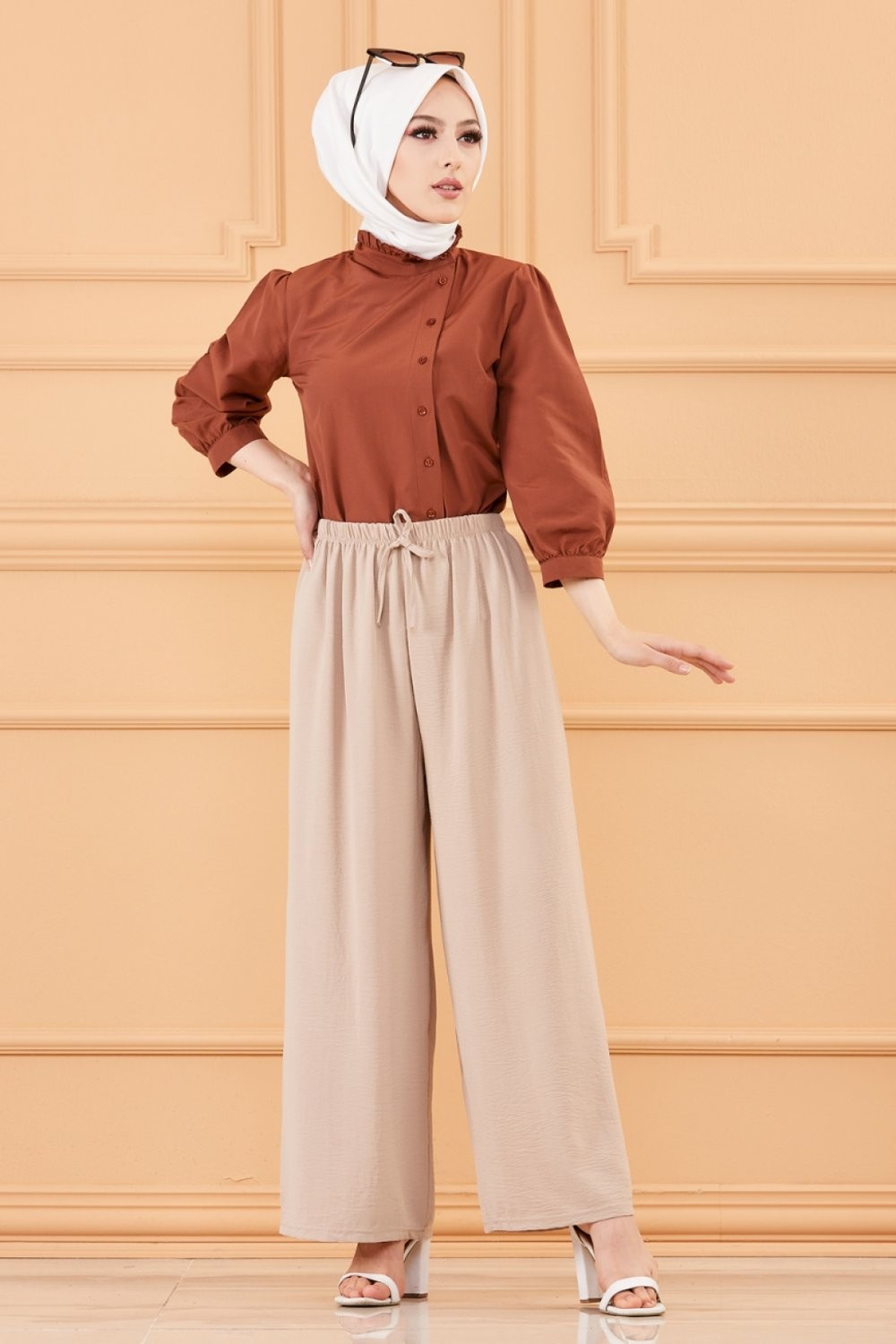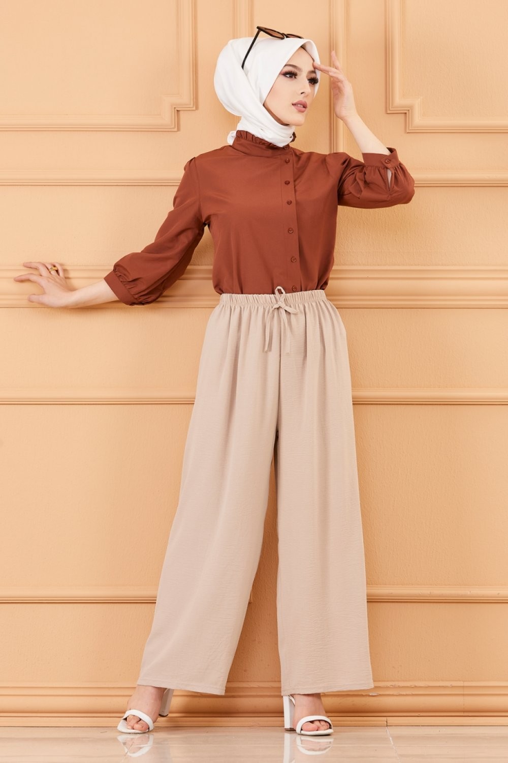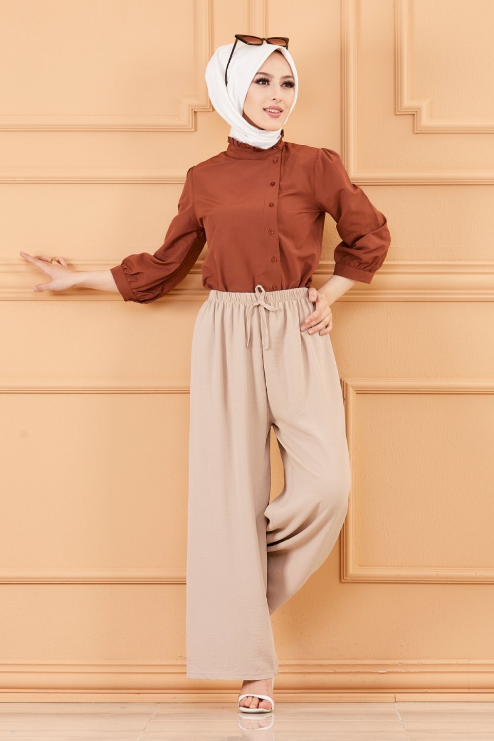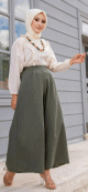 Ensemble Pantalon Palazzo ample et Blouse avec collier assorti (Tenue femme musulmane en ligne) - Couleur crème et kaki - REF. 32871 (19.90 €)