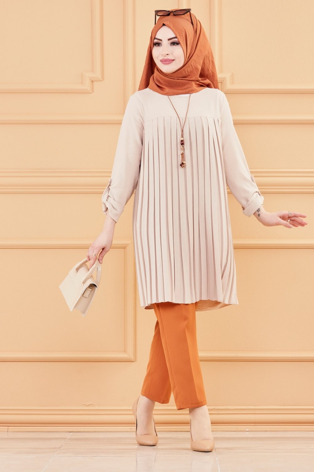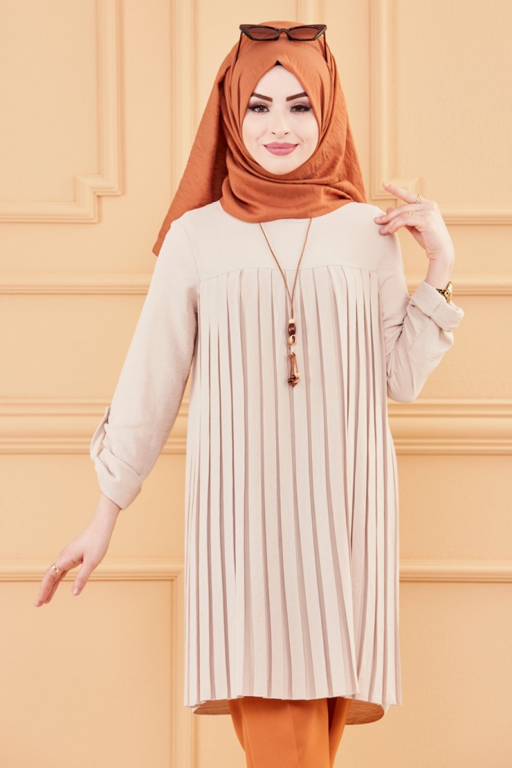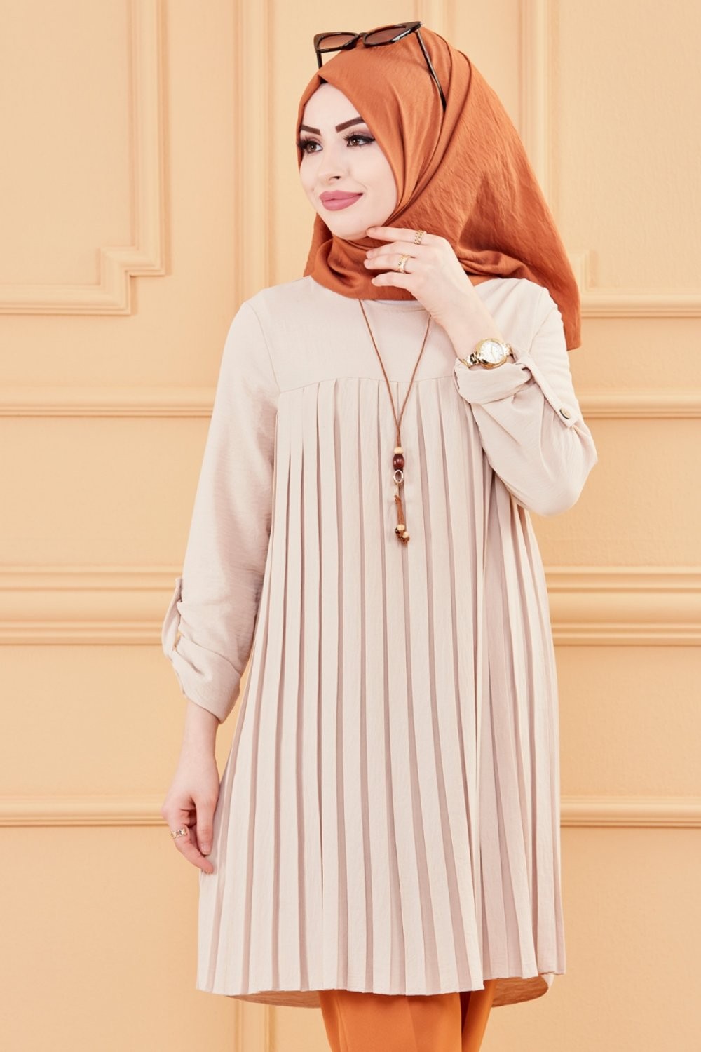 Tunique plissee style habille pour femme (Vetement elegant pour hijab) - Couleur beige
