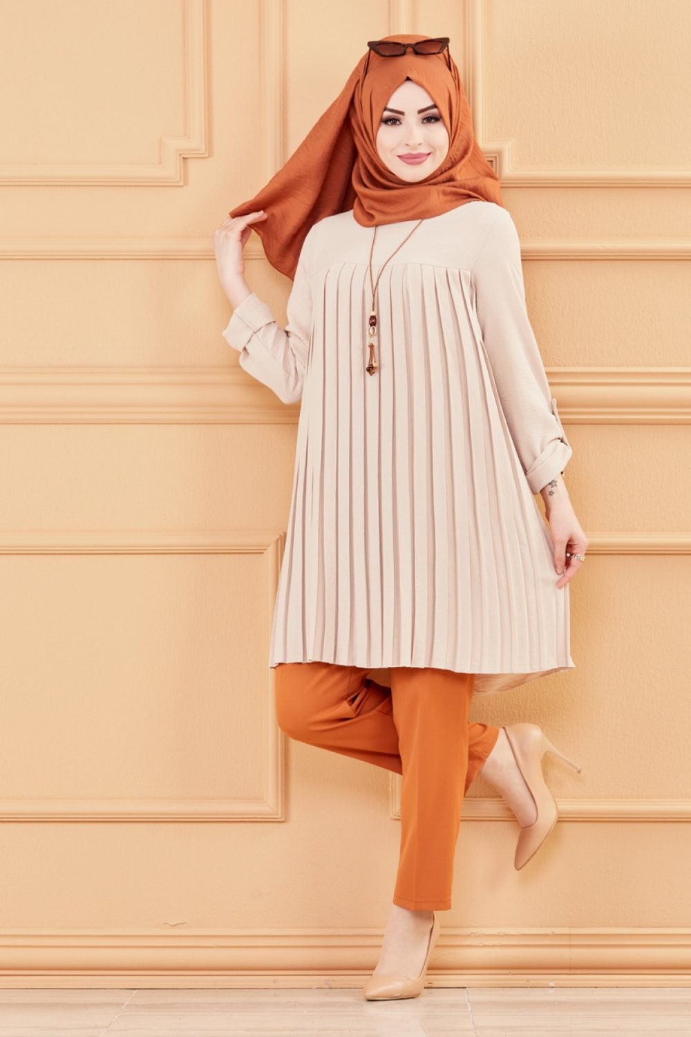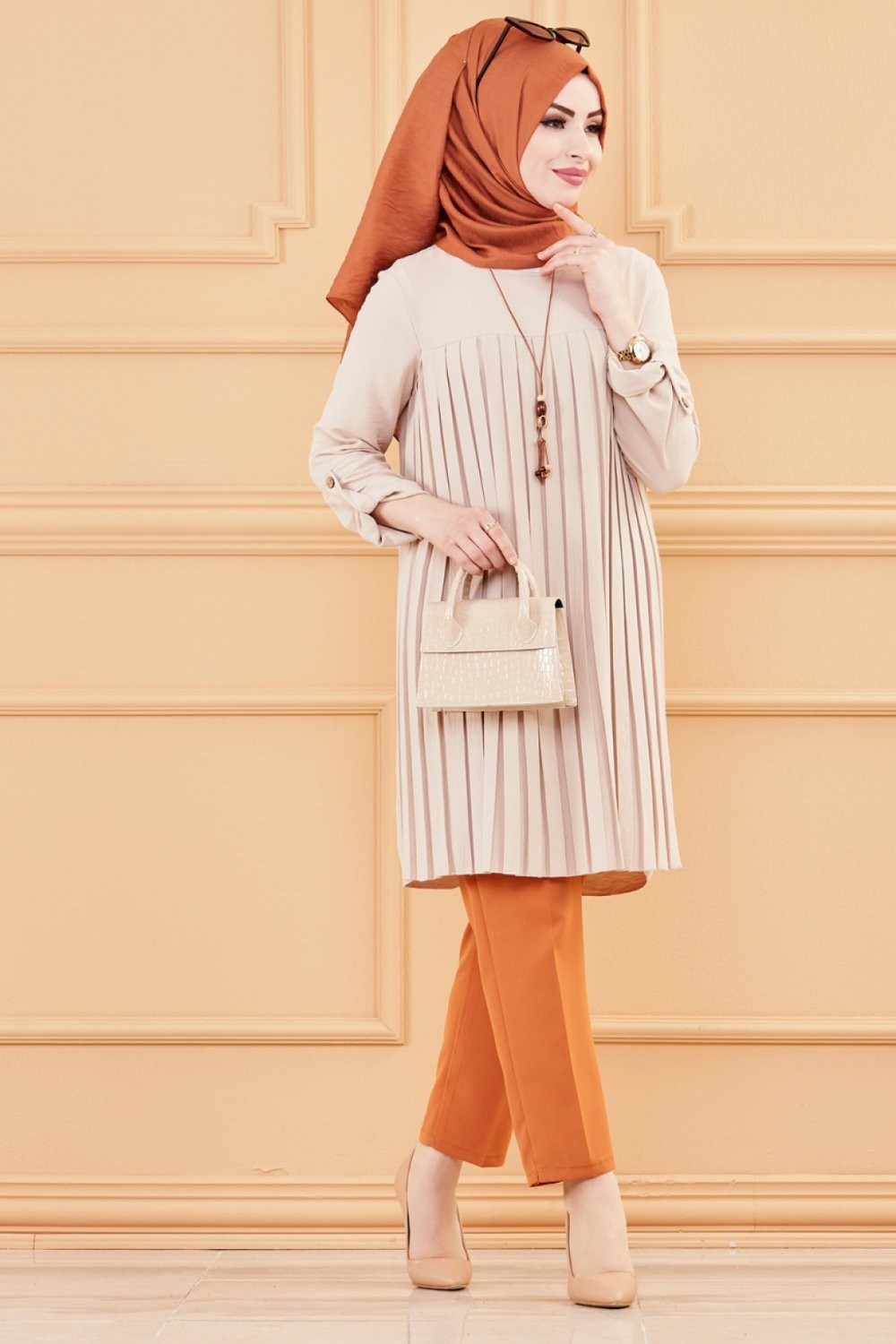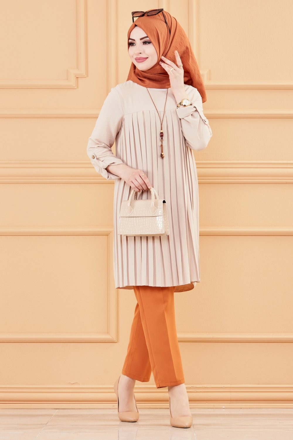 Tunique plissee style habille pour femme (Vetement elegant pour hijab) - Couleur beige