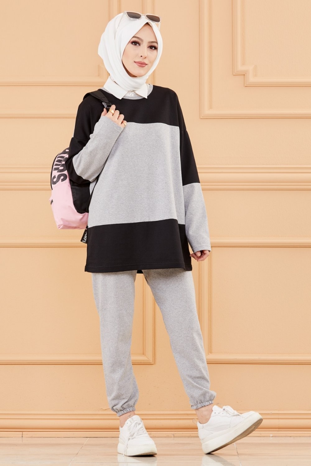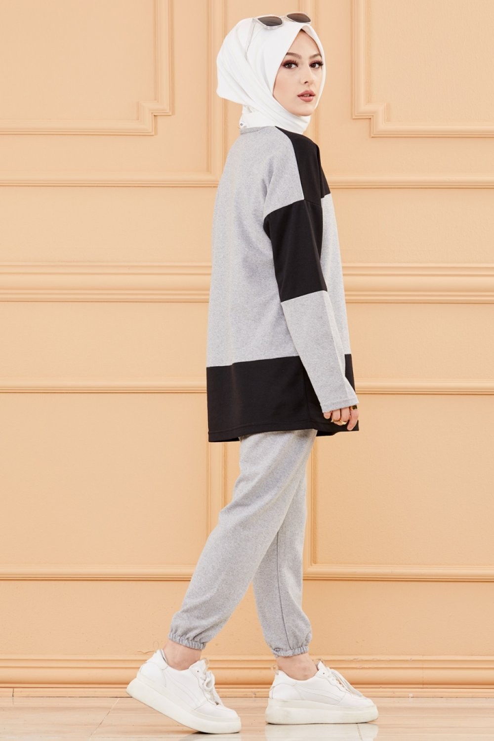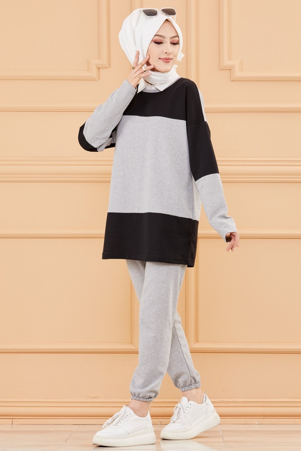 Survêtement Hijab jogging musulman 2 pièces - Tunique à rayure pour femme voilée - Couleur gris et noir - REF. 33877 (25.00 €)