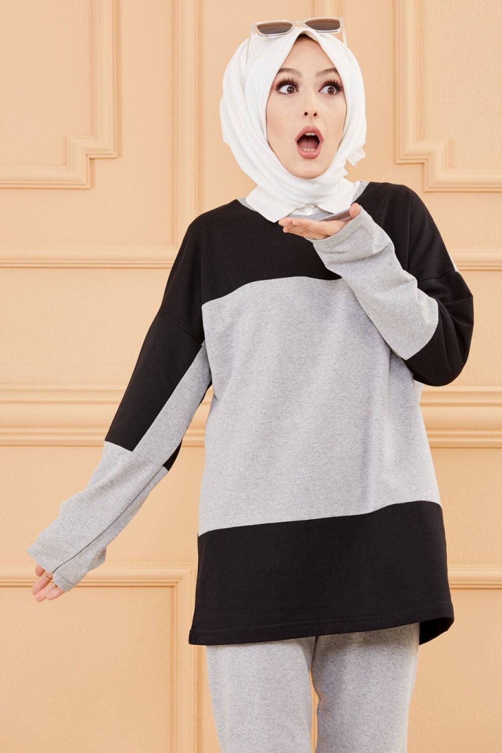 Ensemble sweat et pantalon pour femme (Tenue de sport musulmane pour hidjab) - Couleur noir et gris