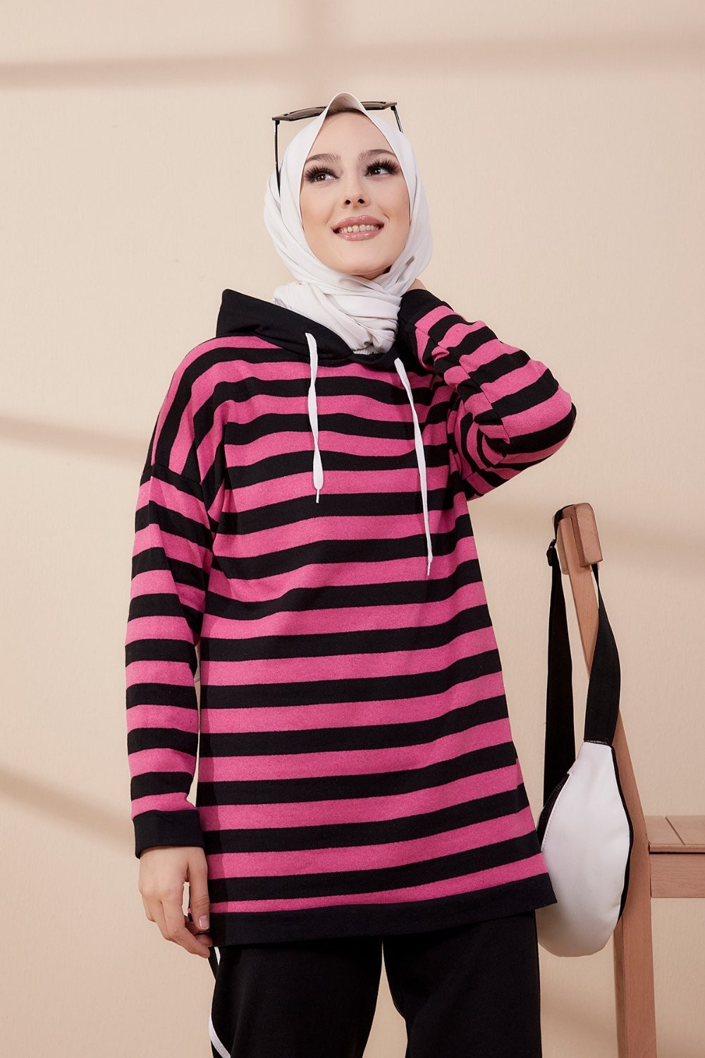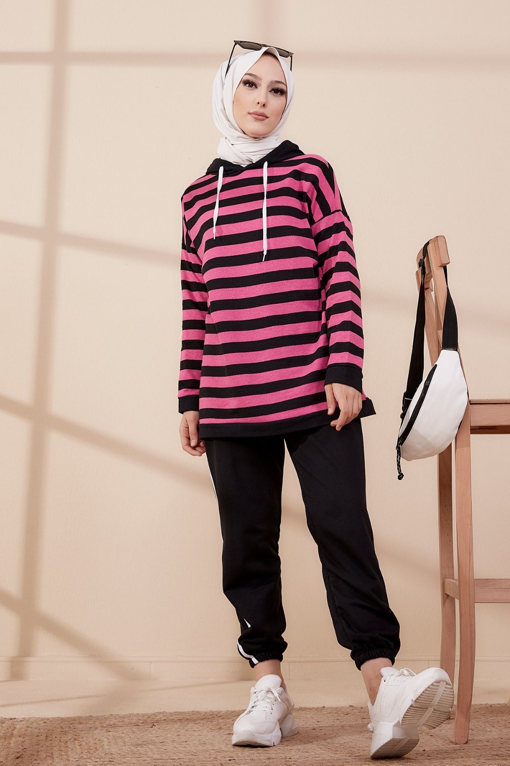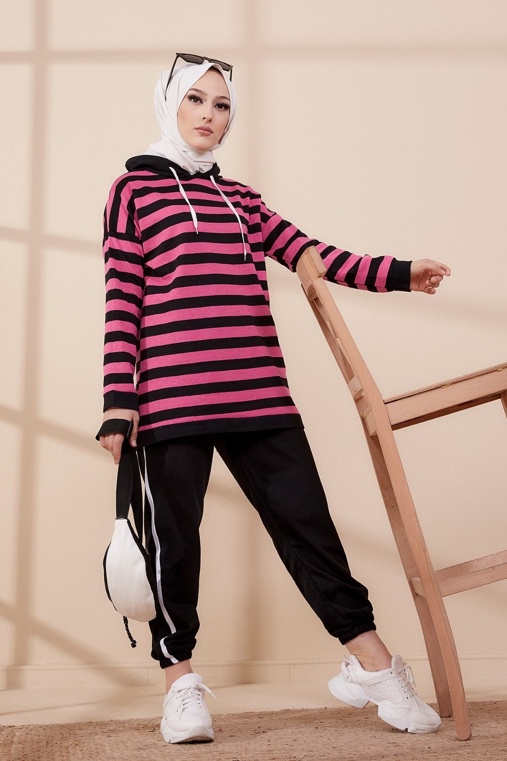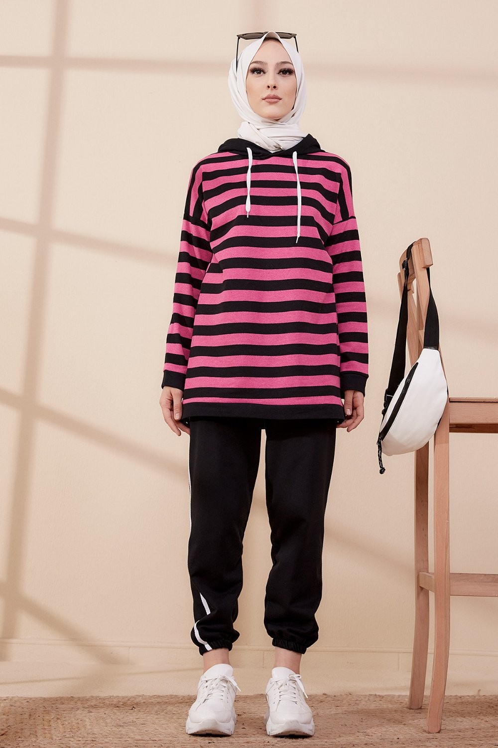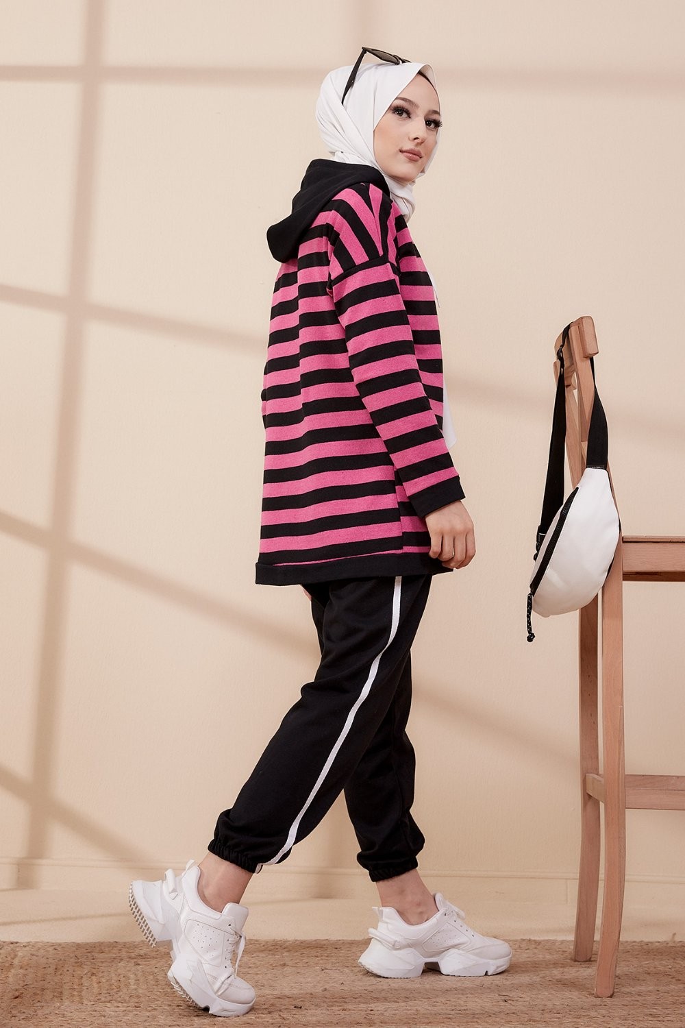 Survêtement tricolore à capuche imprimé "Breathe" (Hijab Sport-Wear) - Couleur Beige, noir et blanc - REF. 33127 (29.90 €) - En Promotion à 19.90 €