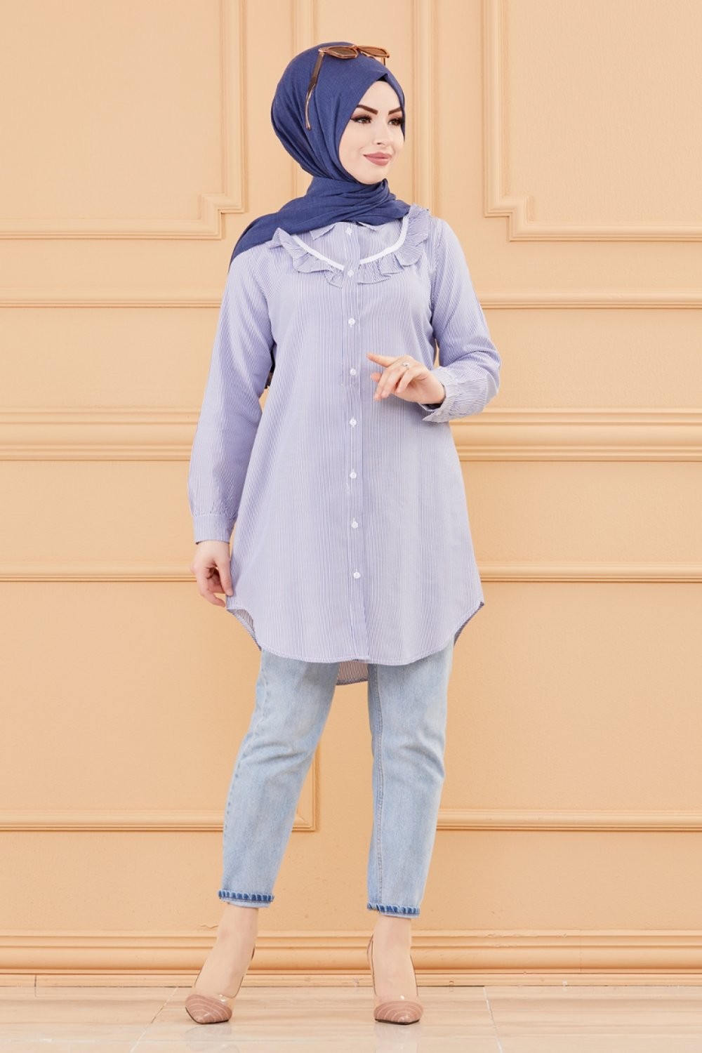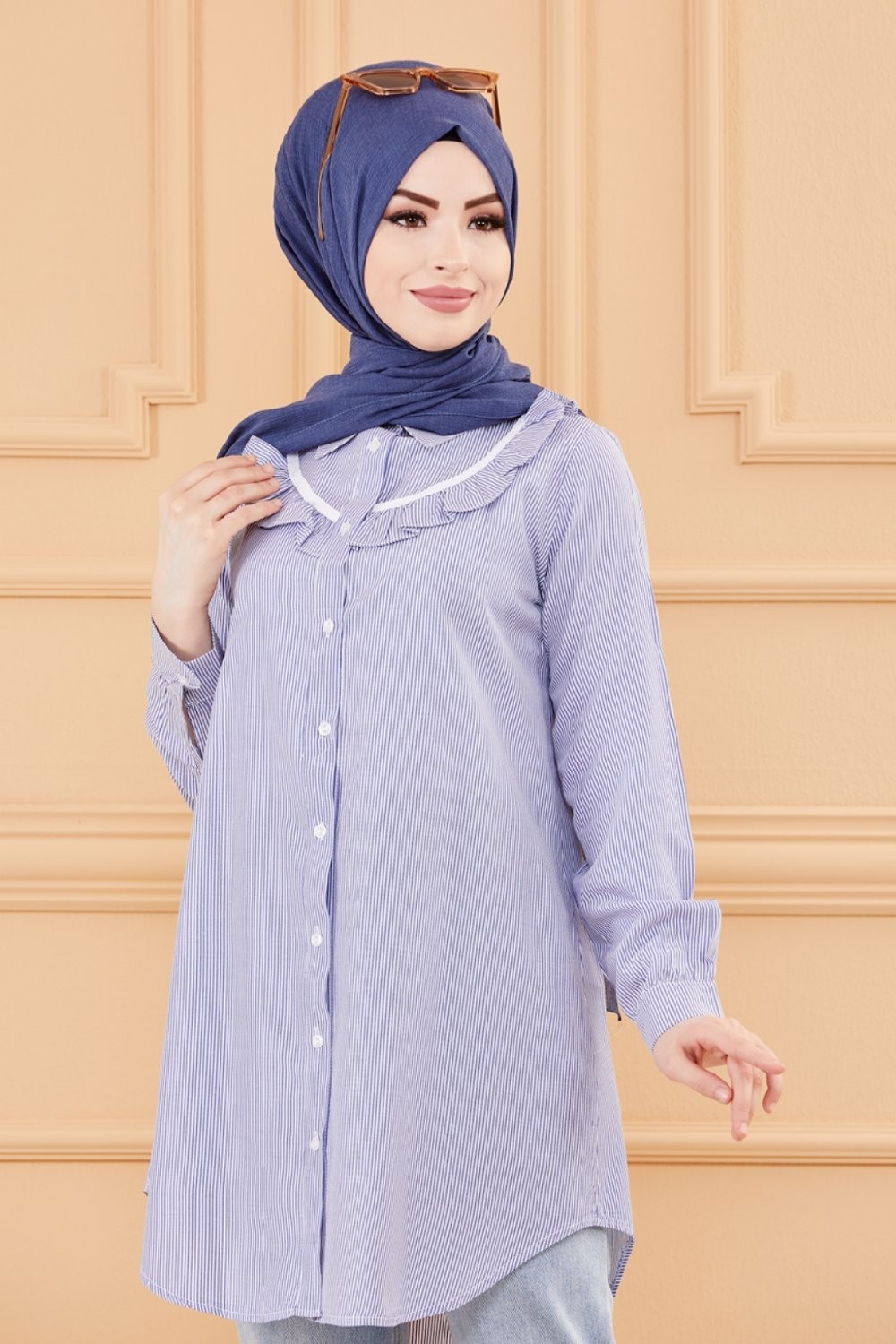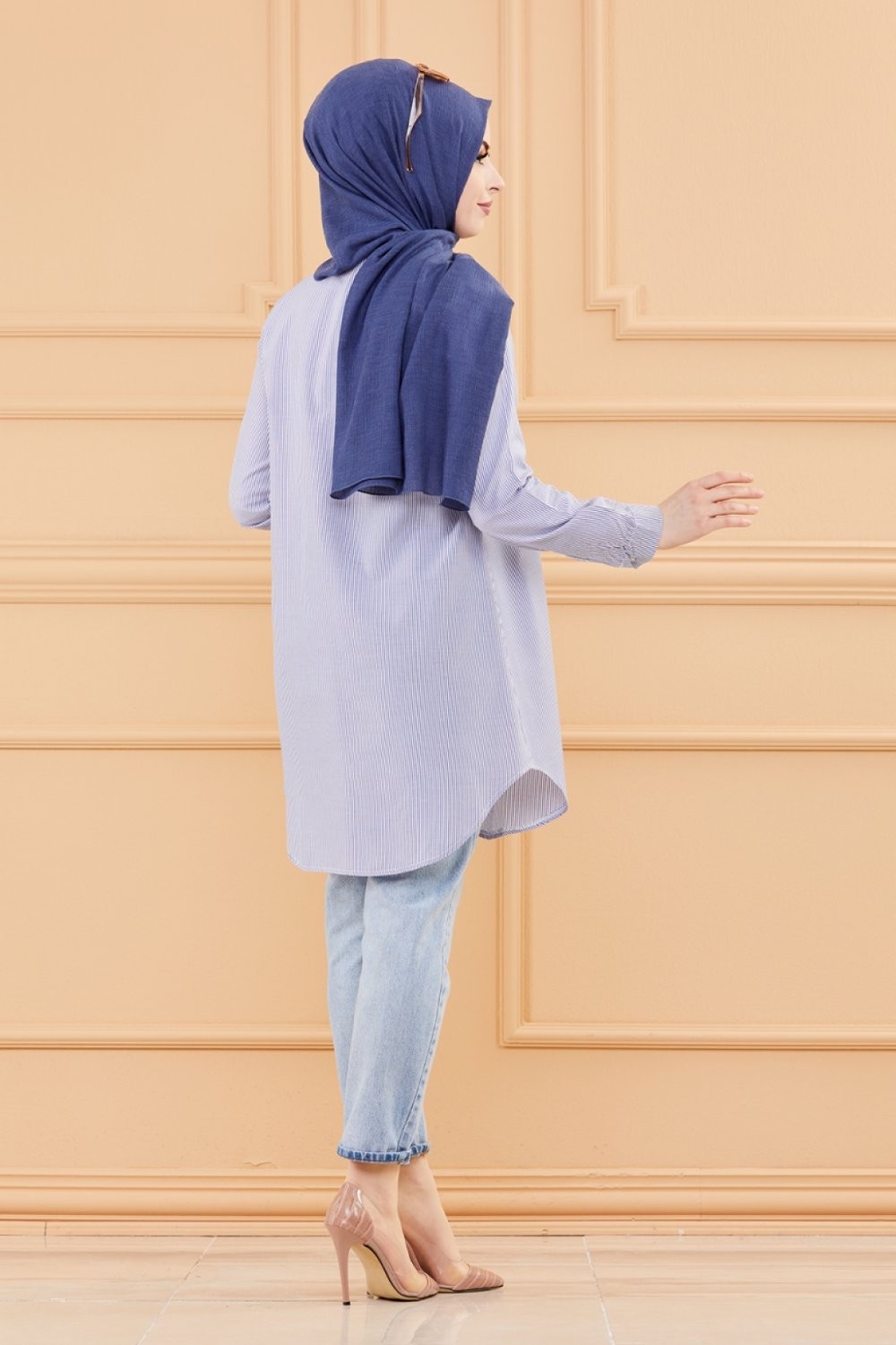 Tunique avec col foufrou (Tuniques pour femmes musulmanes style chic) - Rayures couleur bleu