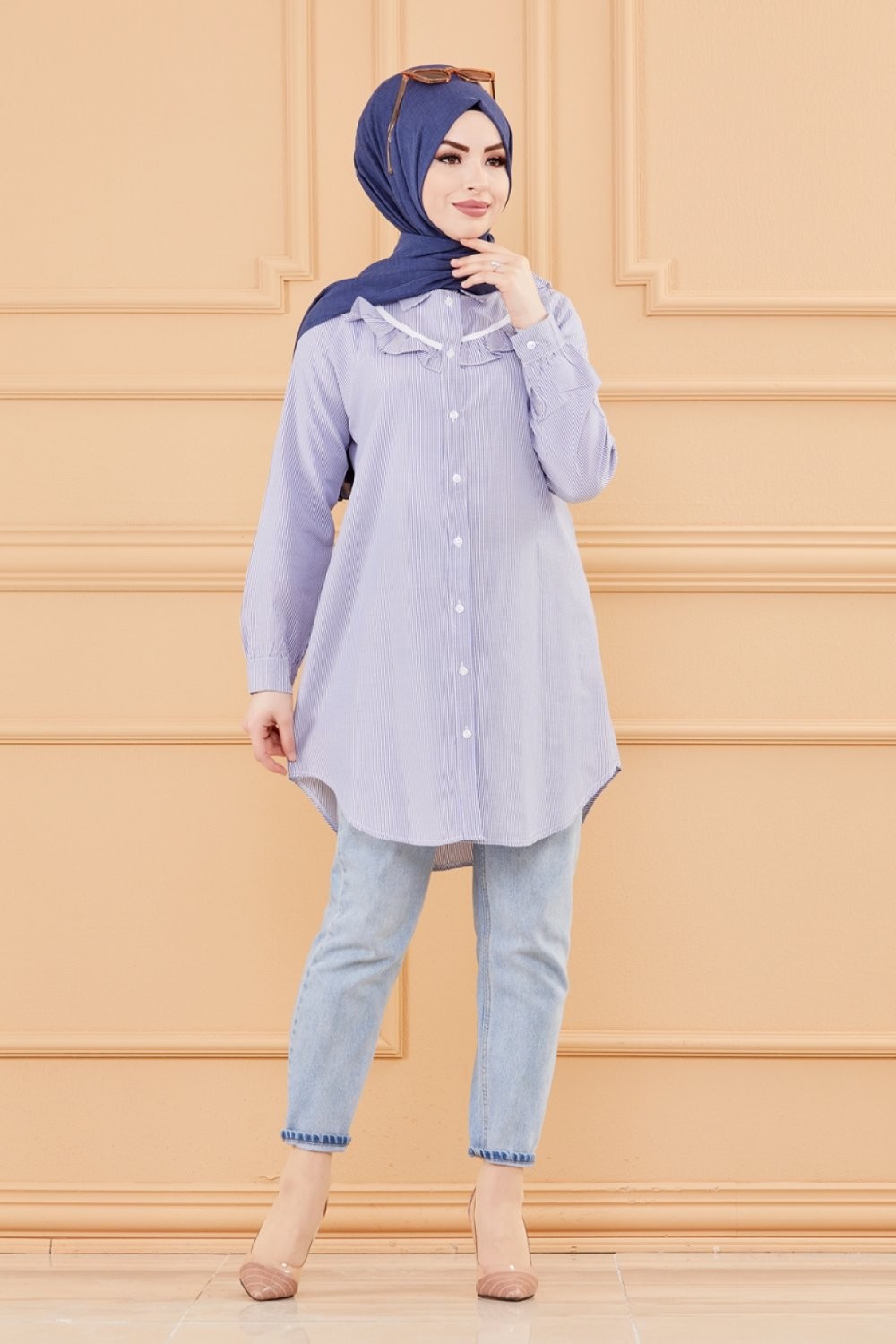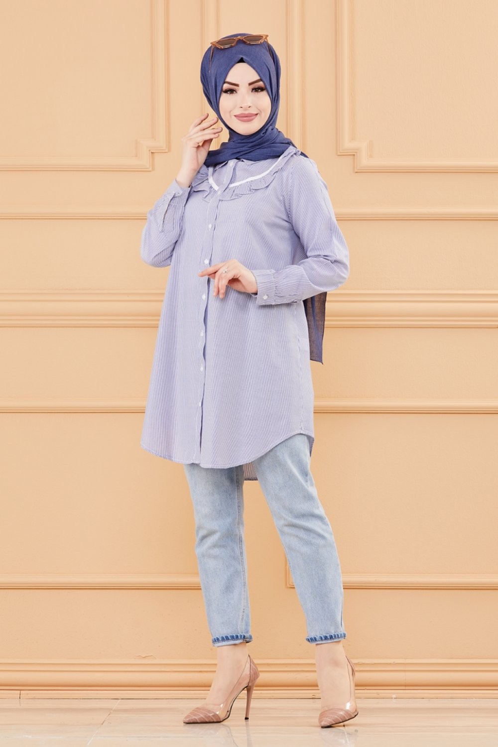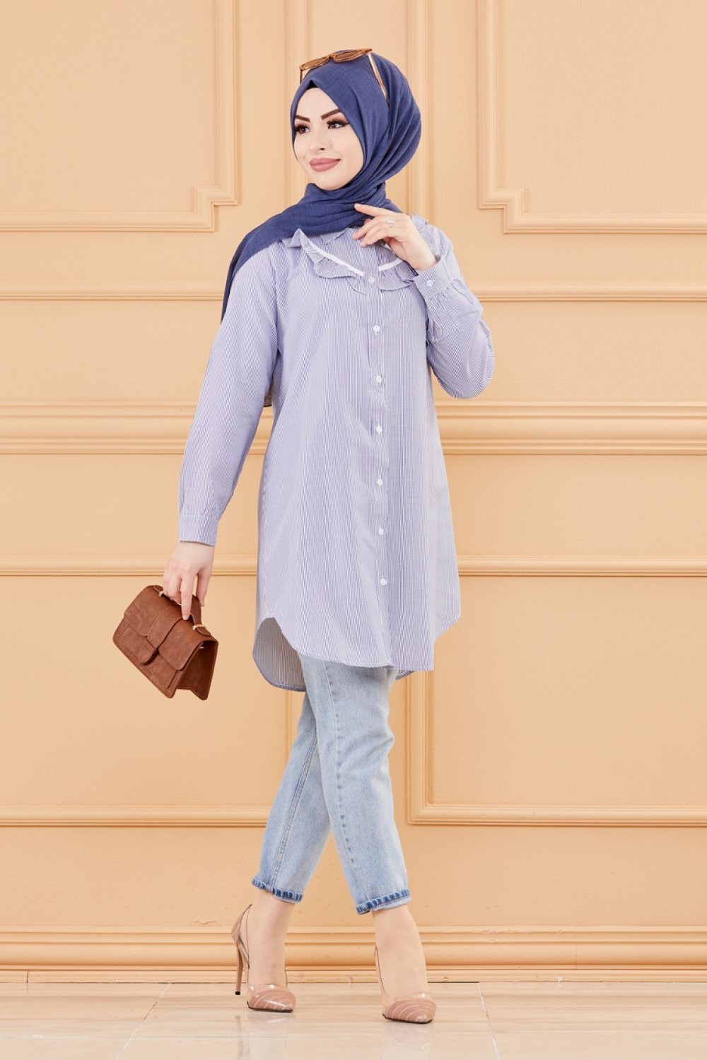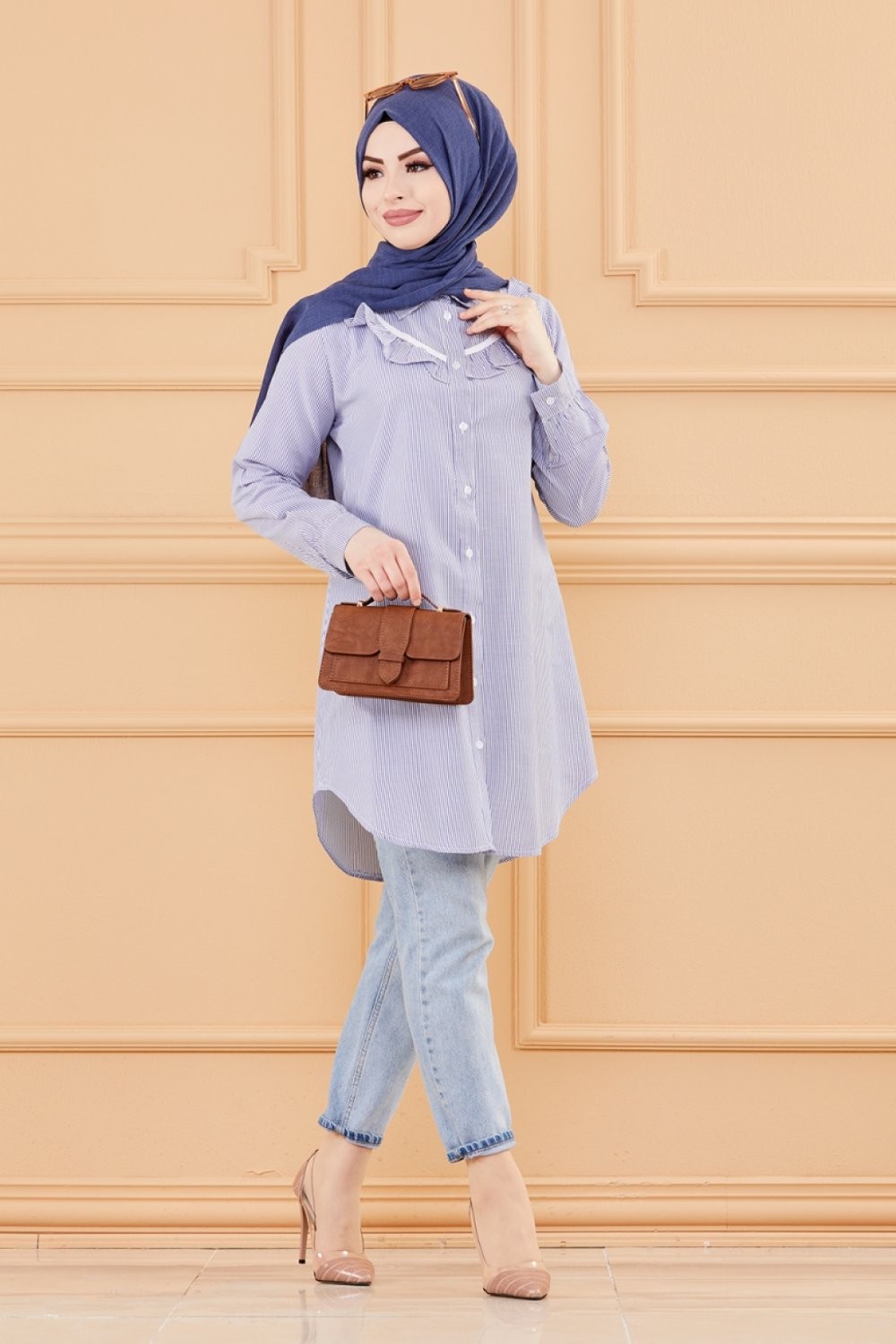 Tunique avec col foufrou (Tuniques pour femmes musulmanes style chic) - Rayures couleur bleu
