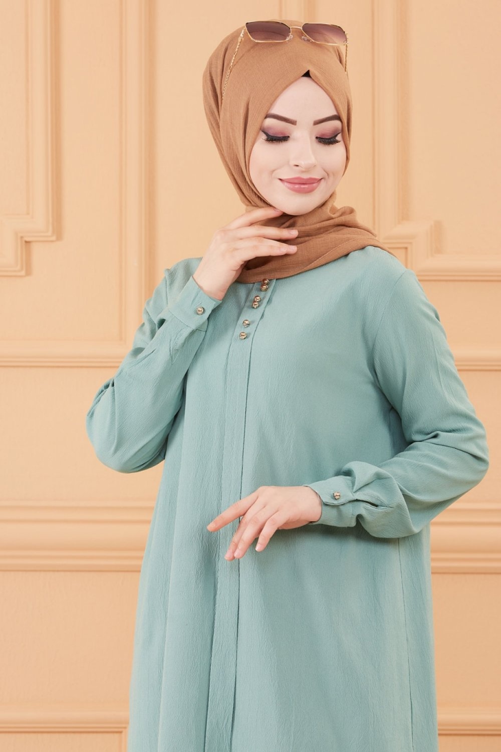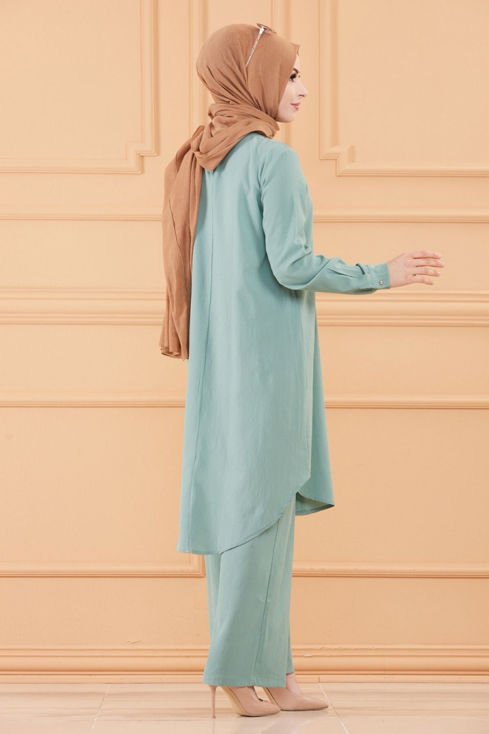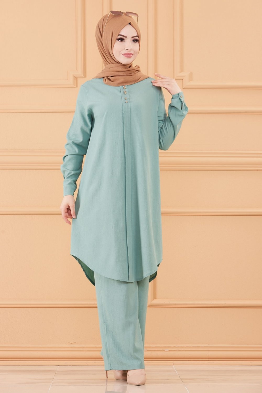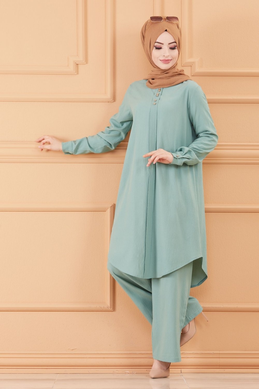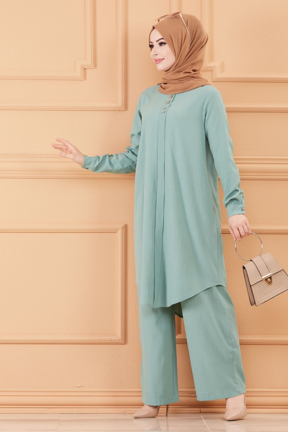 Ensemble femme deux pièces : Tunique évasée et Pantalon assorti (Tenue habillée pour hijab) - Couleur menthe - REF. 36202 (38.00 €)