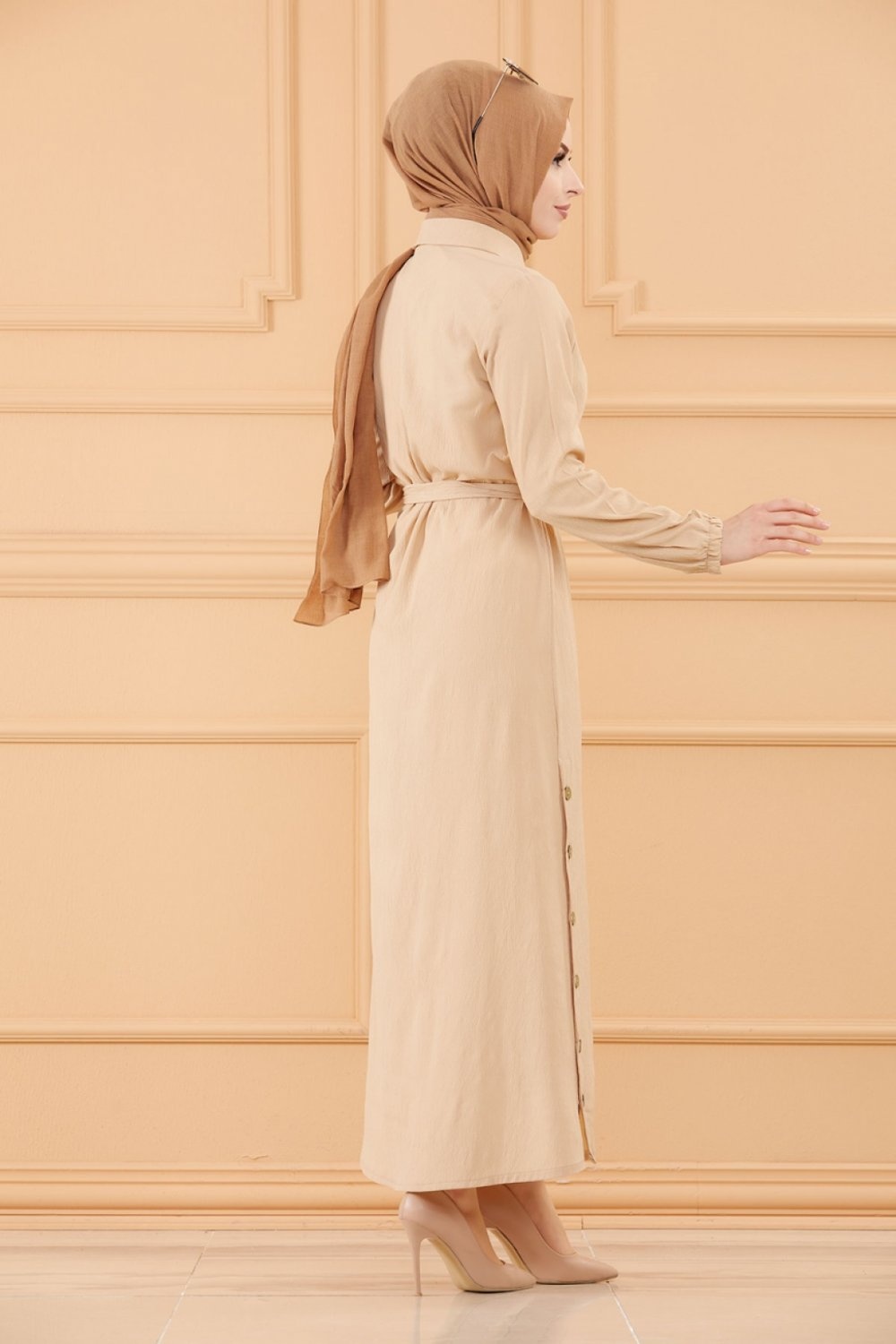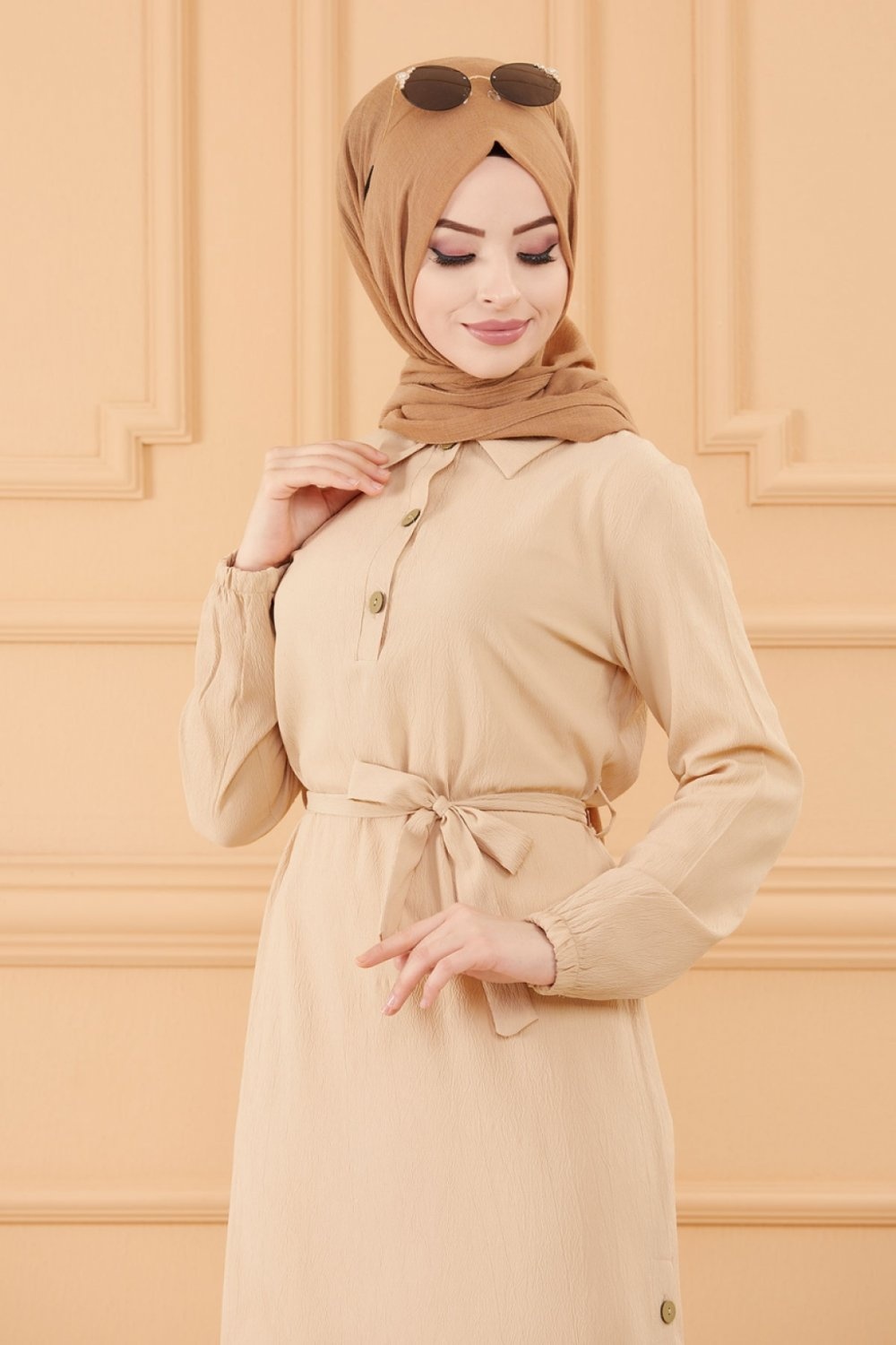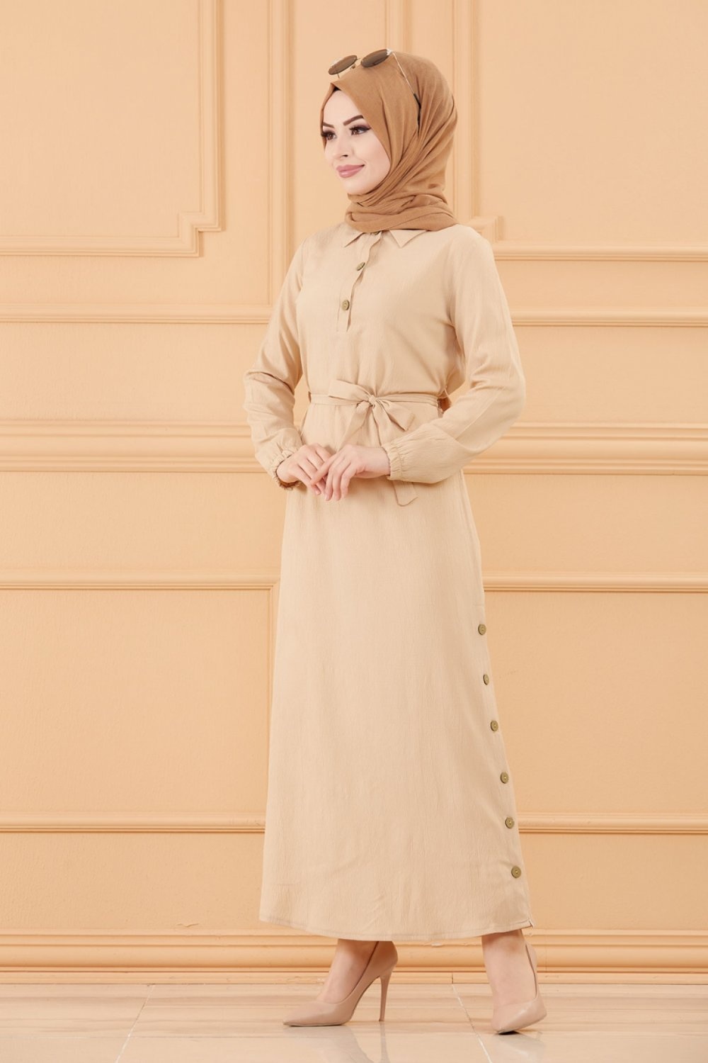 Robe longue habillée avec ceinture pour femme (Vêtement chic pour hijab) - Couleur beige clair Vetement & Accessoire