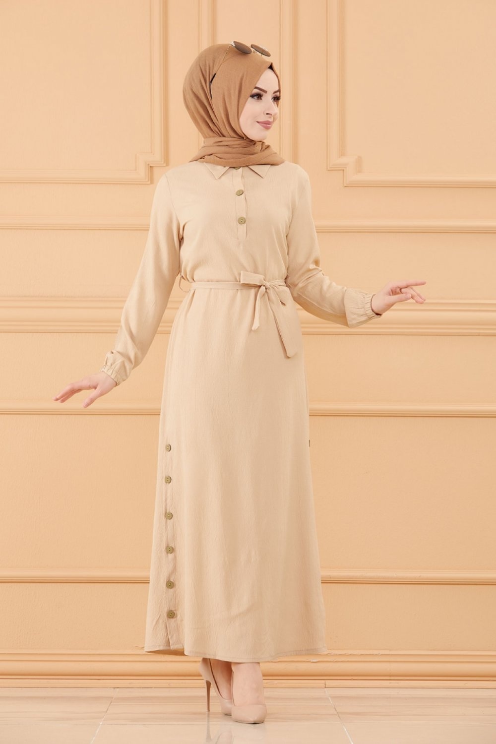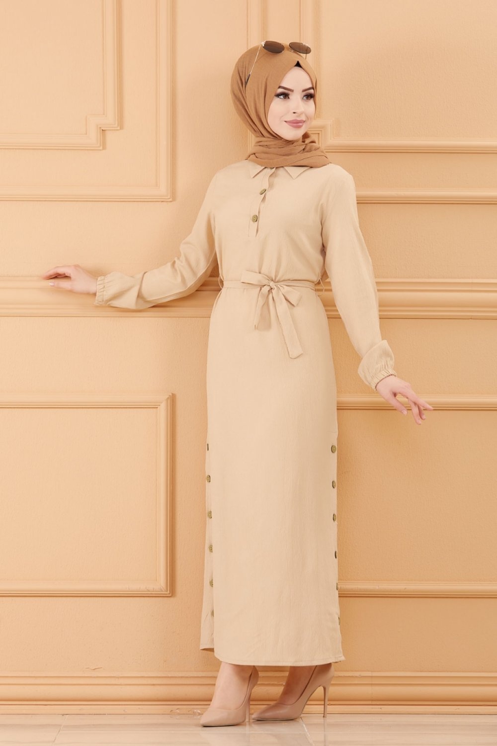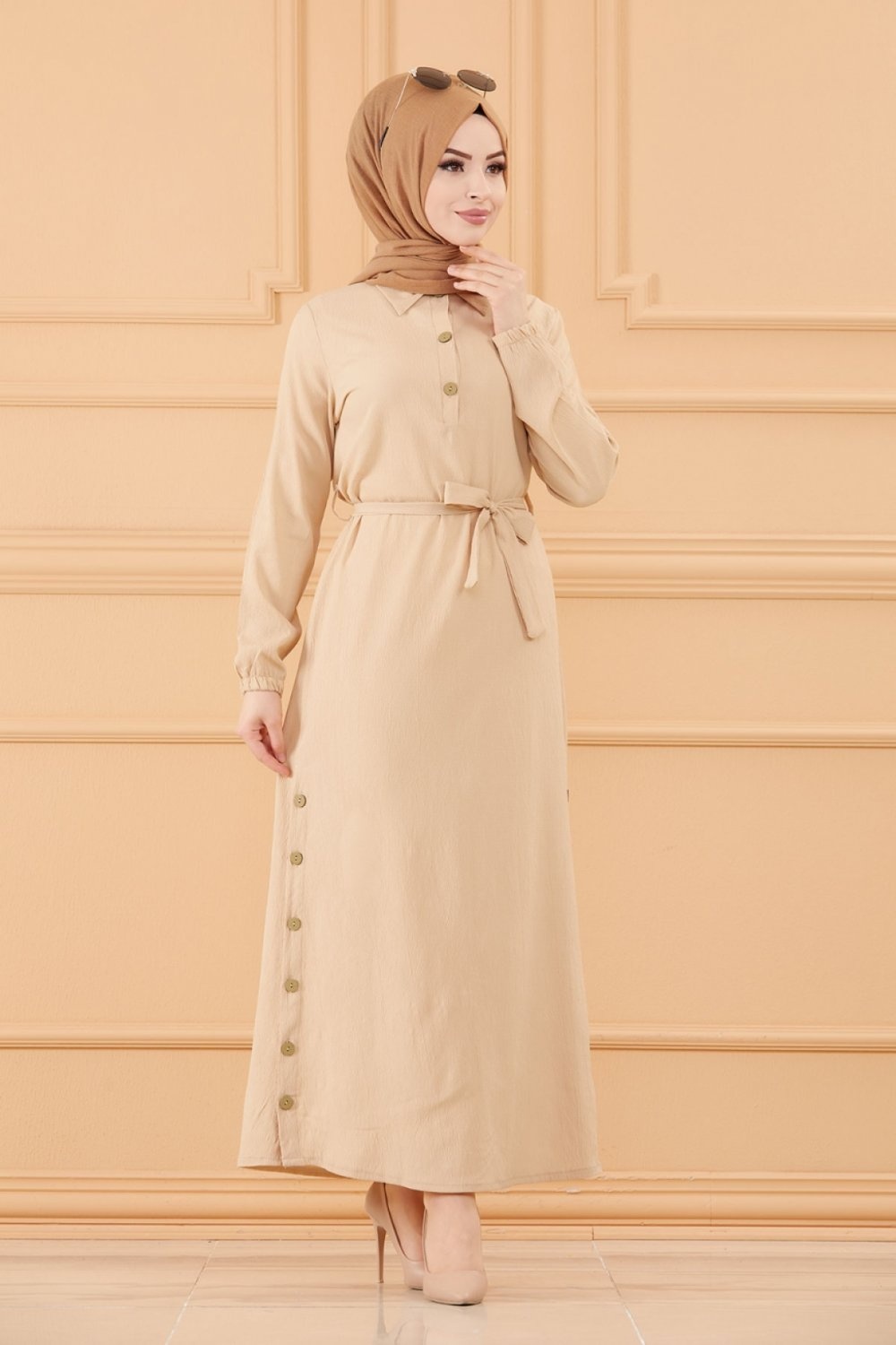 Robe longue habillée avec ceinture pour femme (Vêtement chic pour hijab) - Couleur beige clair Vetement & Accessoire