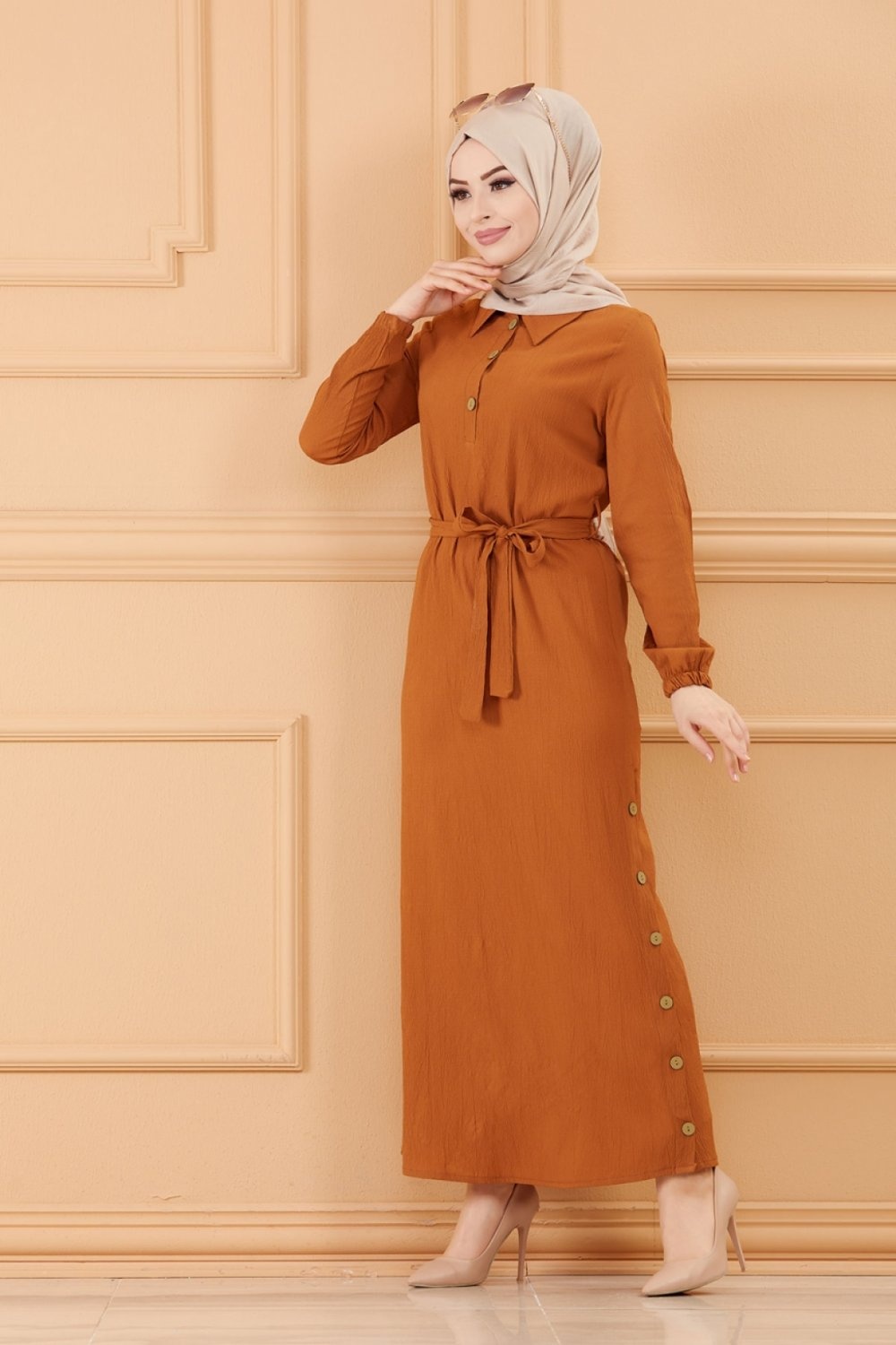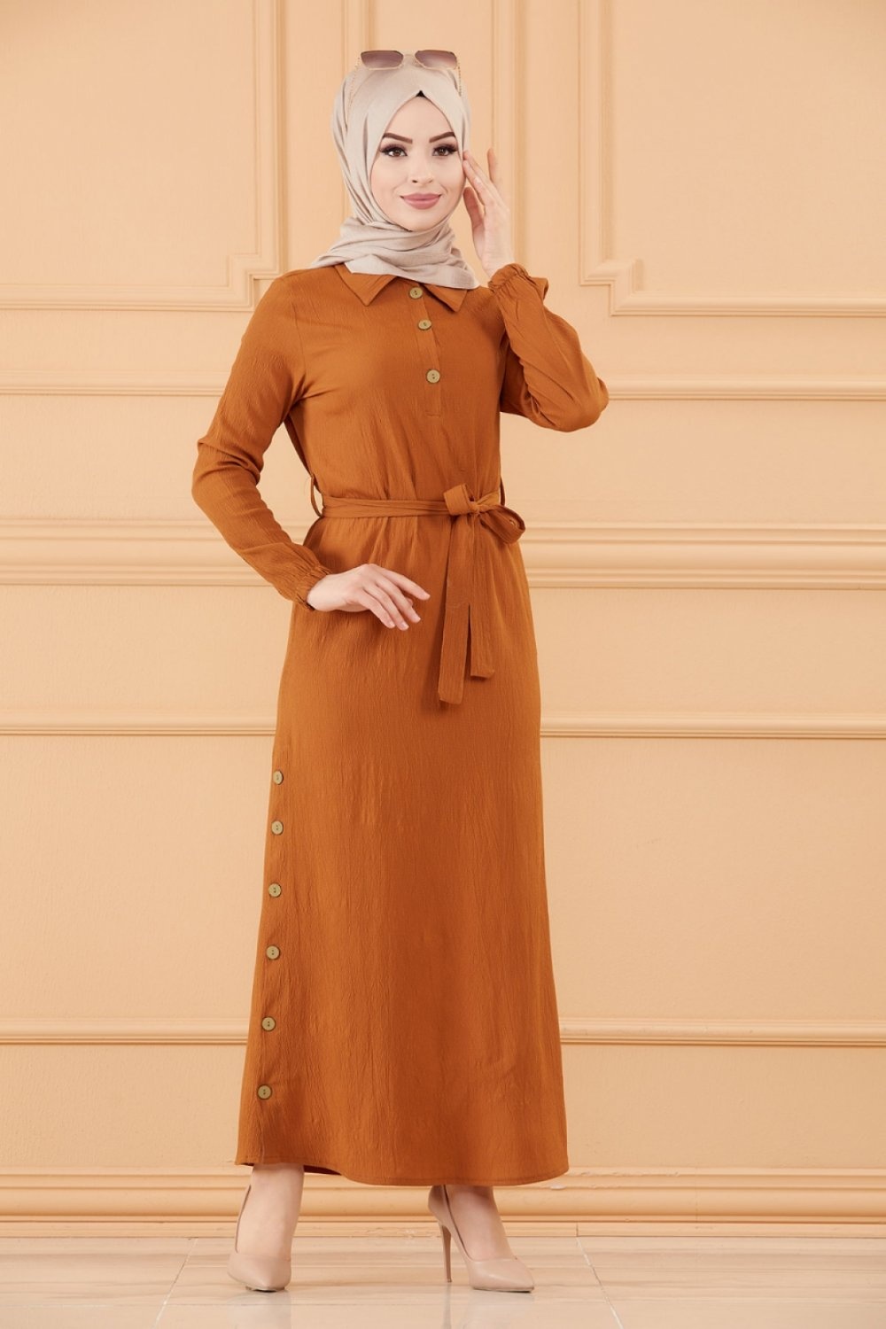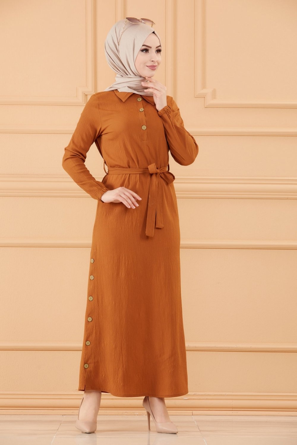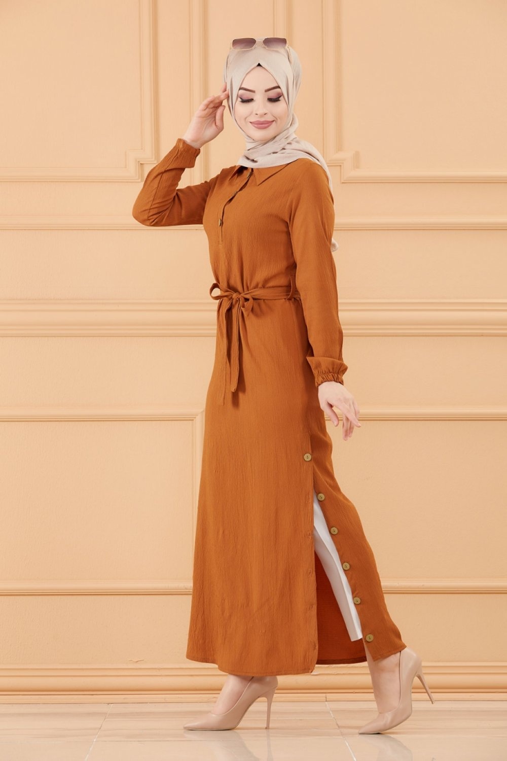 Robe longue boutonnee avec ceinture pour femmes (Vetements style habille pour hijab) - Couleur rouille