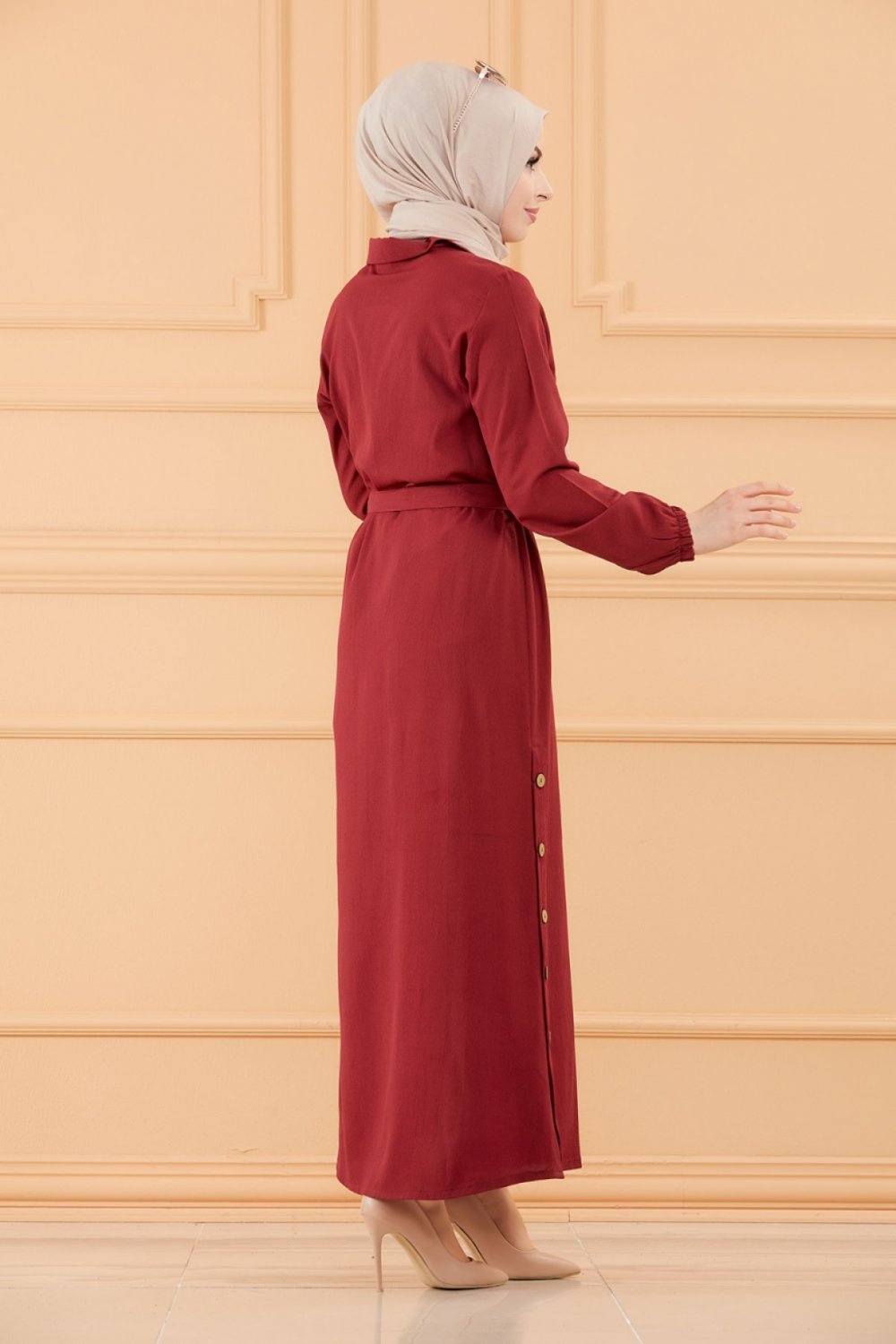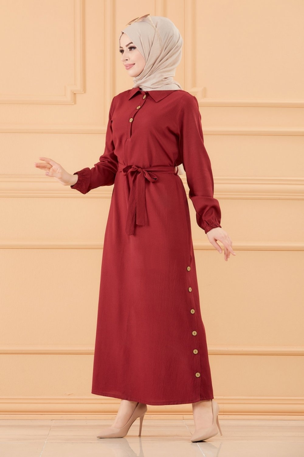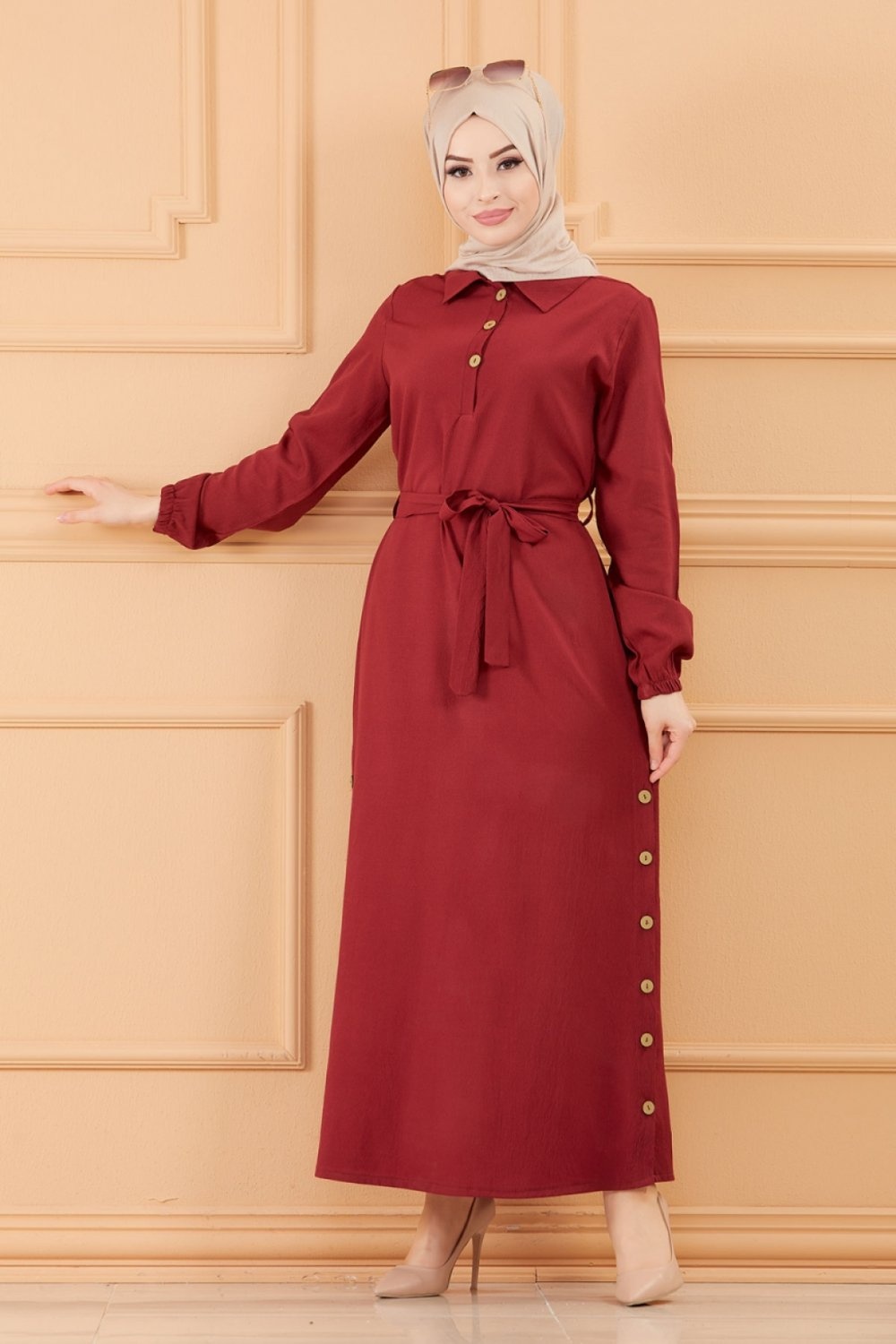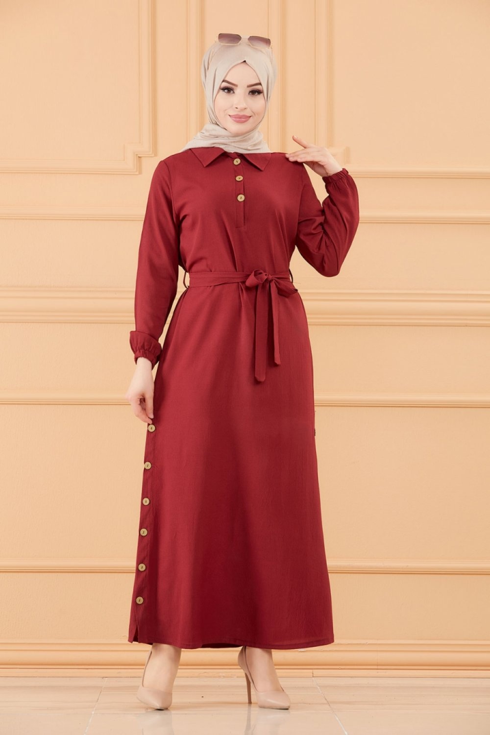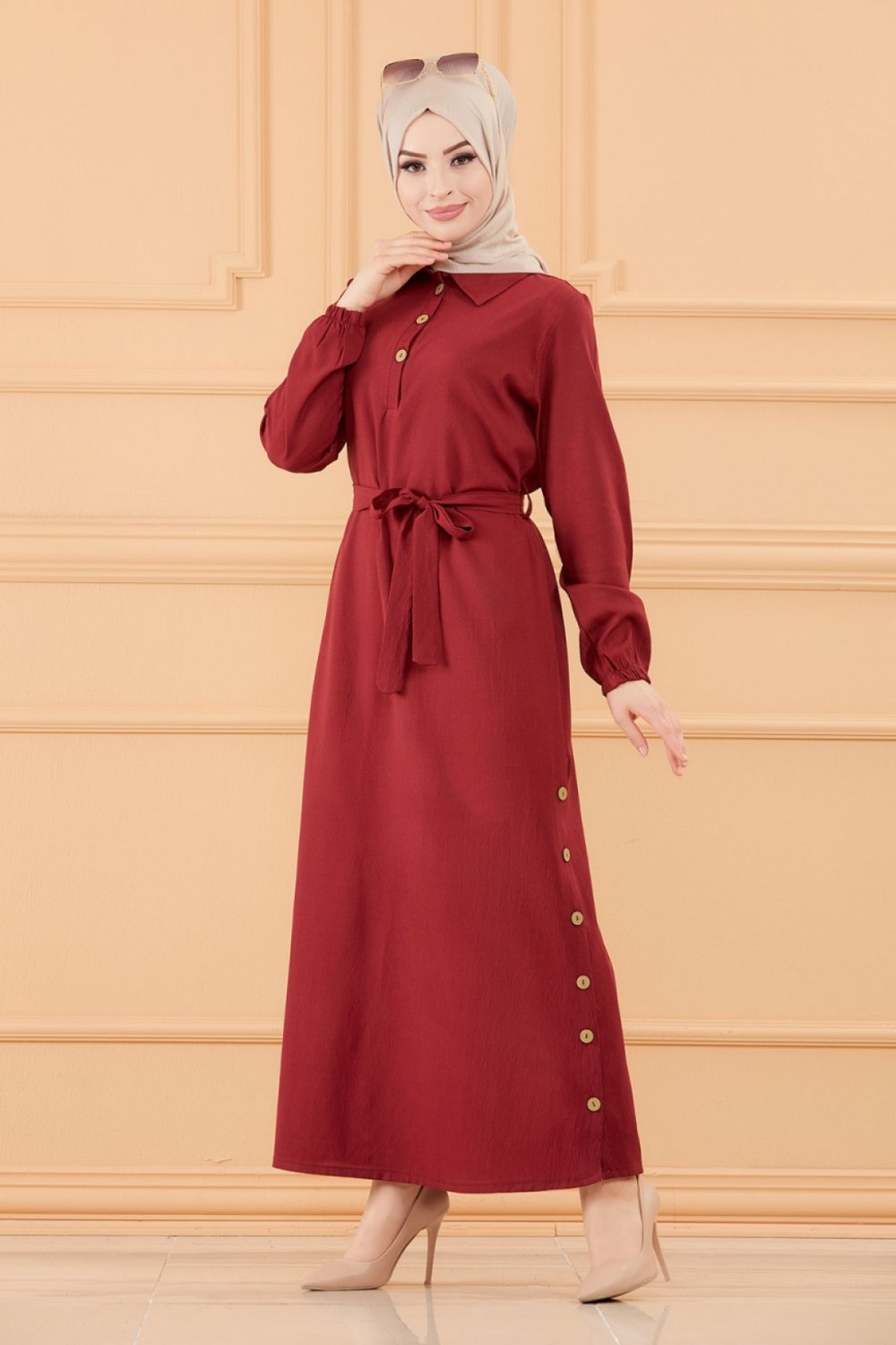 Robe longue boutonnee avec ceinture pour femme (Vetement style habille pour hijab) - Couleur bordeaux