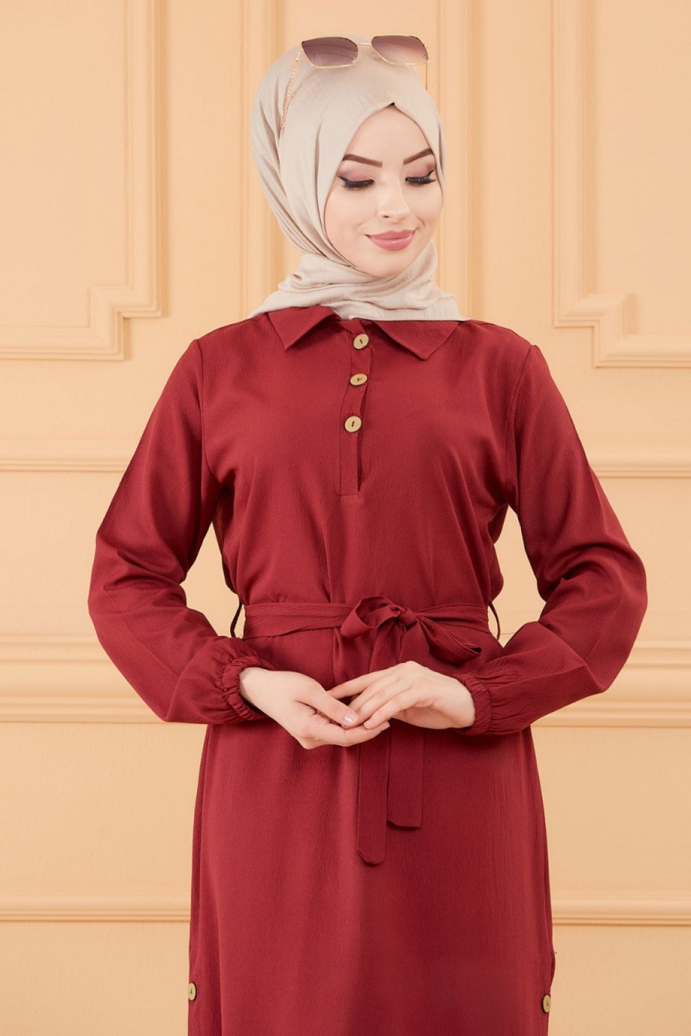 Robe longue boutonnée avec ceinture pour femme (Vêtement style habillé pour hijab) - Couleur bordeaux Vetement & Accessoire