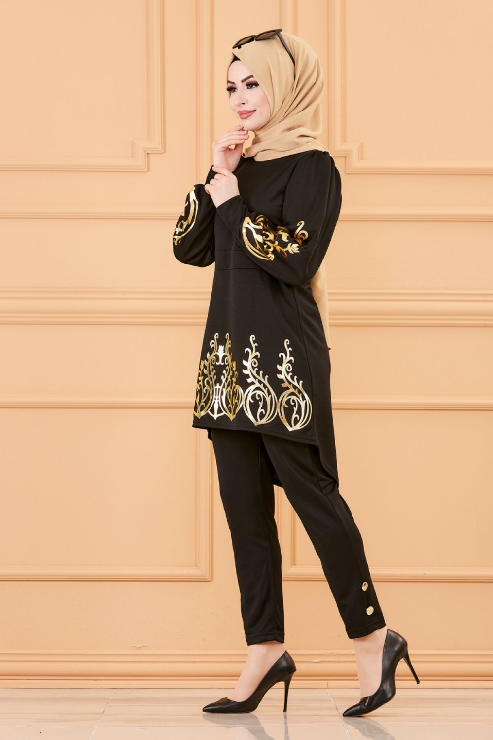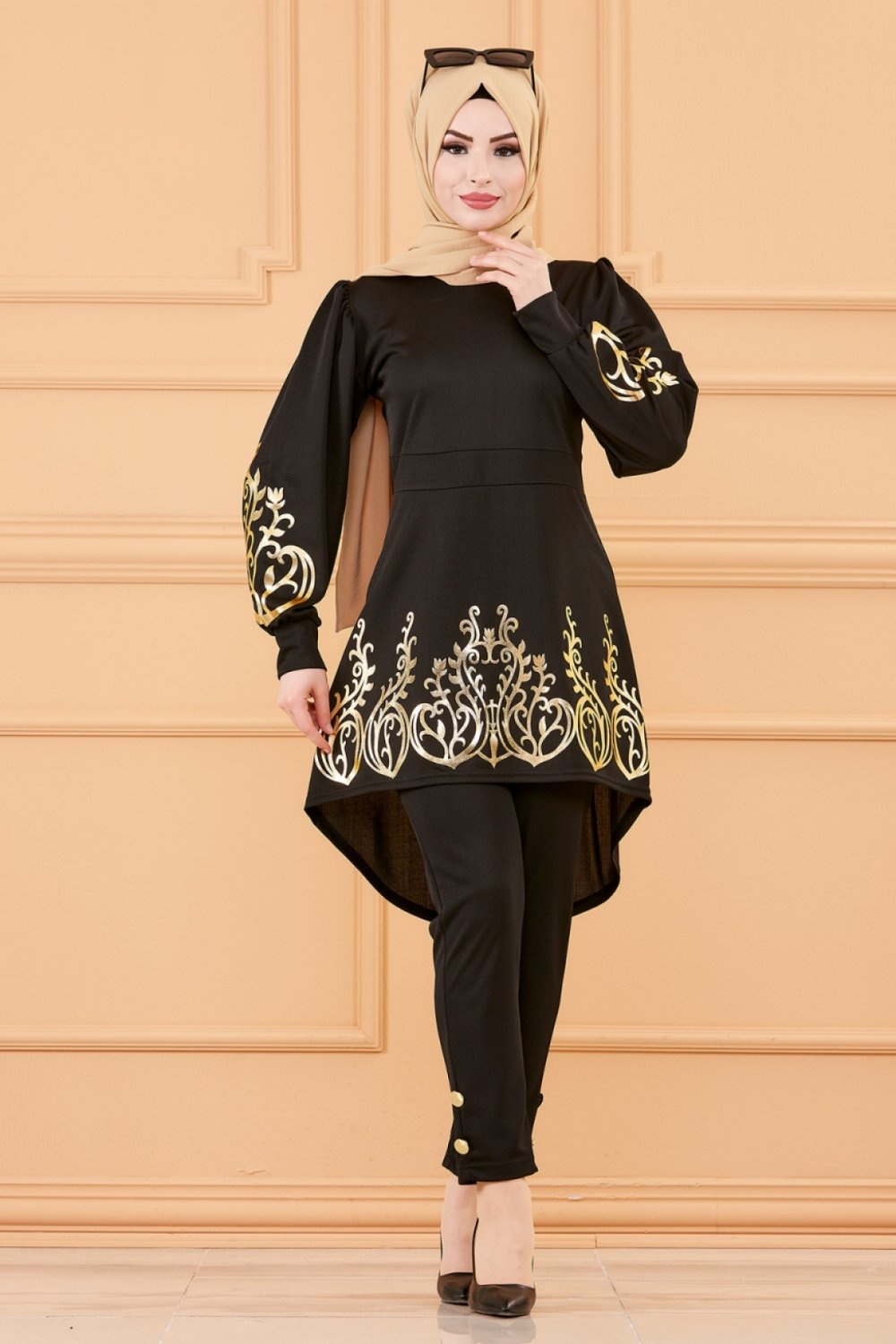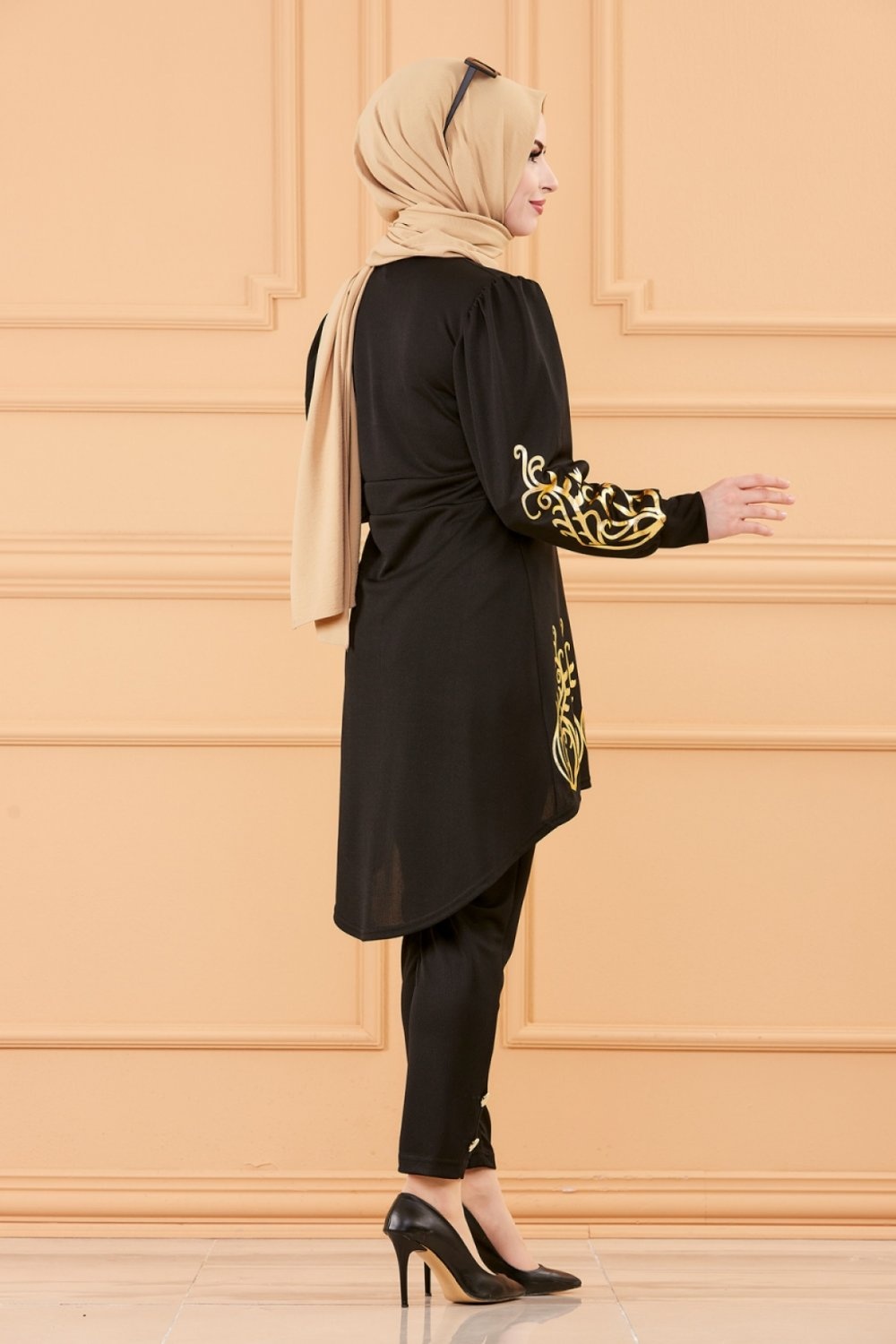 Ensemble de soirée avec arabesques dorées pour femme (Tenue hijab chic - Tunique et pantalon) - Couleur noir Vetement & Accessoire