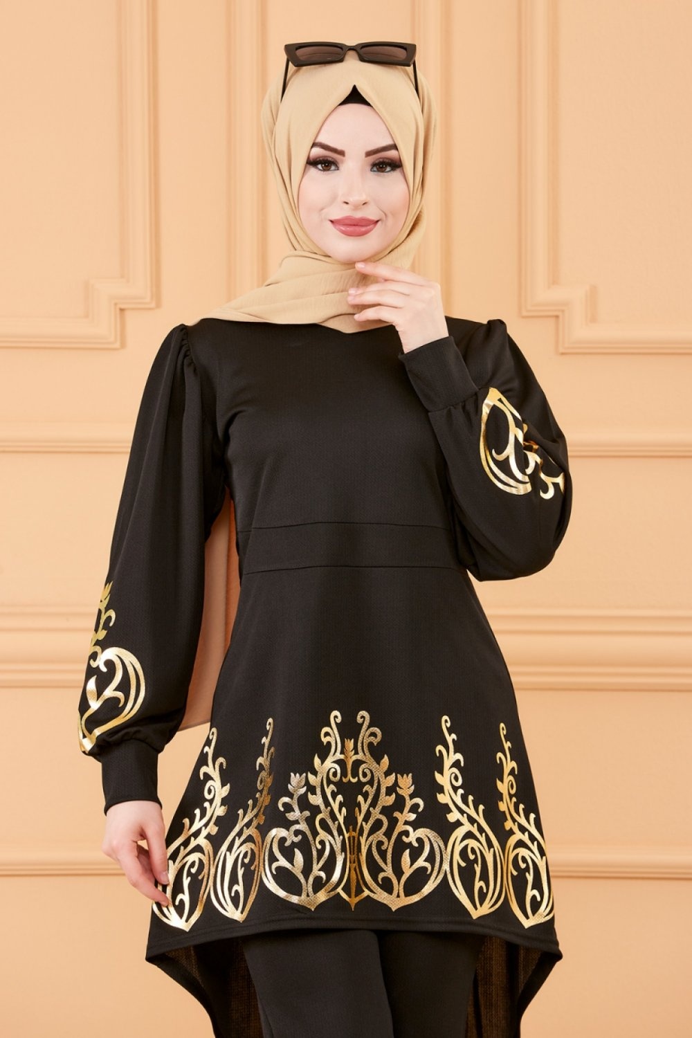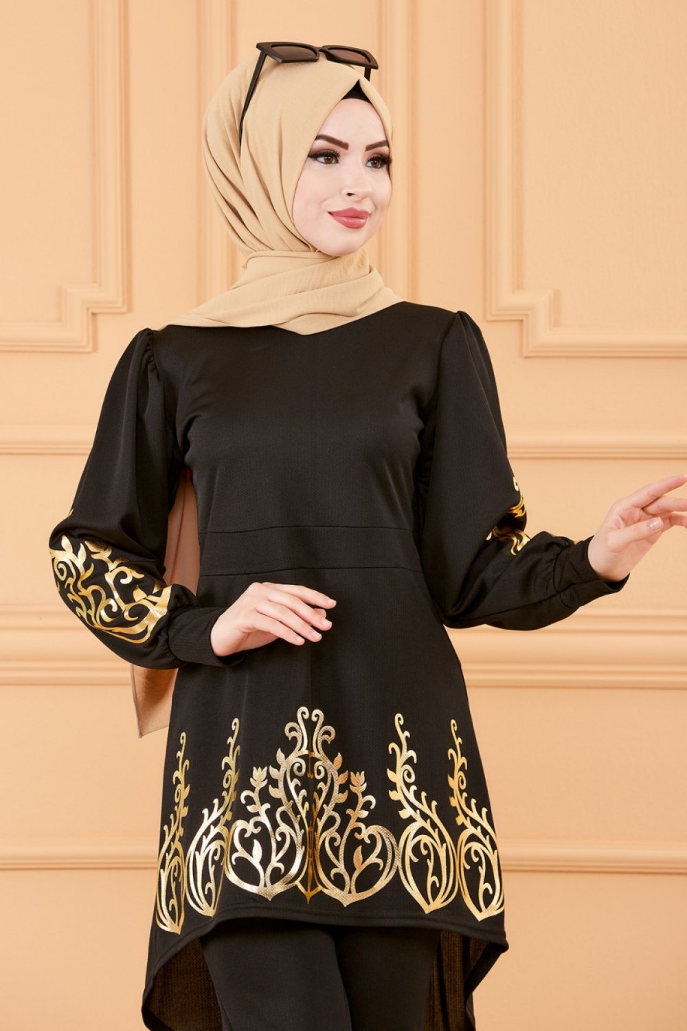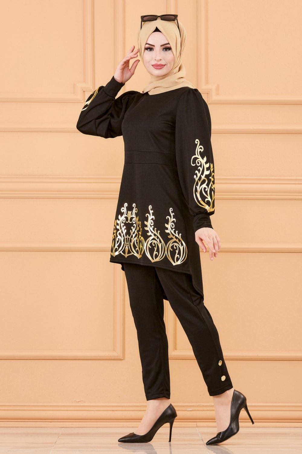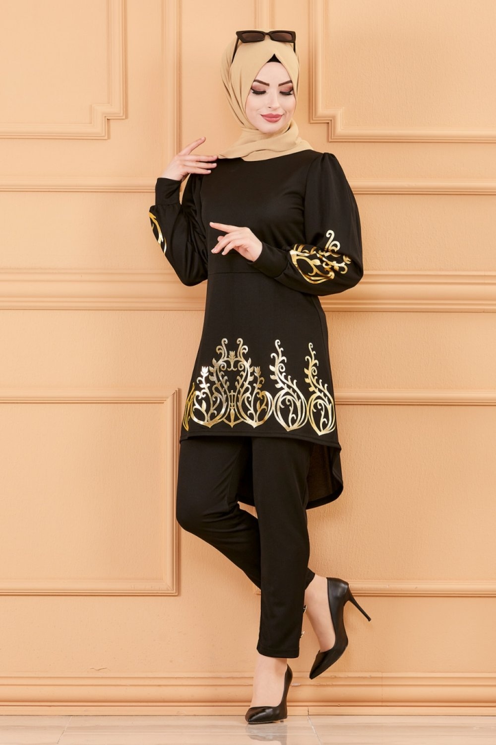 Ensemble de soirée avec arabesques dorées pour femme (Tenue hijab chic - Tunique et pantalon) - Couleur noir Vetement & Accessoire