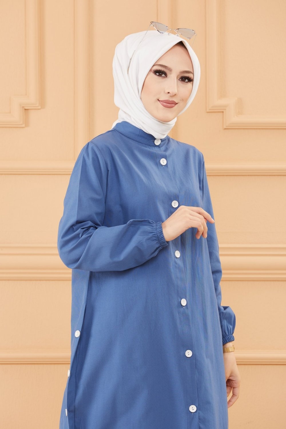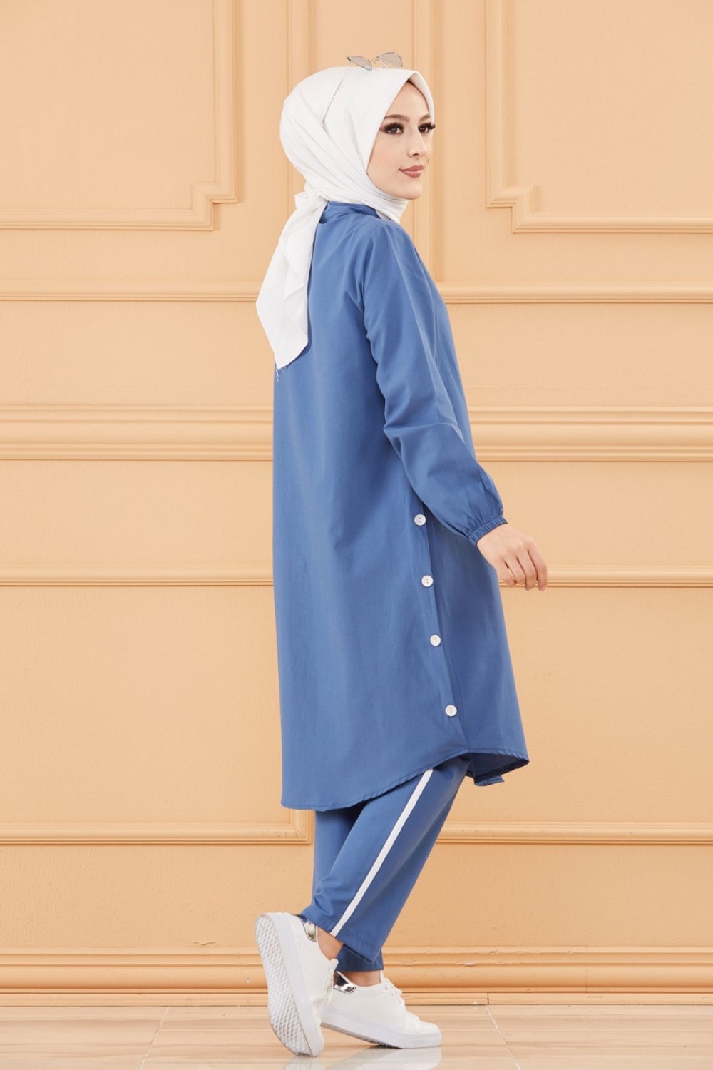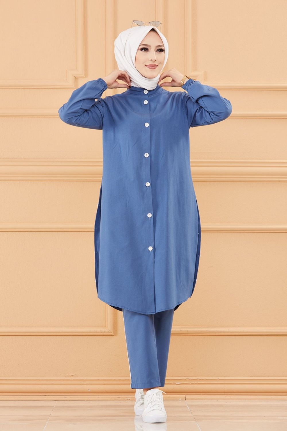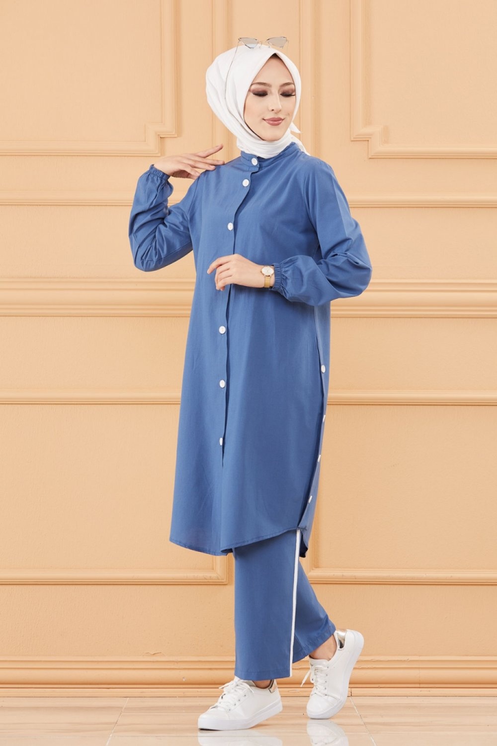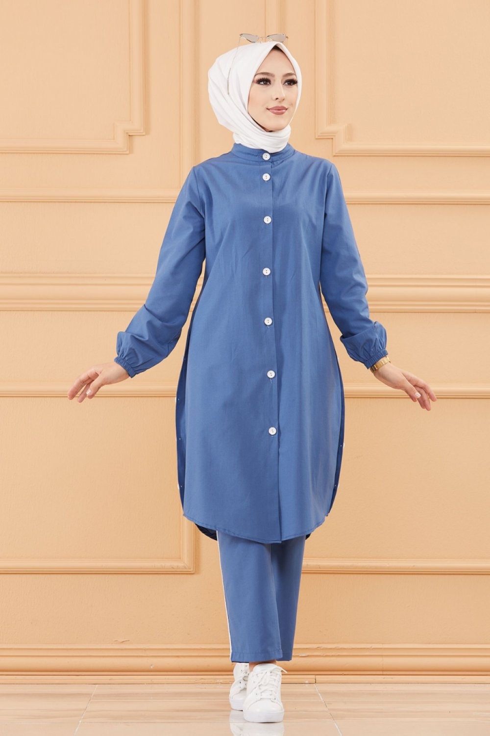 Ensemble casual moderne : Tunique boutonnée et son pantalon (Vêtements Hijeb ample pour femmes) - Couleur bleu indigo Vetement & Accessoire
