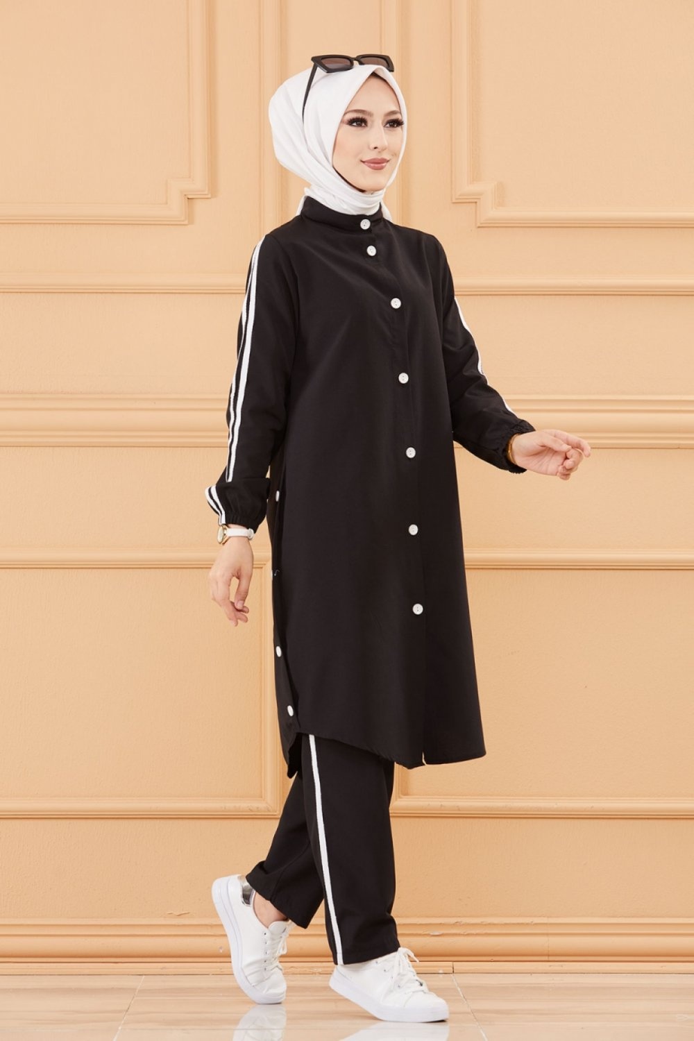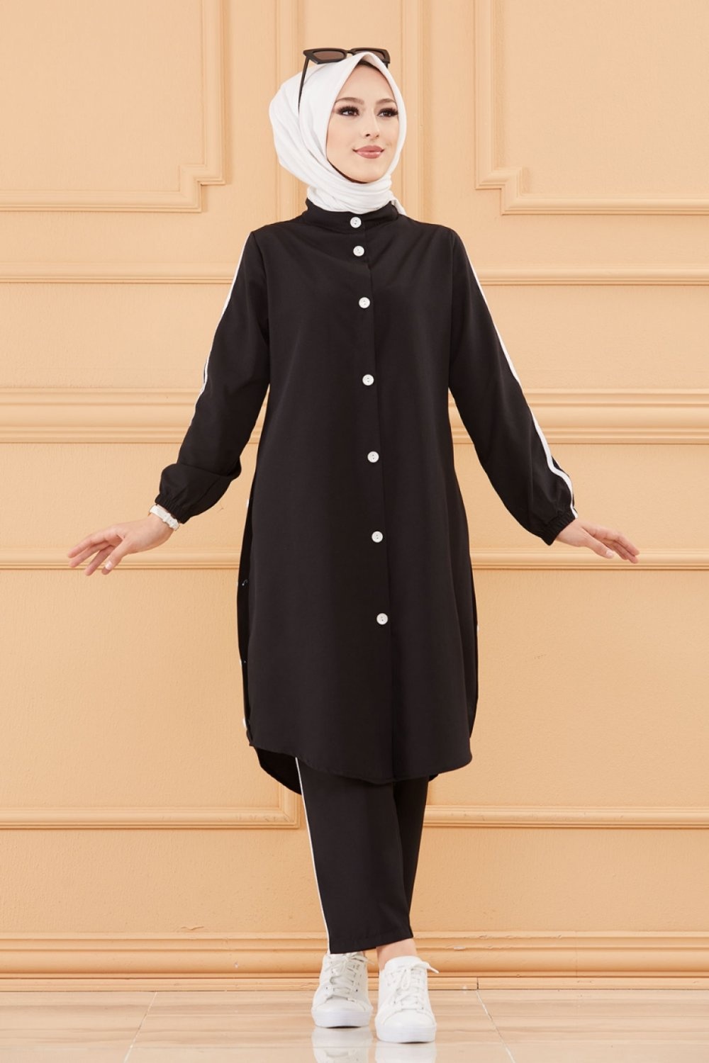 Ensemble casual moderne noir : Tunique boutonnée - chemise longue et son pantalon - Vêtement Hijab ample pour femme Vetement & Accessoire