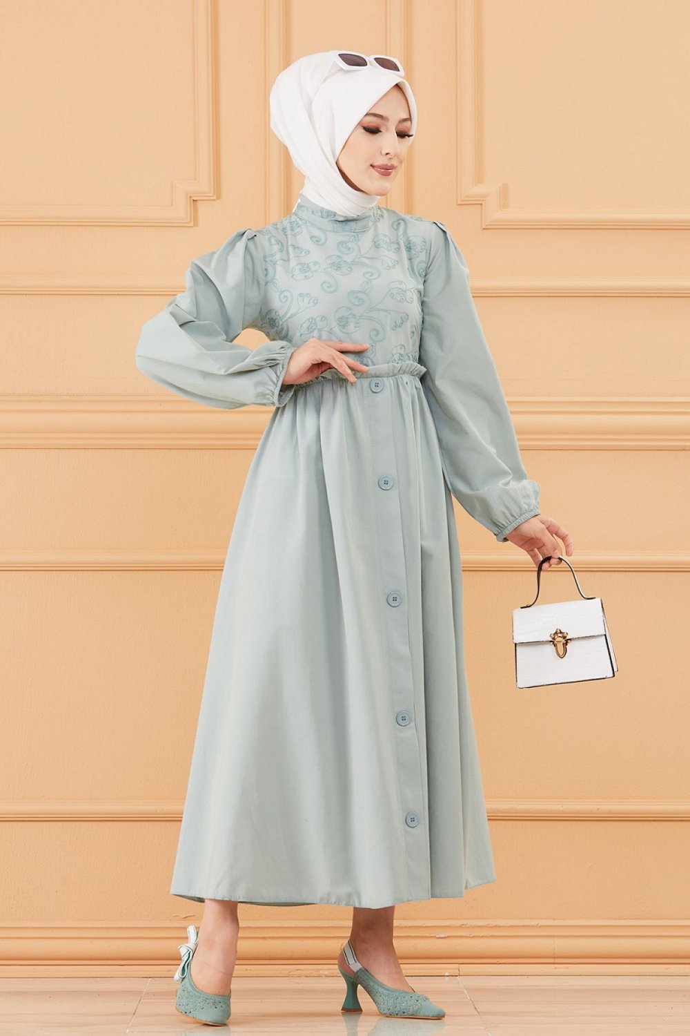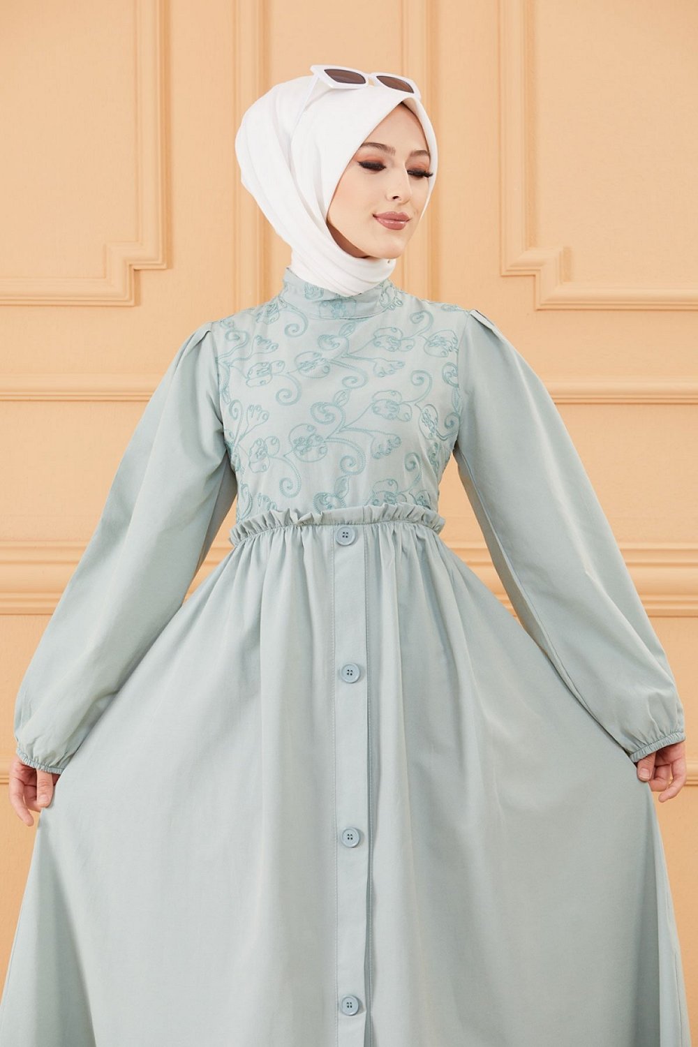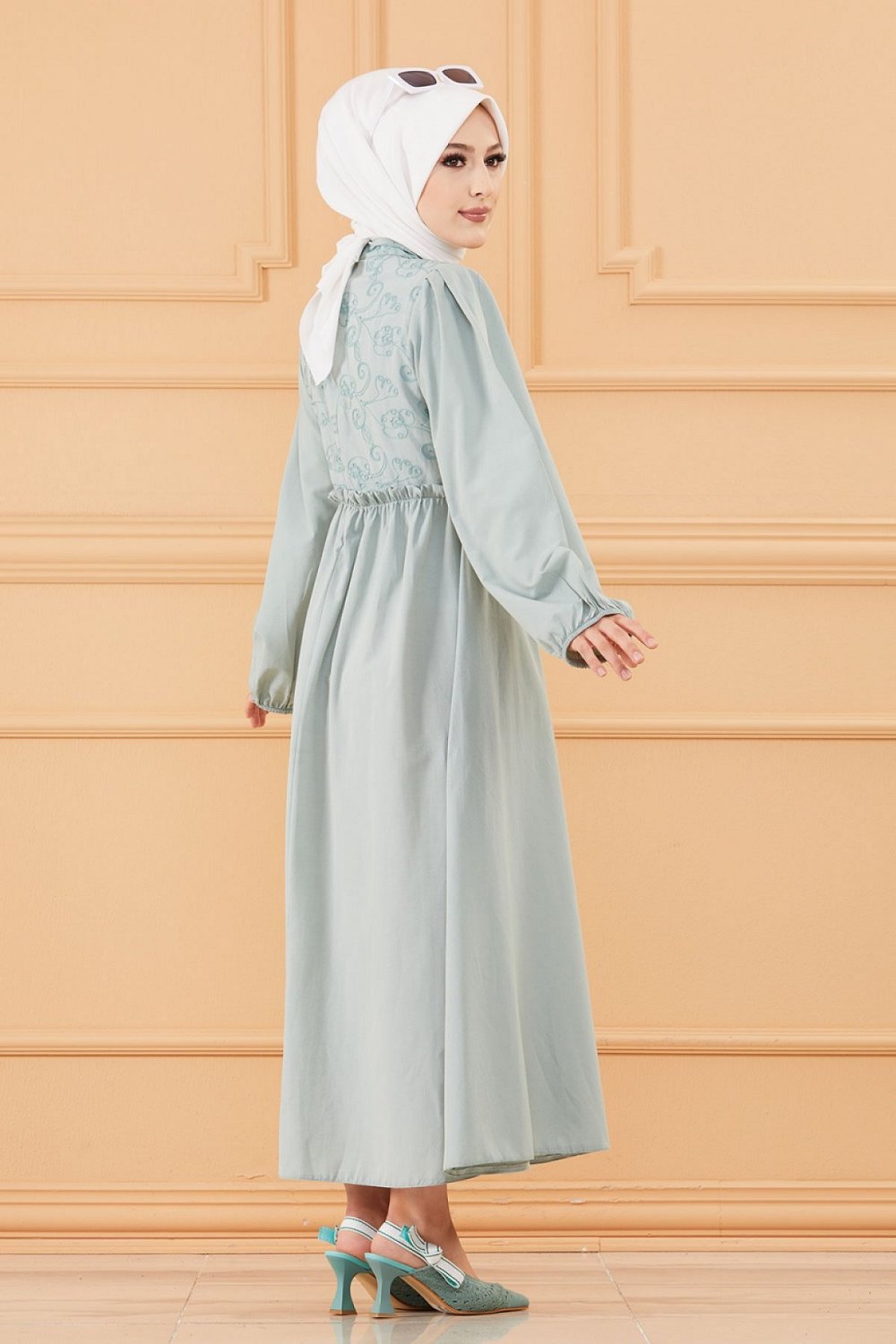 Robe ample et évasée avec broderie discrète Vêtement style habillé pour femme voilée) - Couleur menthe Vetement & Accessoire