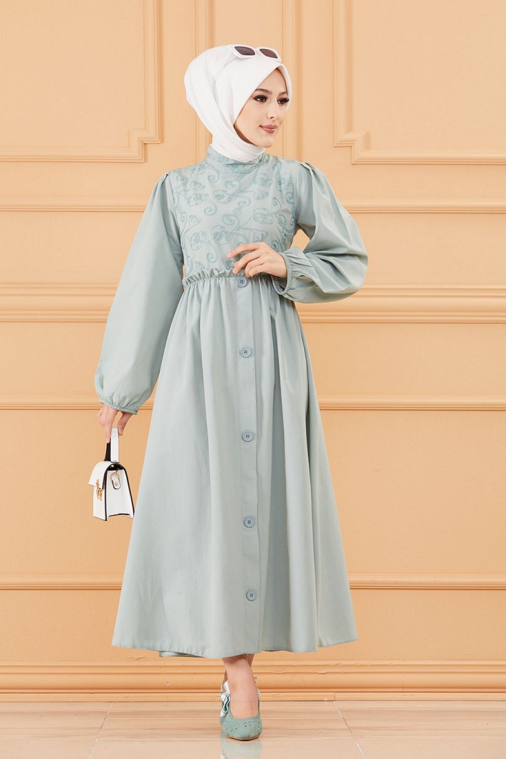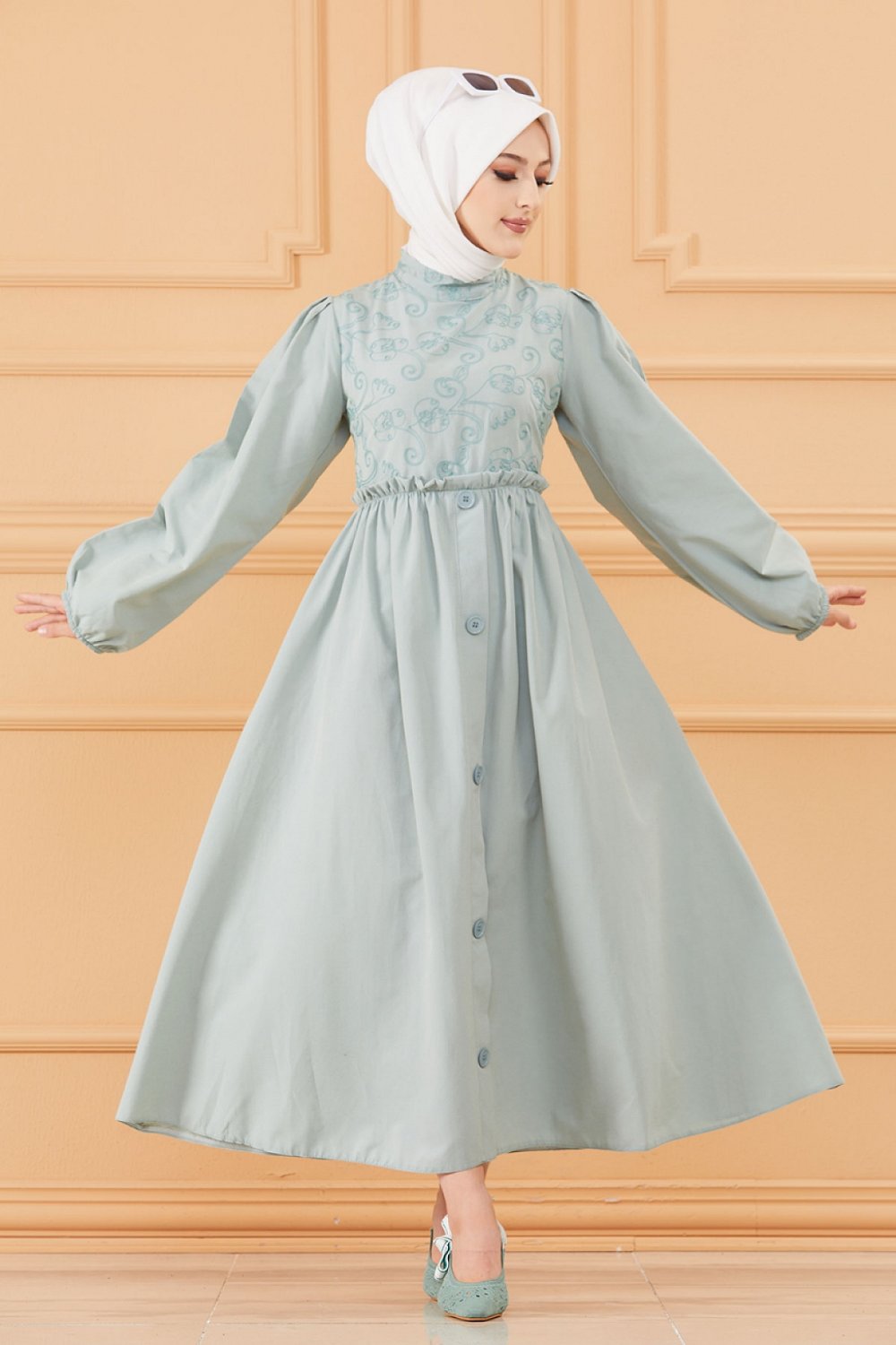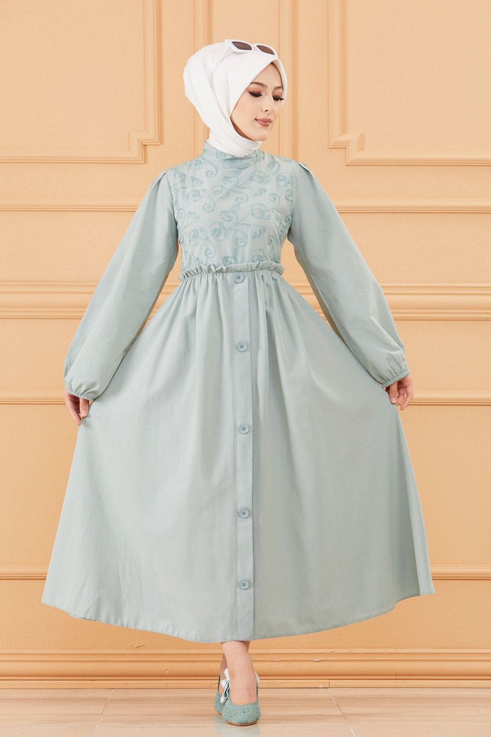 Robe ample et évasée avec broderie discrète Vêtement style habillé pour femme voilée) - Couleur menthe Vetement & Accessoire