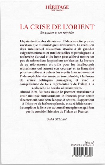 Ahmed Riza fut sans doute le premier musulman à avoir maîtrisé suffisamment le français pour écrire directement dans cette langue. A ce titre, il appartient à l’histoire de la francophonie, et sa réédition sert à compléter la liste des auteurs francophones qui font partie aussi de l’histoire de l’Islam en France.