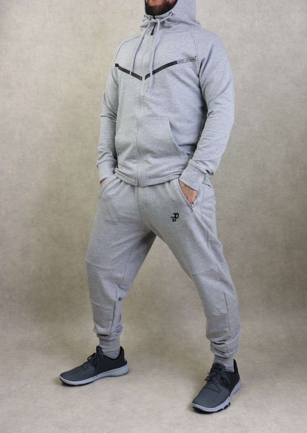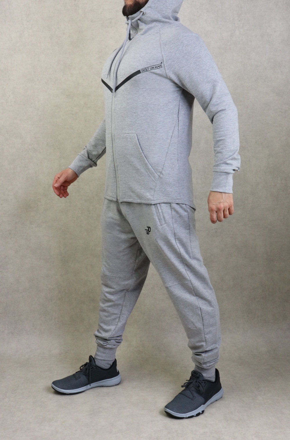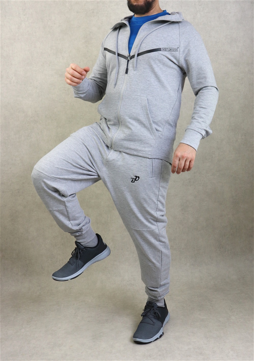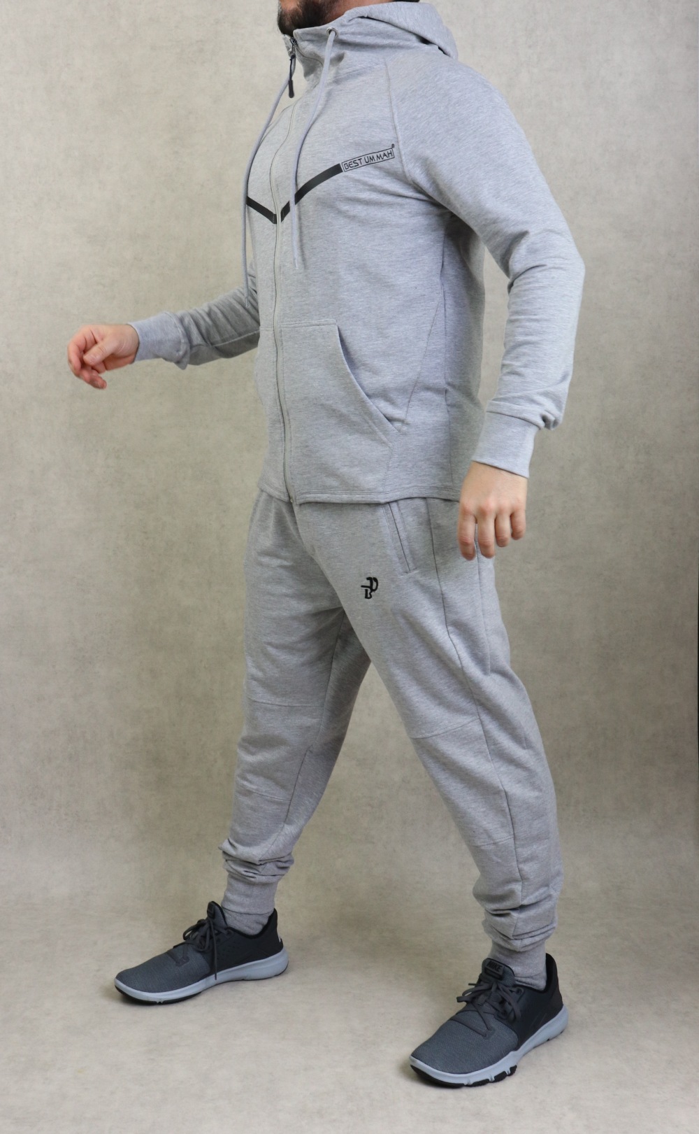 Veste couleur gris clair chiné, plus longue à l'arrière qu'à l'avant avec bandes noire et inscription BEST UMMAH. Tissu léger coton de qualité et doux. Deux poches sur les côtés. Capuche doublée avec cordon.