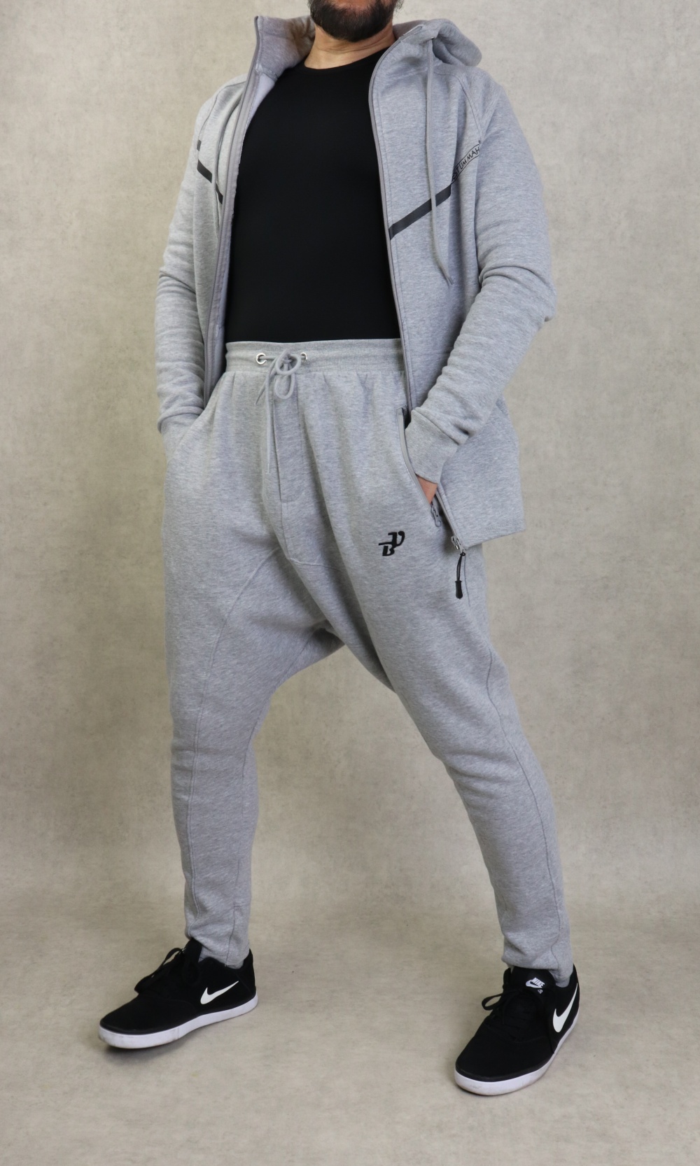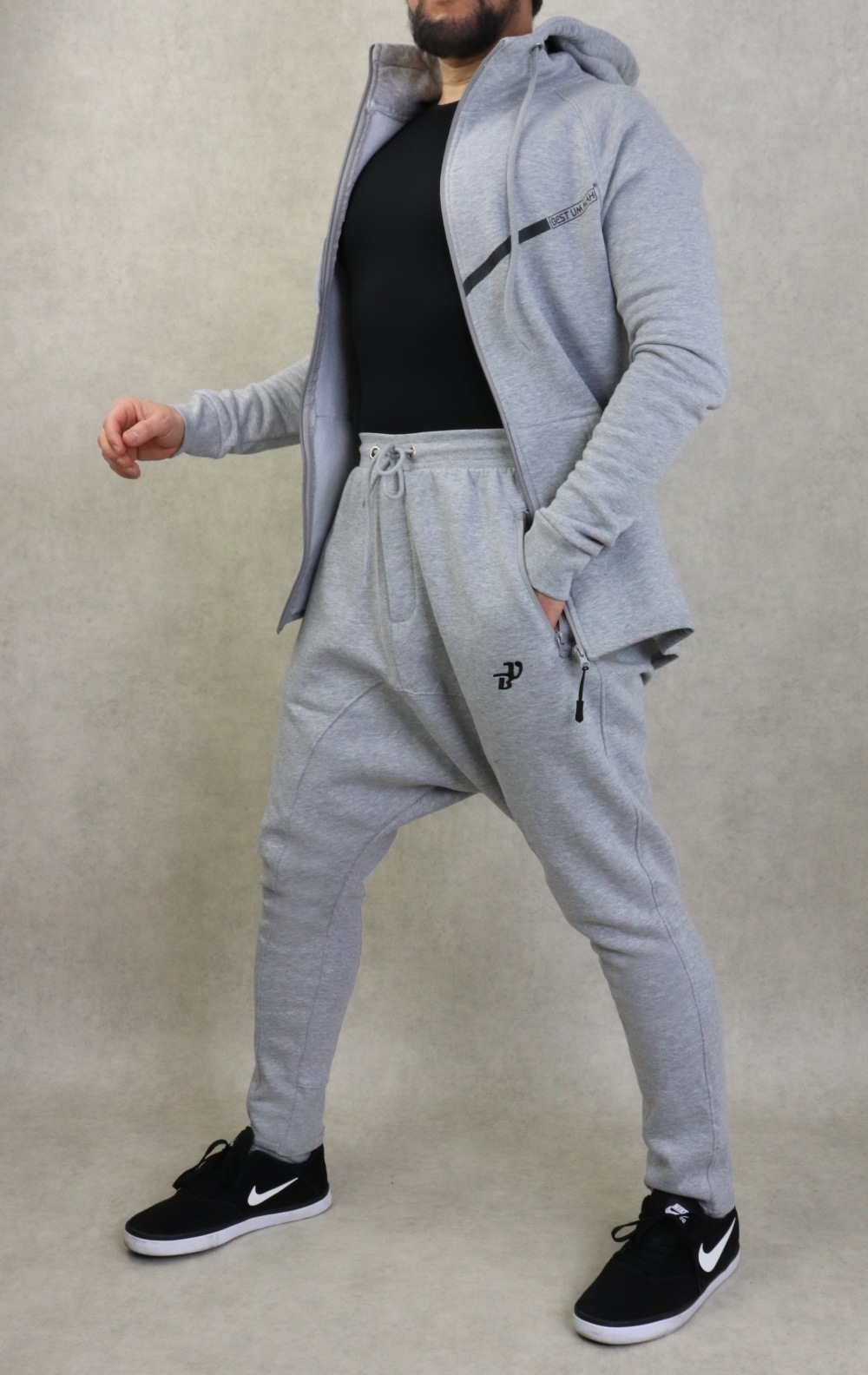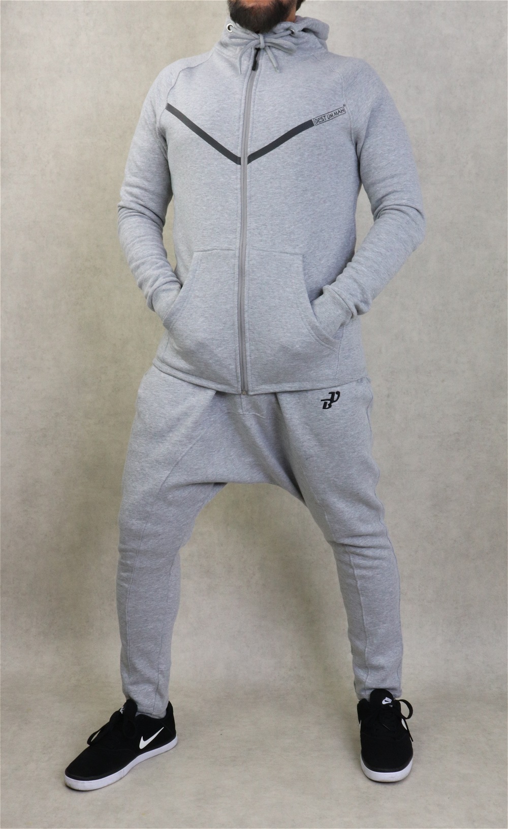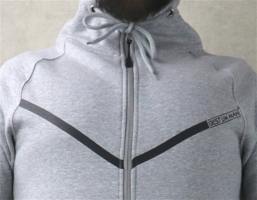 Veste couleur gris clair chiné, plus longue à l'arrière qu'à l'avant avec bandes noire et inscription BEST UMMAH. Tissu épais en coton molletonné de qualité et doux. Deux poches sur les côtés. Capuche doublée avec cordon.
